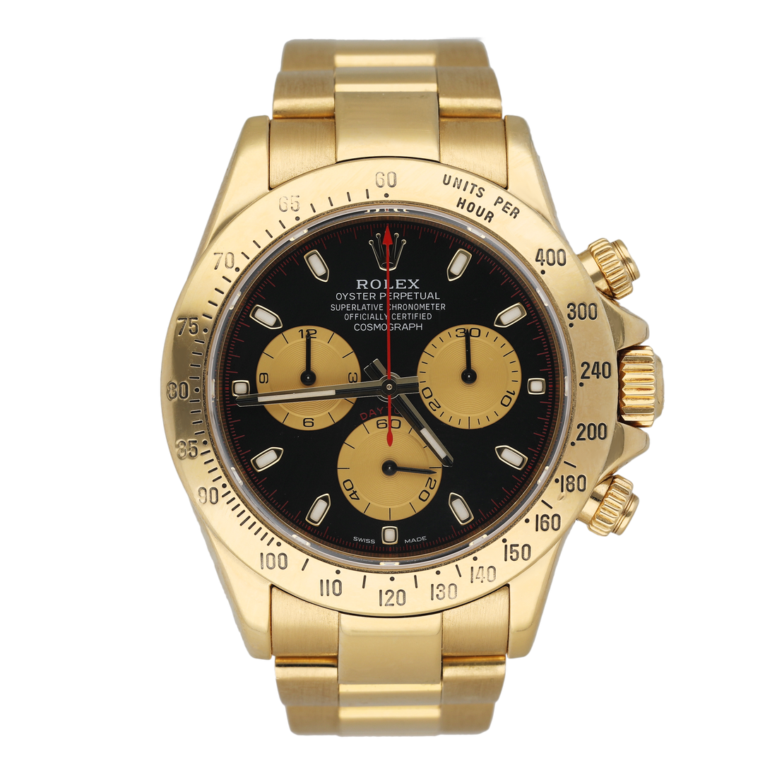 Rolex Oyster Perpetual Daytona 116528 Mens Watch. 40mm 18K yellow gold case. 18K yellow gold bezel. Black dial with gold hands and index hour marker. Three Champagne sub-dials: small second, 30 minute and 12 hour register. 18K yellow gold Oyster bracelet with fold over clasp with safety. Will fit up to 7-Inch wrist. Sapphire crystal. 18K yellow gold case back. Automatic self winding movement.