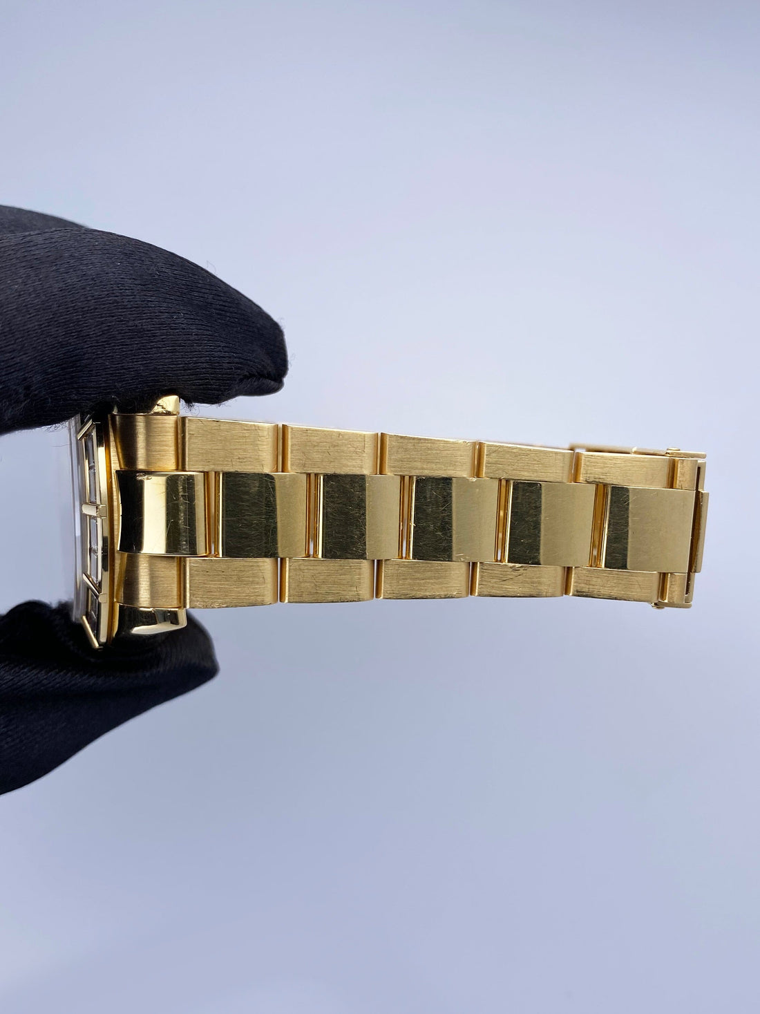 Rolex Daytona 116568 Mens Watch. 40mm 18K yellow gold case. 18K yellow gold bezel with factory diamond set. Mother of pearl dial with gold hands and Roman numeral hour markers. Minute markers on the outer dial. Three sub-dials. Small seconds hand at 6 o'clock. 30-minute counter at 3 o'clock. 12-hour counter at 9 o'clock. 18K yellow gold Oyster bracelet with fold over clasp with safety. Will fit up to a 7-inch wrist. Sapphire crystal. 18K yellow gold case back. Automatic self-winding chronometer movement.