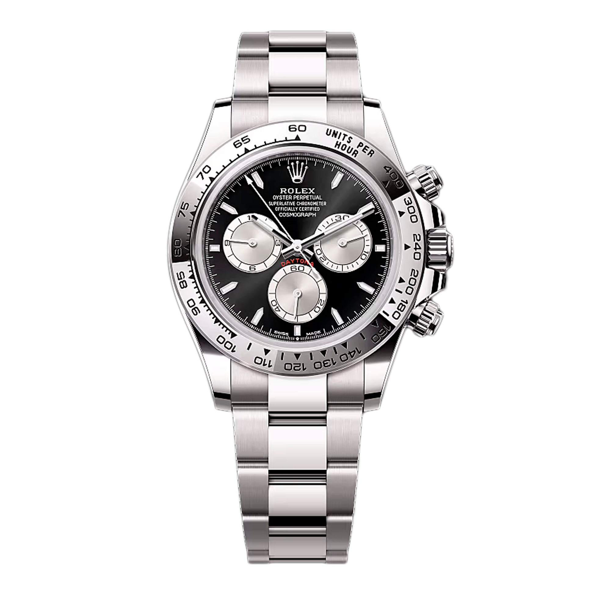 Rolex Daytona 126509 Mens Watch. 40mm 18K white gold case. 18K white gold bezel. Black dial with luminous silver-tone hands and index hour marker. Three black sub-dials. Small seconds hand at 6 o'clock. 30-minute counter at 3 o'clock. 12-hour counter at 9 o'clock. Minute maker on the outer dial. 18K white gold Oyster bracelet with fold over clasp with safely. Will fit up to 7.5-Inch wrist. Sapphire crystal. 18K white gold case back. Automatic self-winding movement. This watch comes with original Box and Papers.