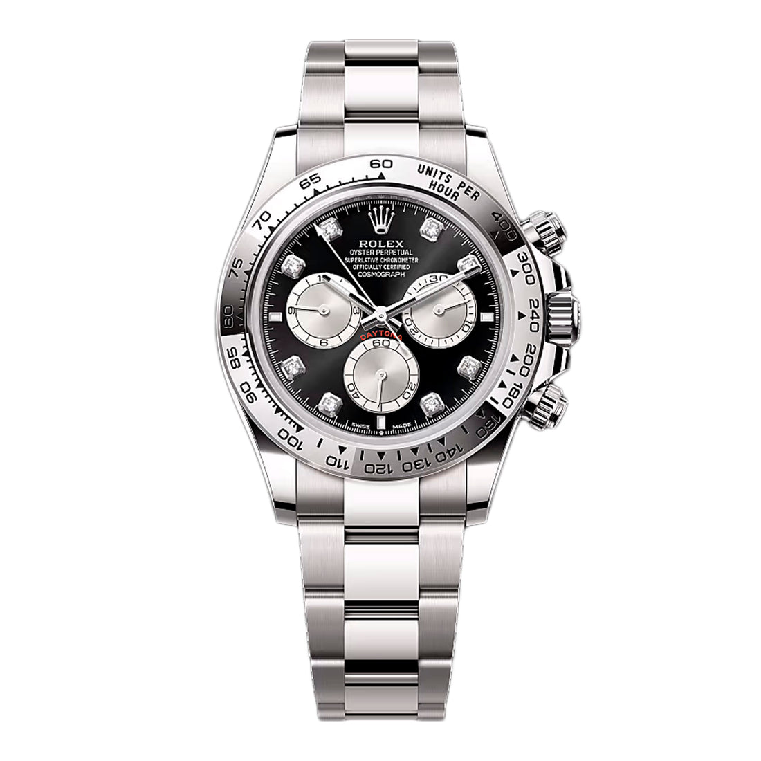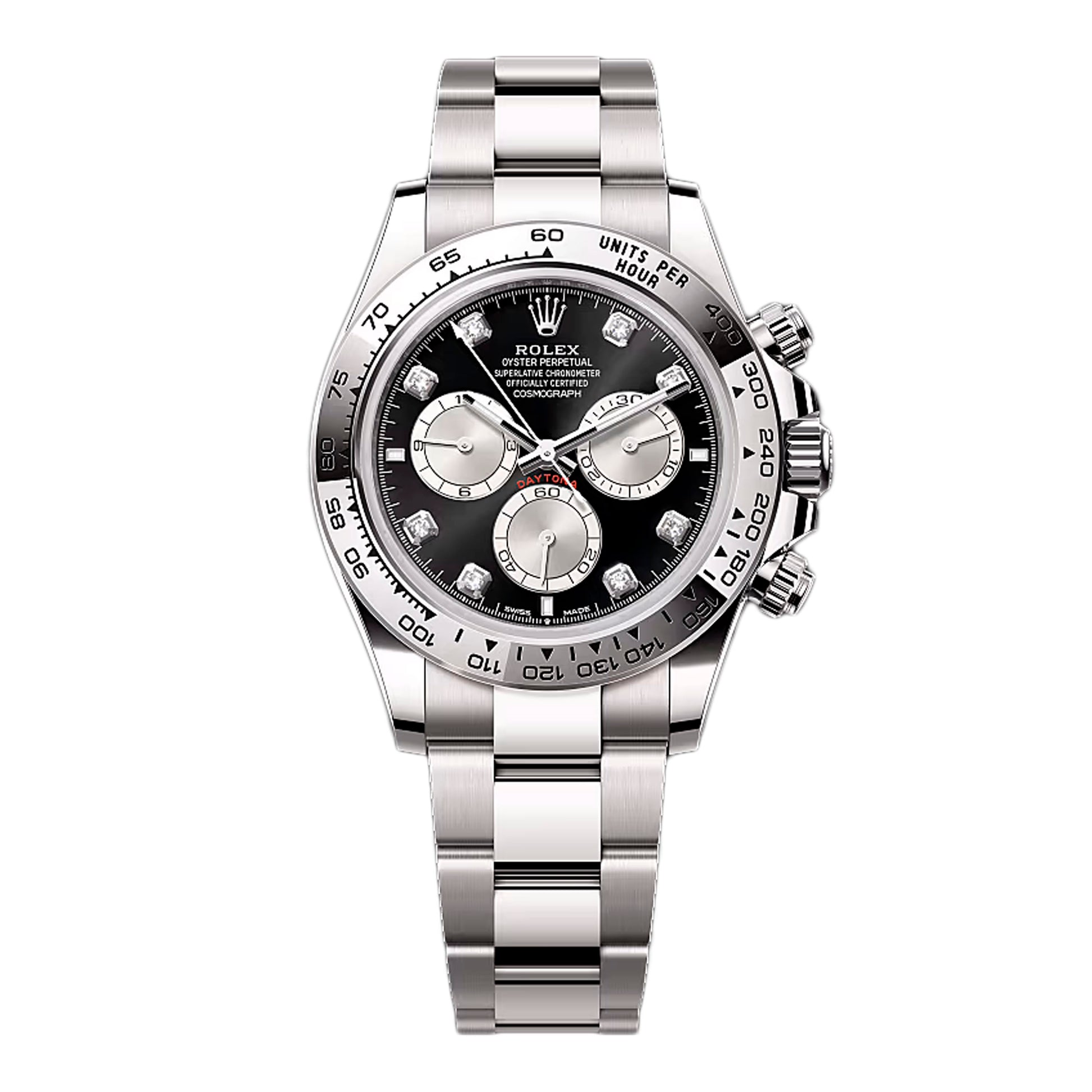 Rolex Daytona 126509 Mens Watch. 40mm 18K white gold case. 18K white gold bezel. Black dial with luminous silver-tone hands and factory diamond hour marker. Three black sub-dials. Small seconds hand at 6 o'clock. 30-minute counter at 3 o'clock. 12-hour counter at 9 o'clock. Minute maker on the outer dial. 18K white gold Oyster bracelet with fold over clasp with safely. Will fit up to 7.5-Inch wrist. Sapphire crystal. 18K white gold case back. Automatic self-winding movement. This watch comes with original Box and Papers.