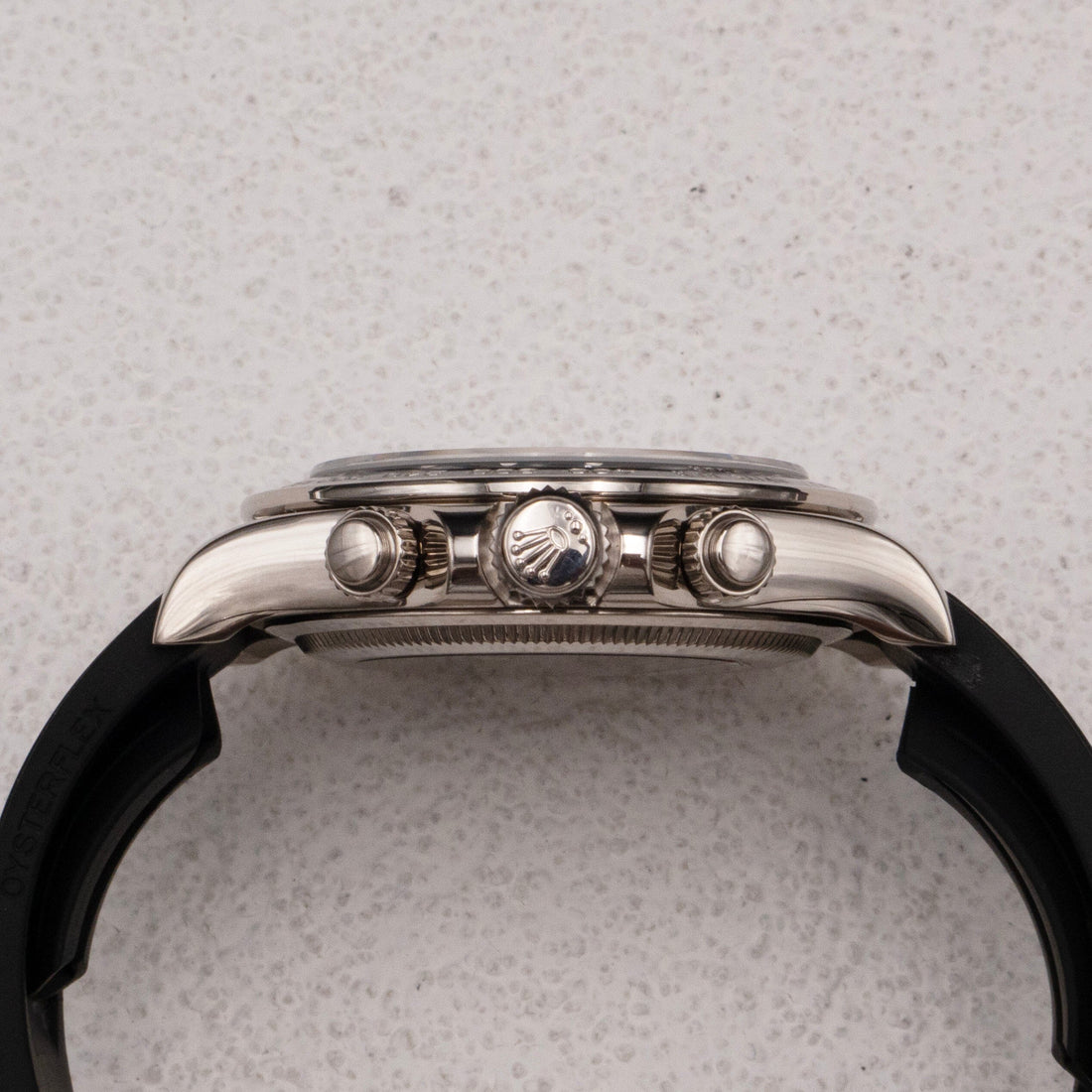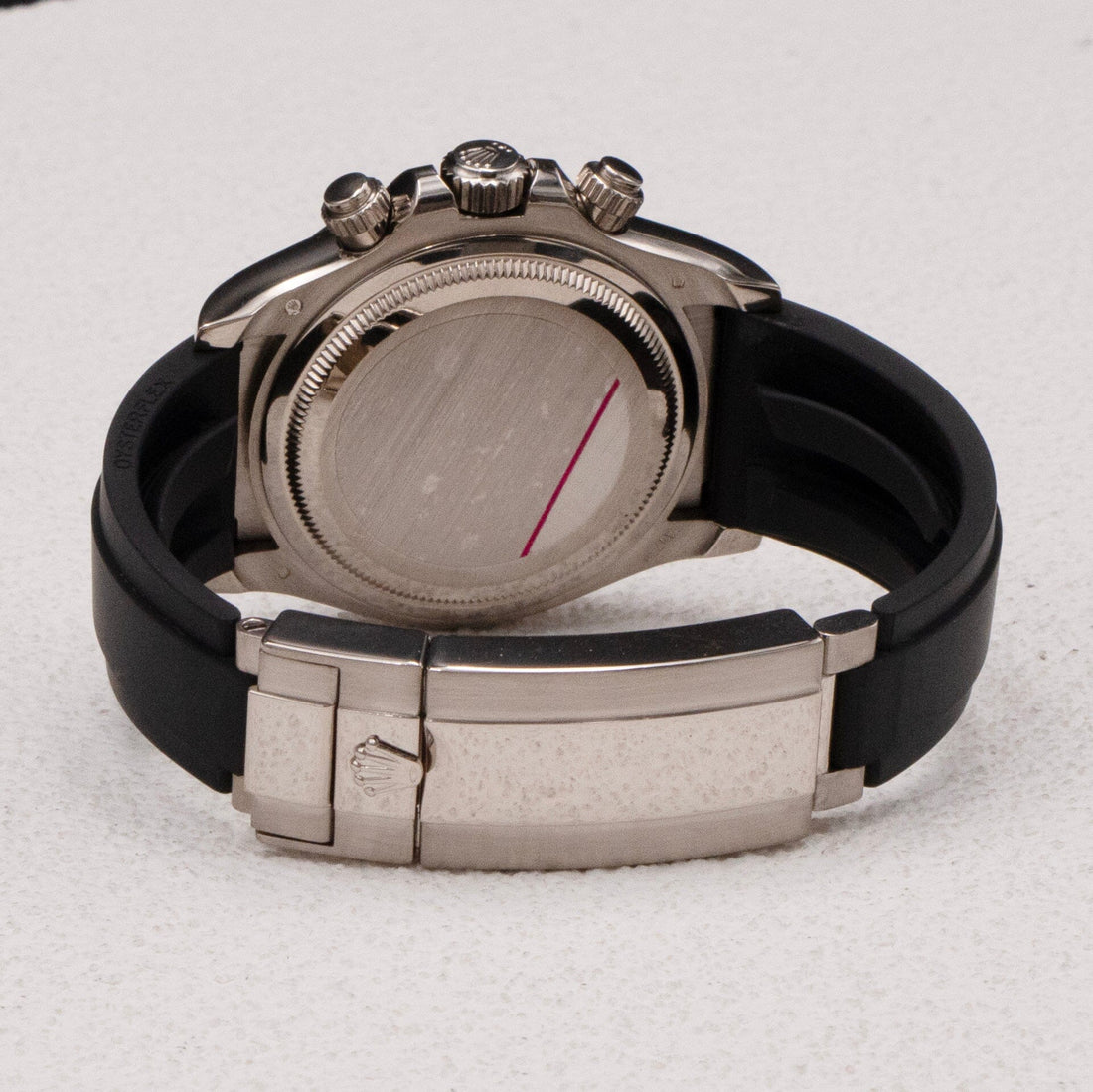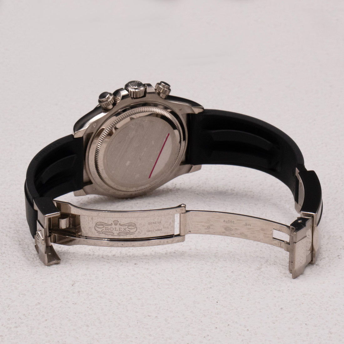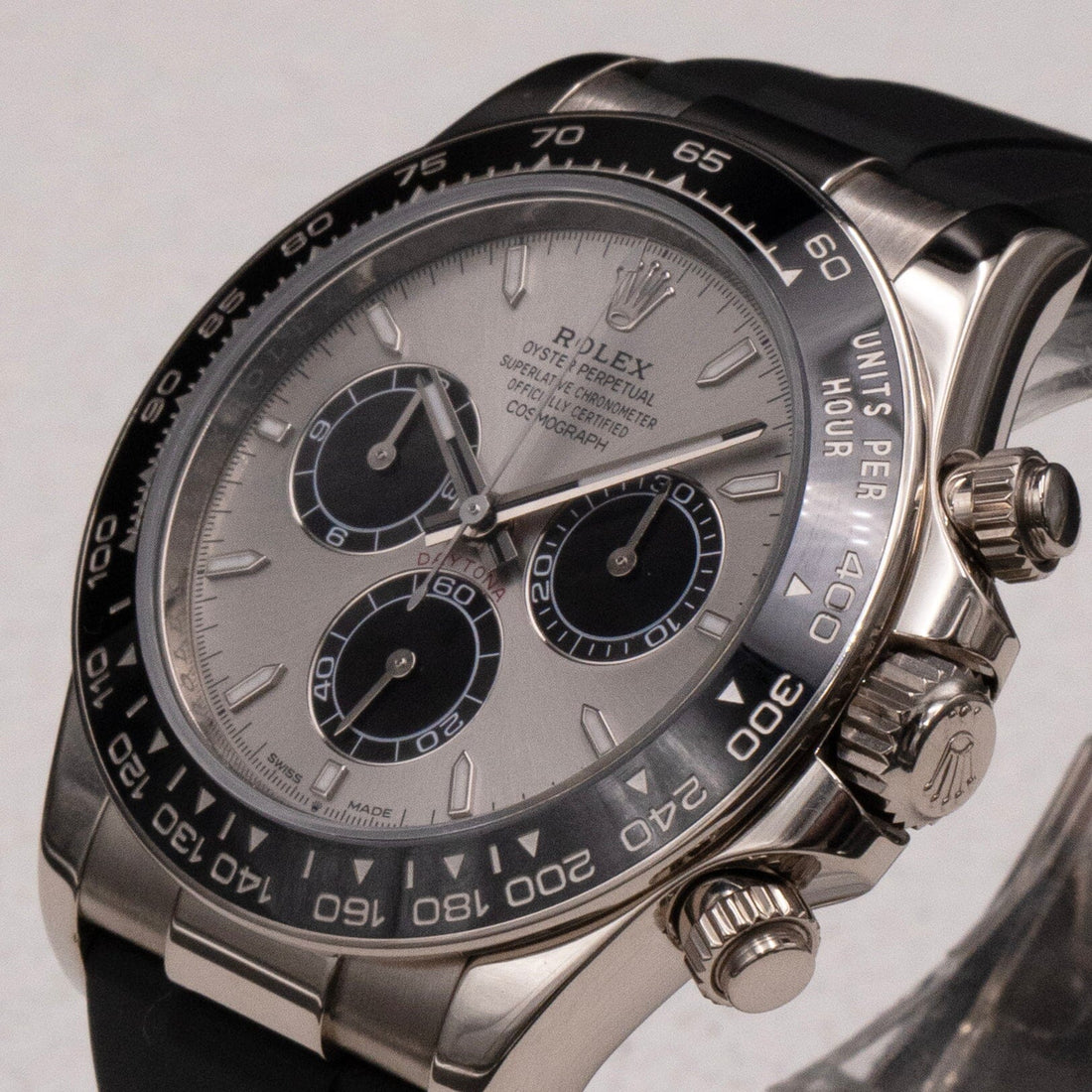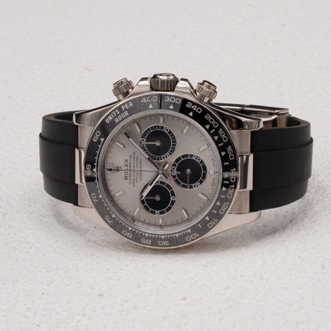 Rolex Cosmograph Daytona 126519LN Mens Watch. 40mm 18K white gold case. Black ceramic bezel with tachymetric scale. Silver dial with luminous silver-tone hands and index hour markers. Minute markers on the outer dial. Three sub-dials. Small seconds hand at 6 o'clock. 30-minute counter at 3 o'clock. 12-hour counter at 9 o'clock. Black Oysterflex strap with 18K white gold fold over clasp with safety. Will fit up to a 6.75-inch wrist. Sapphire crystal. 18K white gold case back. Caliber 4131 Automatic self-winding chronometer movement with a 72-hour power reserve. This watch comes with original Box and Papers.