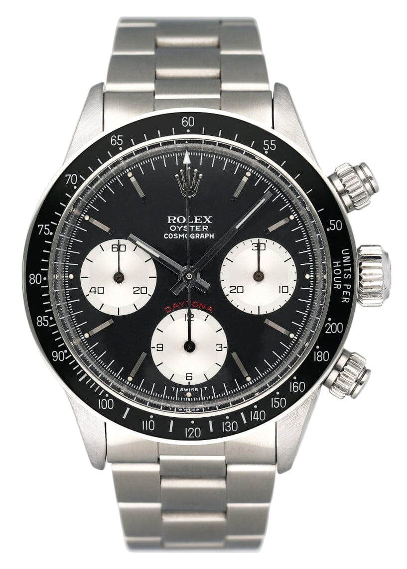 Rolex Daytona 6263 Mens Watch. 37mm stainless steel case. Black acrylic bezel with tachymetric scale. Black dial with steel hands and index hour markers. Minute markers on the outer dial. Three sub-dials. Small seconds hand at 9 o'clock. 30-minute counter at 3 o'clock. 12-hour counter at 6 o'clock. Stainless steel Oyster bracelet with fold over clasp. Will fit up to a 6.75-inch wrist. Acrylic crystal. Stainless steel case back. Automatic self-winding movement.