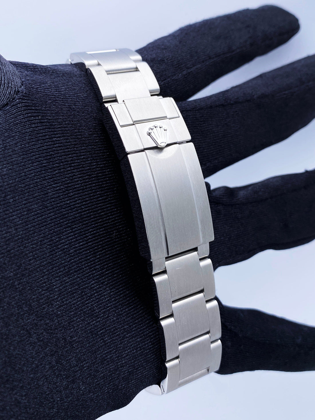 Rolex Oyster Perpetual Explorer 214270 Mens Watch. 39mm stainless steel case. Stainless steel smooth bezel. Black dial with luminous steel hands and index & Arabic numeral hour markers. Minute markers on the outer dial. Stainless steel Oyster bracelet with fold over clasp with safety. Will fit up to a 7-inch wrist. Sapphire crystal. Stainless steel case back. Automatic self-winding movement. This watch comes with original Box and Papers.