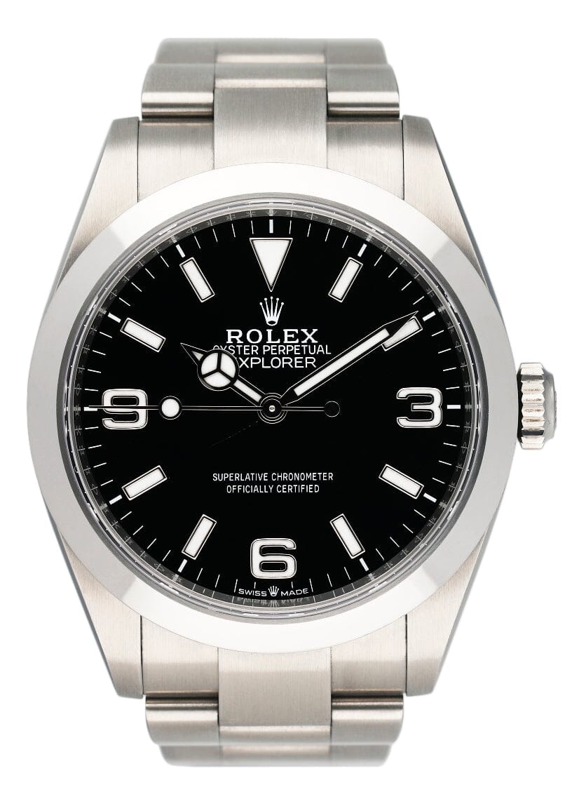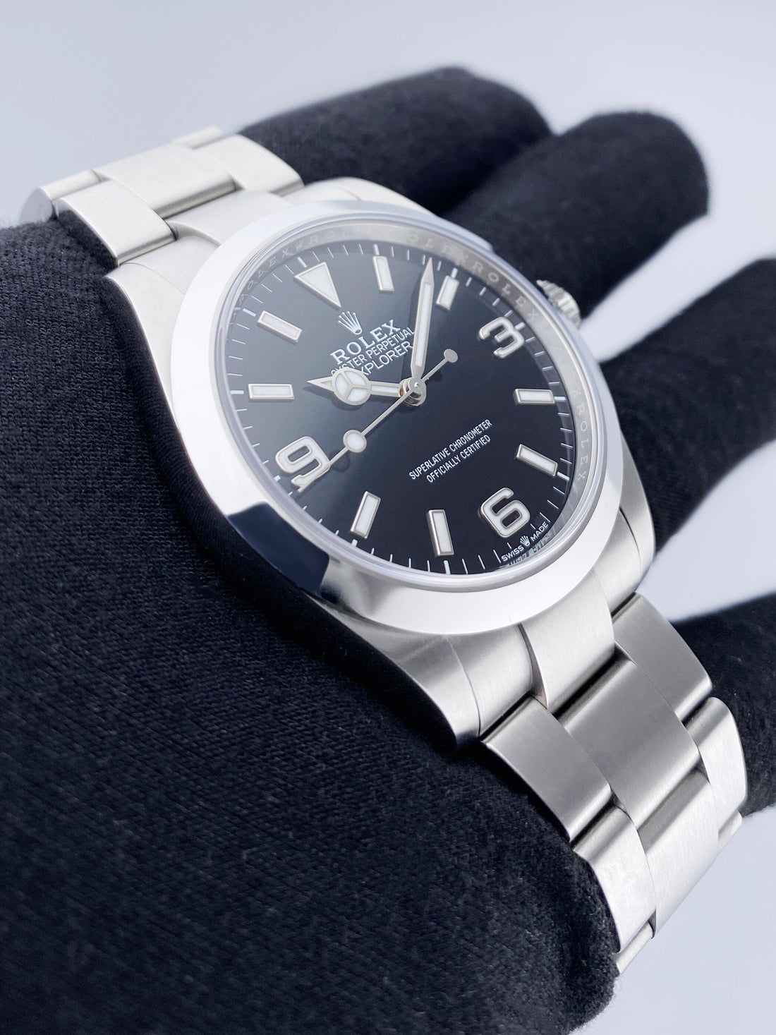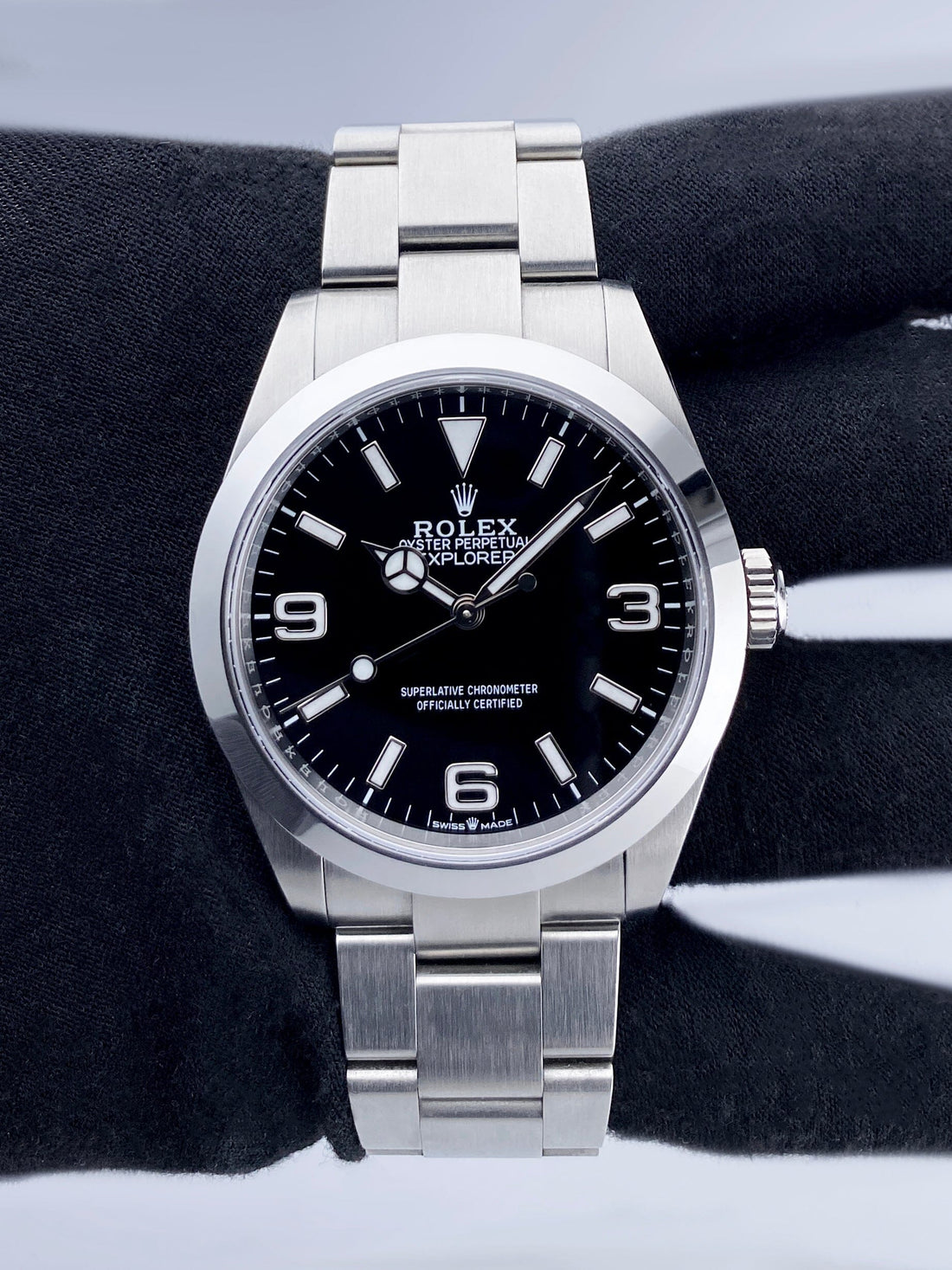 Rolex Oyster Perpetual Explorer 224270 Mens Watch. 40mm stainless steel case. Stainless steel smooth bezel. Black dial with luminous hands and Arabic numerals & index hour marker. Stainless steel Oyster bracelet with fold over clasp with safety. Will fit up to 7.5-inch wrist. Sapphire Crystal. Stainless steel case back. Automatic self-winding movement.