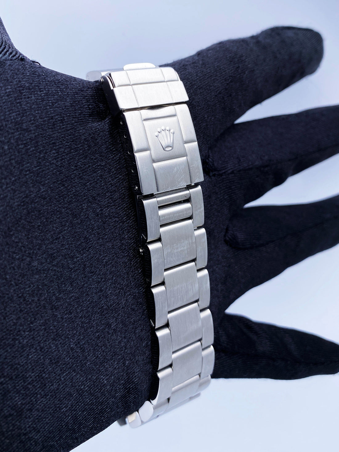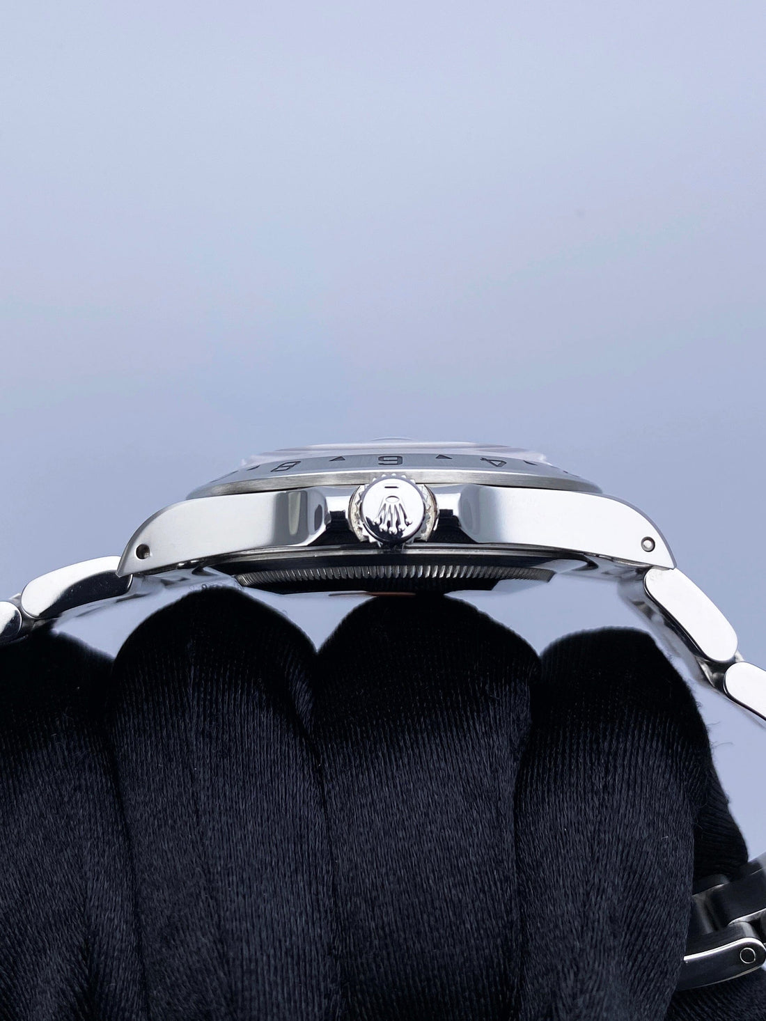 Rolex Explorer II 16570 mens watch. 40mm stainless steel case. Stainless steel fixed bezel with 24 hour black bezel insert. Black dial with steel Mercedes hands and dot hour markers. Minute markers on the outer dial. Date display at the 3 o'clock position. Stainless steel oyster bracelet with fold over clasp with safety. Will fit up to a 7-inch wrist. Sapphire Crystal. Stainless steel case back. Automatic self-winding chronometer movement. This watch comes with original Box and Papers.