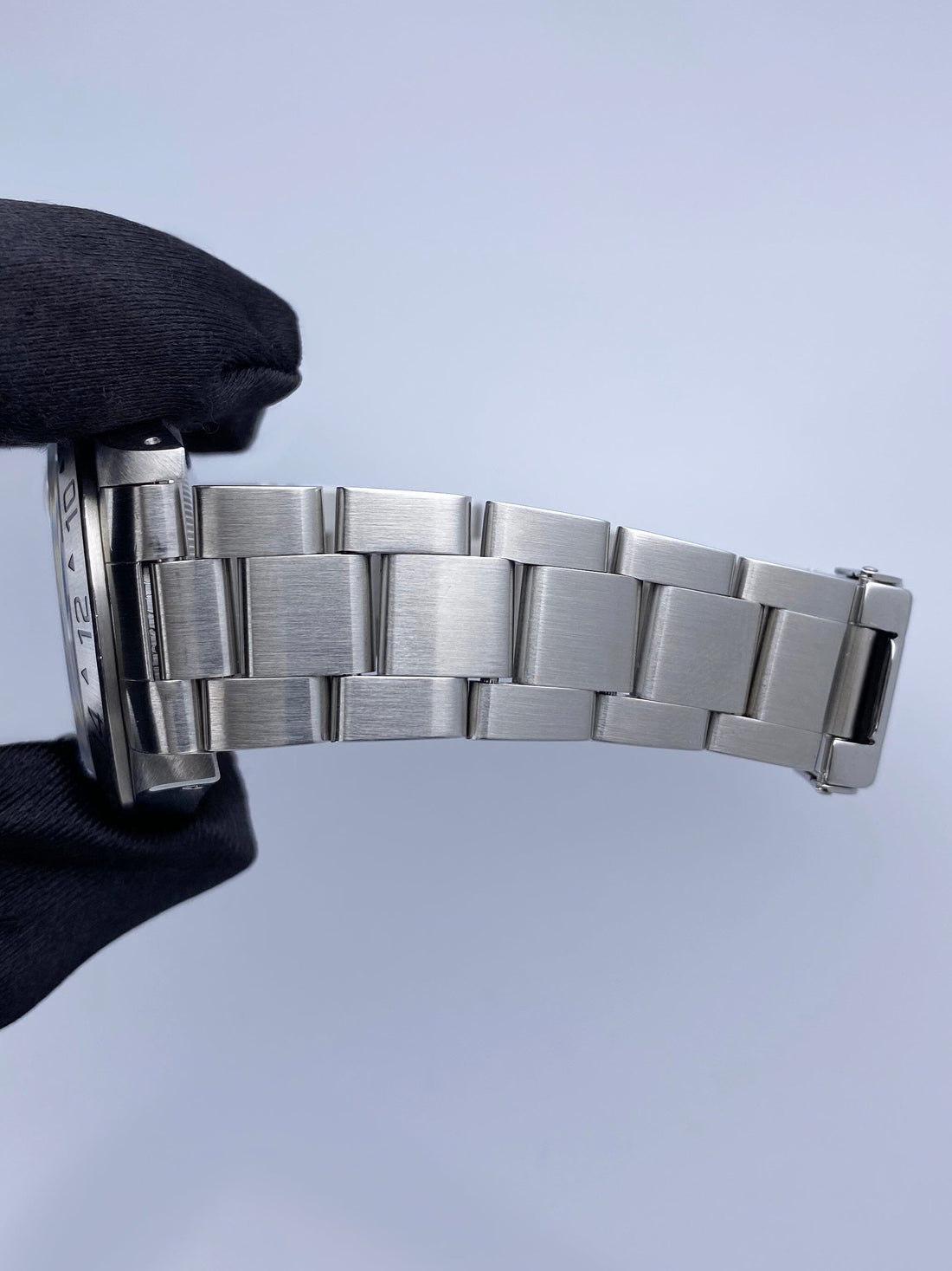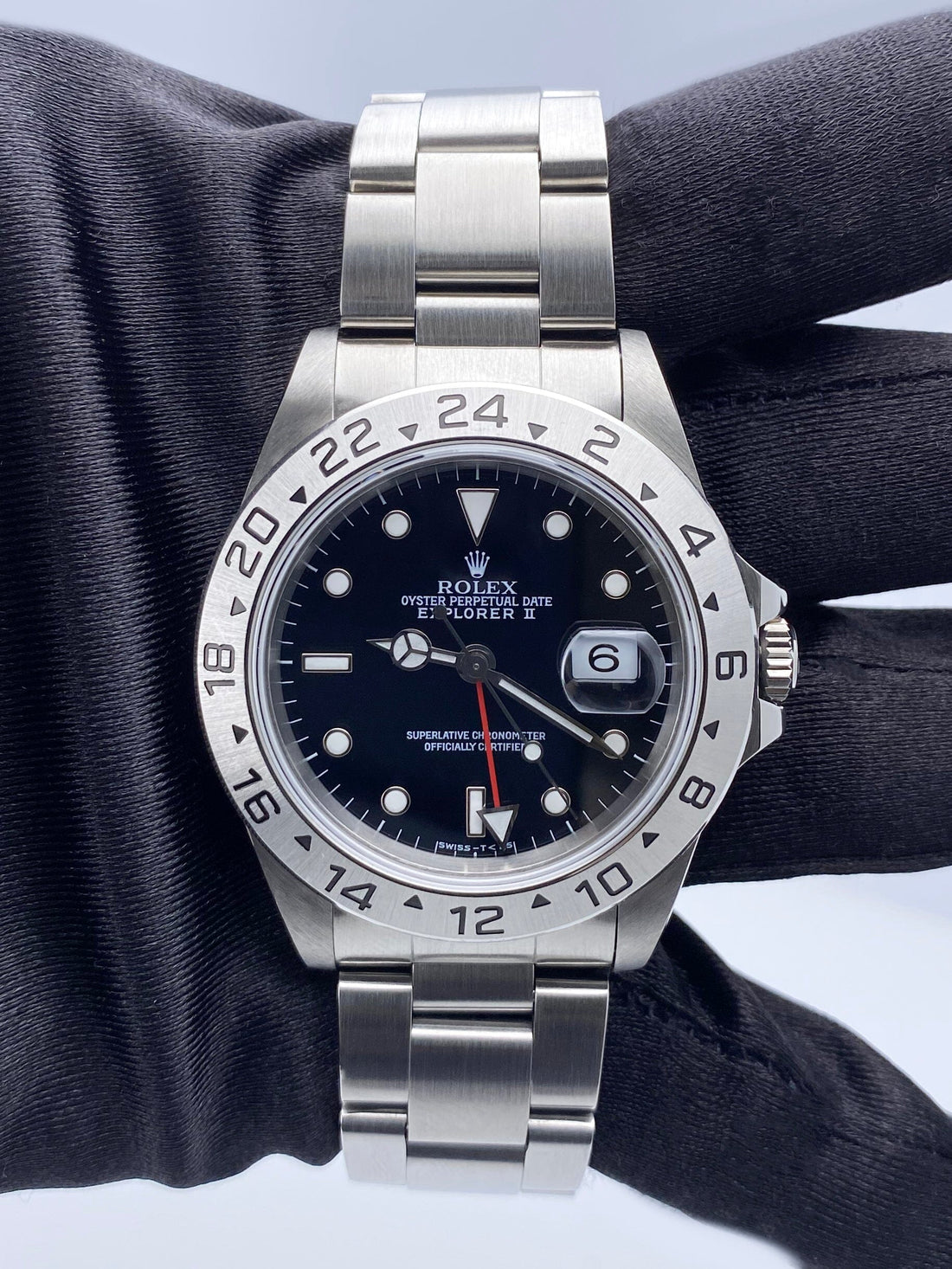 Rolex Explorer II 16570 Mens Watch. 40mm stainless steel case. Stainless steel bezel. Black dial with luminous steel hands and dot hour markers. The Date is displayed at 3 o'clock position. Minute markers on the outer dial. Stainless steel Oyster bracelet with fold over clasp with safety. Will fit up to a7-inch wrist. Sapphire crystal. Stainless steel case back. Automatic self-winding chronometer movement. This watch comes with original Box and Papers.