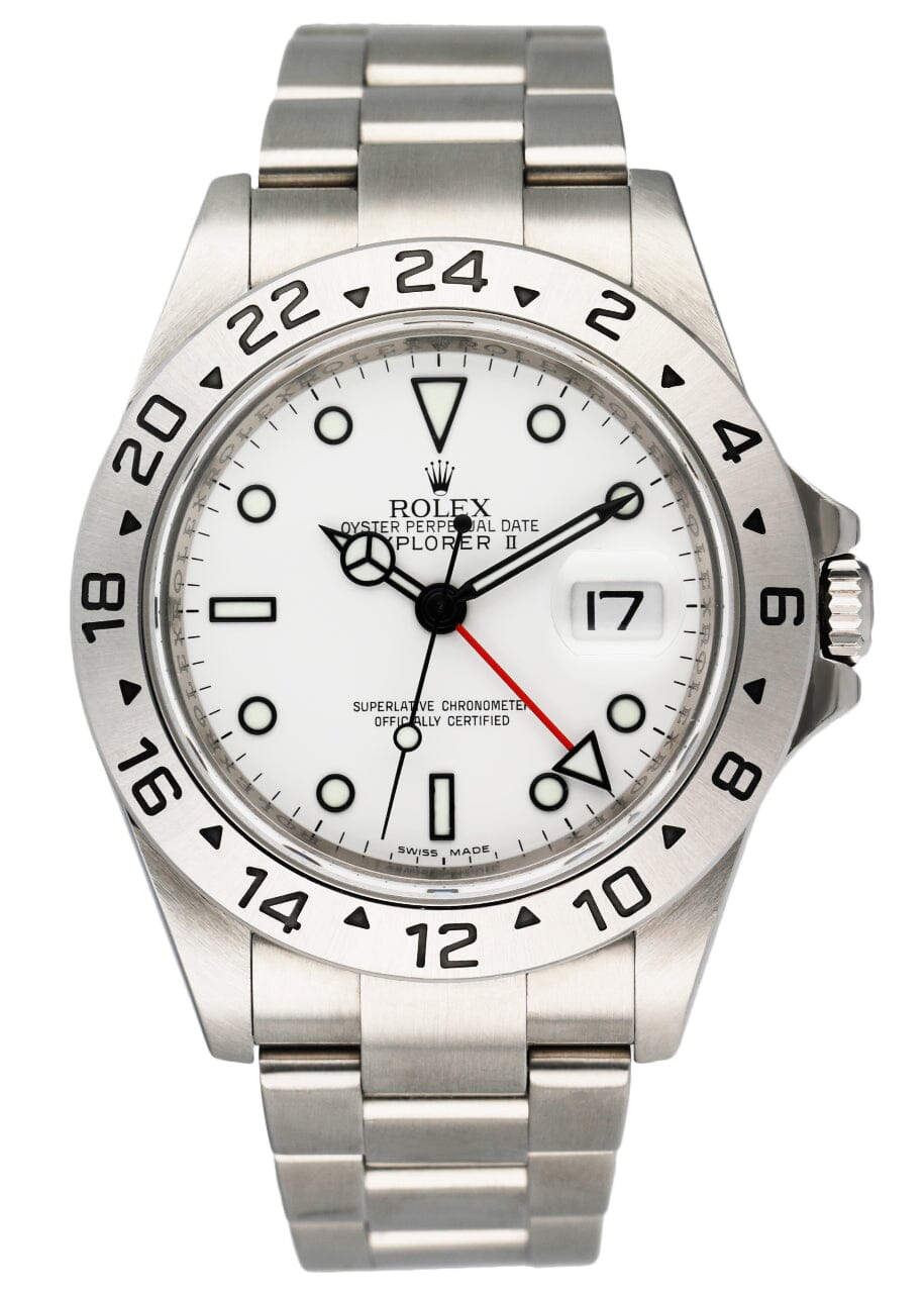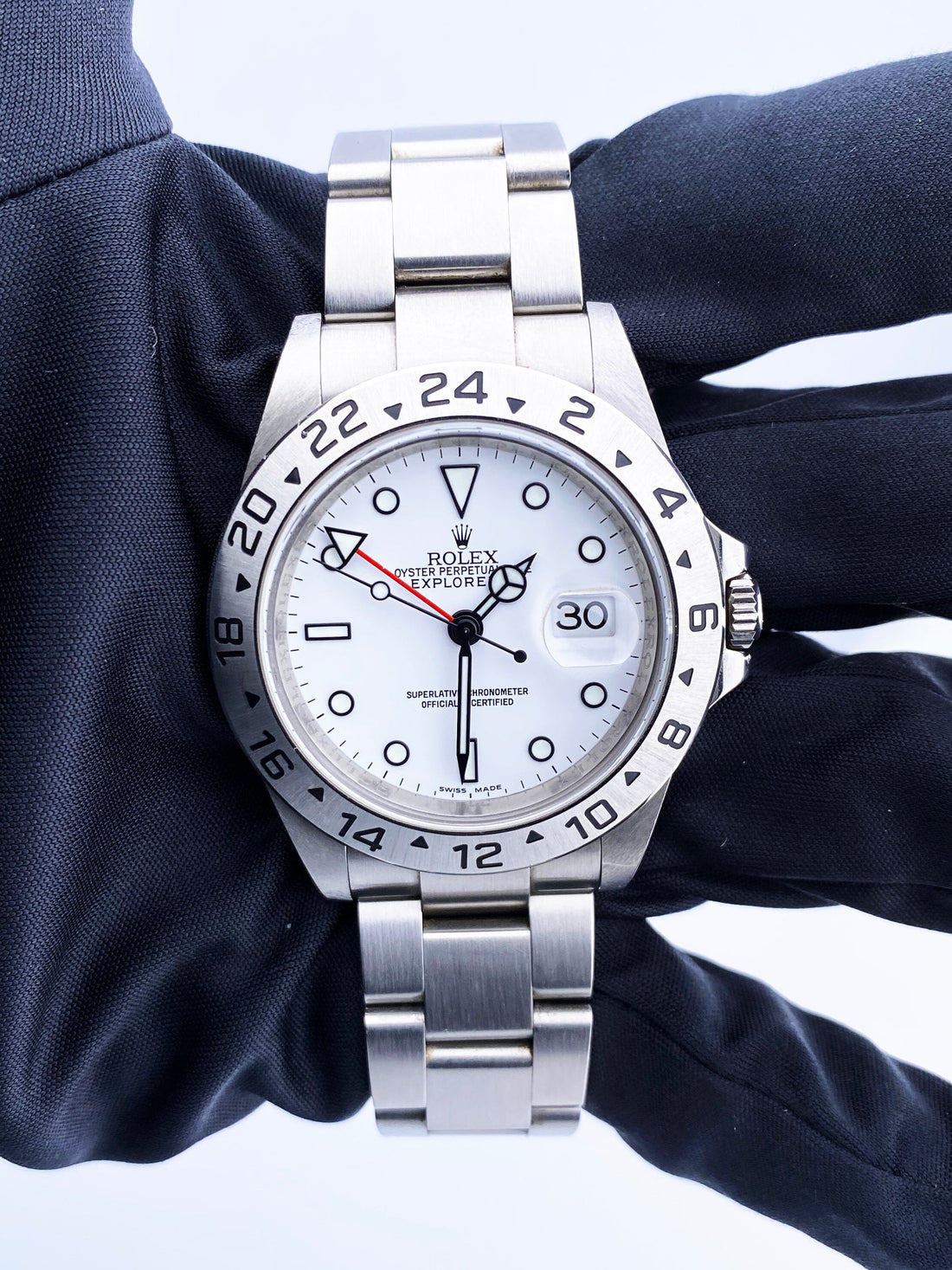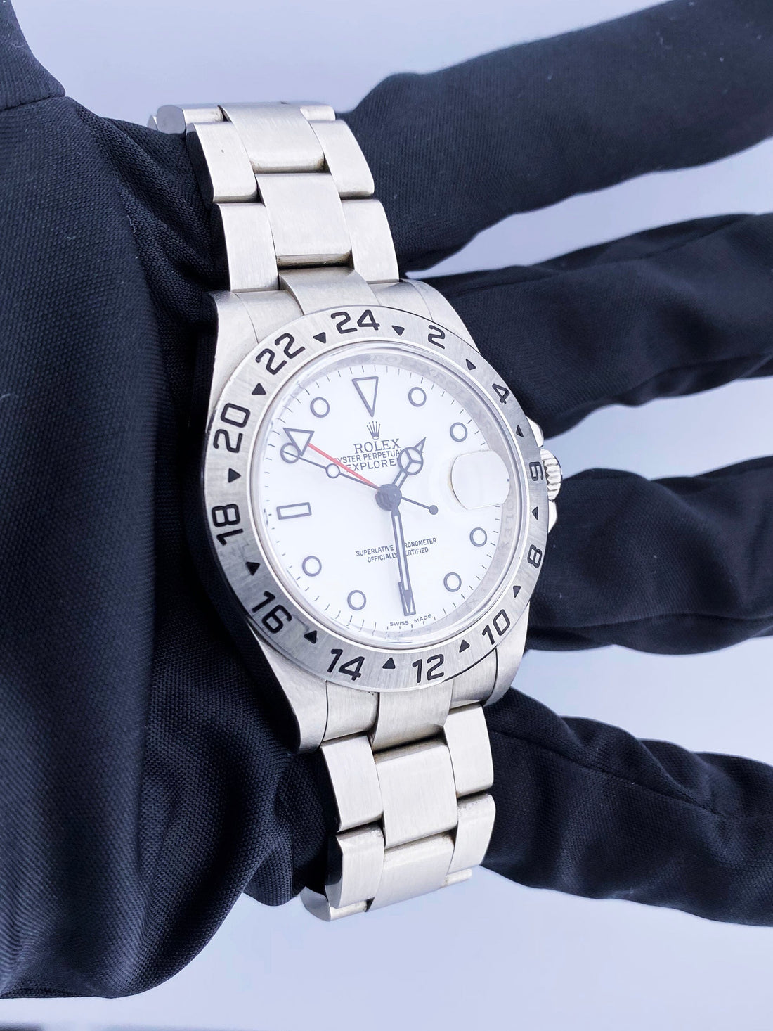 Rolex Explorer II 16570 Mens Watch. 40mm stainless steel case with stainless steel 24 Hour time display bezel. White dial with black luminous steel hands and index hour markers. Minute markers on the outer dial. Date display at the 3 o'clock position. Engraved rehuat. Stainless steel bracelet with fold over clasp with safety. Will fit up to a 7-inch wrist. Sapphire crystal. Stainless steel case back. Calibre 3186 Automatic self-winding chronometer movement with a 50-hour power reserve.