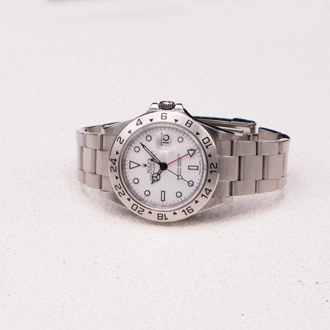 Rolex Explorer II 16570 Mens Watch. 40mm stainless steel case with stainless steel 24 Hour time display bezel. White dial with black luminous steel hands and index hour markers. Minute markers on the outer dial. Date display at the 3 o'clock position. Engraved rehuat. Stainless steel bracelet with fold over clasp with safety. Will fit up to a 6.75-inch wrist. Sapphire crystal. Stainless steel case back. Calibre 3186 Automatic self-winding chronometer movement with a 50-hour power reserve. This watch comes with the original Box and Papers.