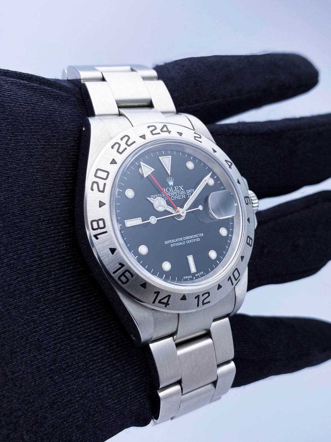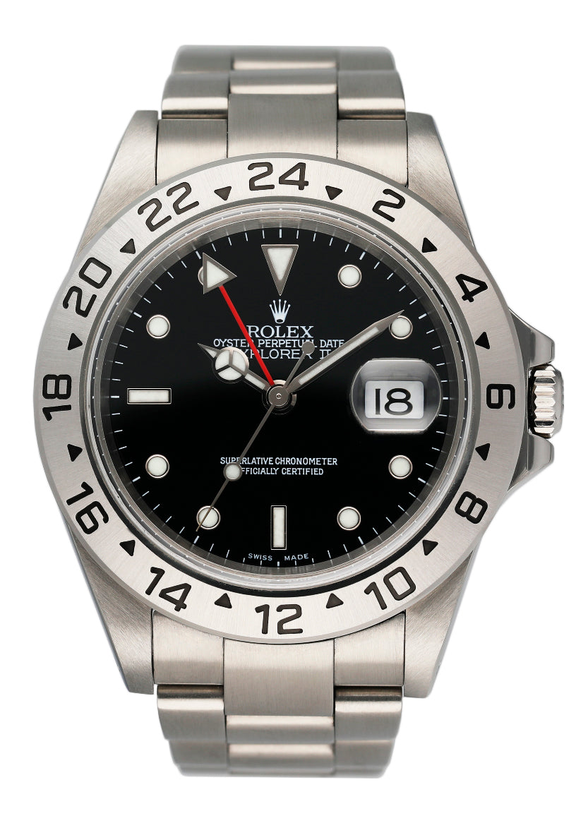 Rolex Explorer II 16570 Mens Watch. 40mm stainless steel case. Stainless steel bezel. Black dial with luminous steel hands and dot hour markers. Minute markers on the outer dial. Stainless steel oyster bracelet with fold over clasp with safety. Will fit up to a 6.75-inch wrist. Sapphire crystal. Stainless steel case back. Calibre 3185 automatic self-winding chronometer movement with a 50-hour power reserve.