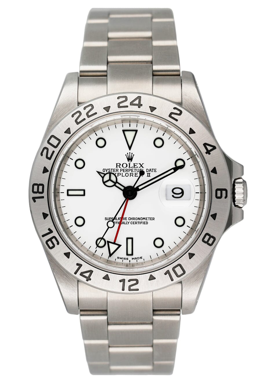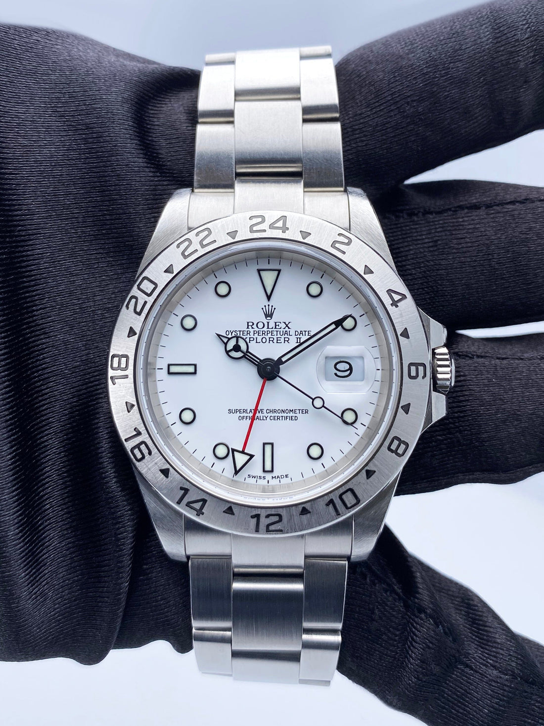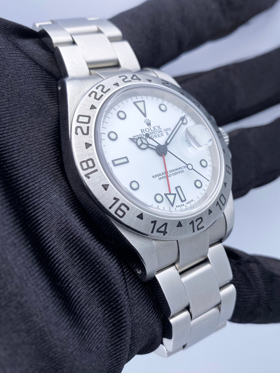 Rolex Explorer II 16570 Mens Watch. 40mm stainless steel case with stainless steel bezel. White dial with black luminous steel hands and index hour markers. Minute markers on the outer dial. Date display at the 3 o'clock position. Stainless steel Oyster bracelet with fold over clasp with safety. Will fit up to a 7-inch wrist. Sapphire crystal. Stainless steel case back. Automatic self-winding movement. This watch comes with original Box and Papers.