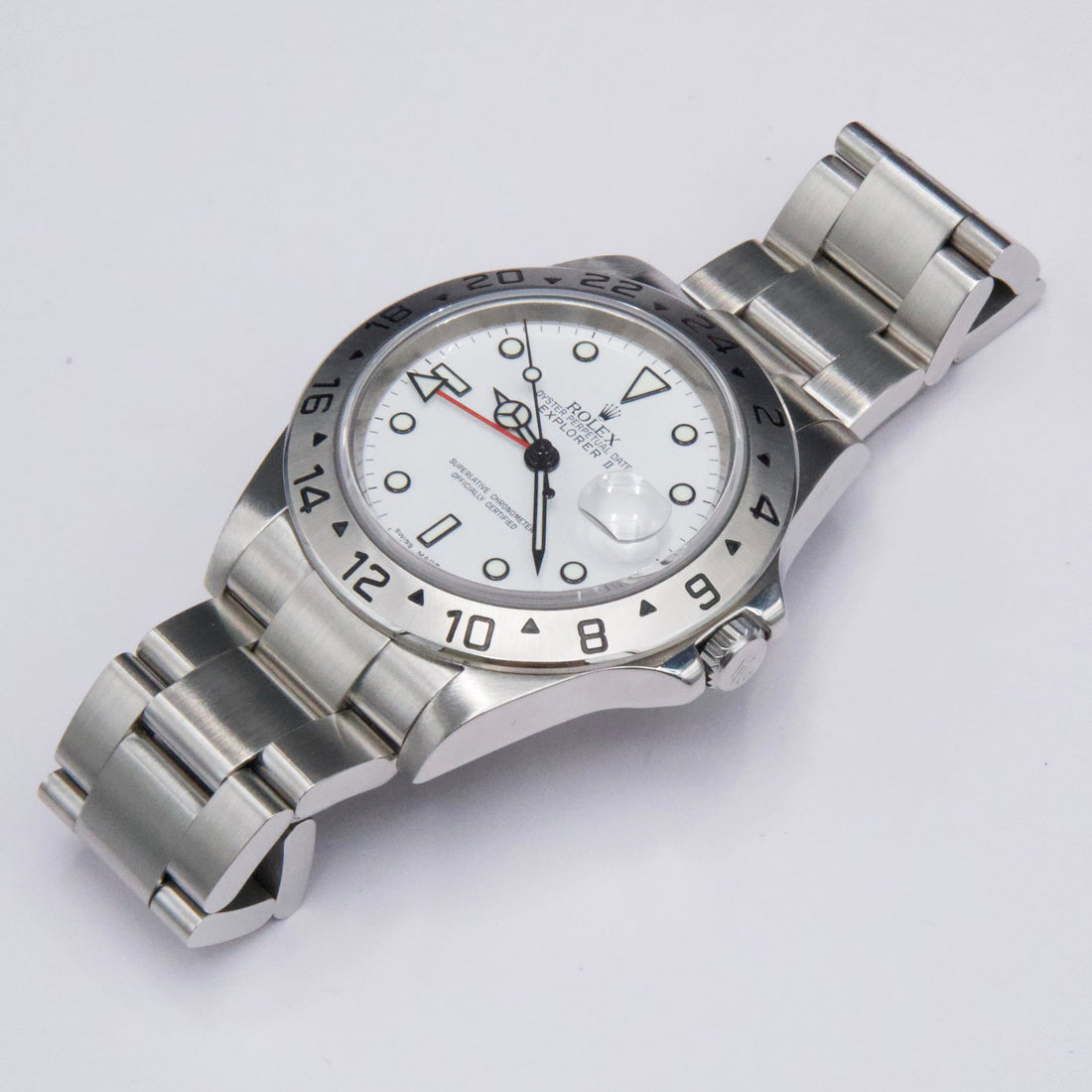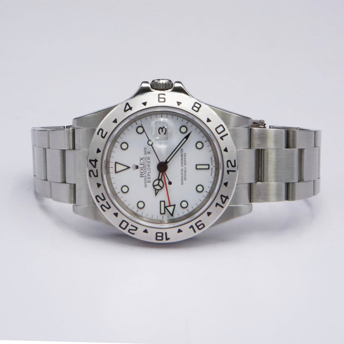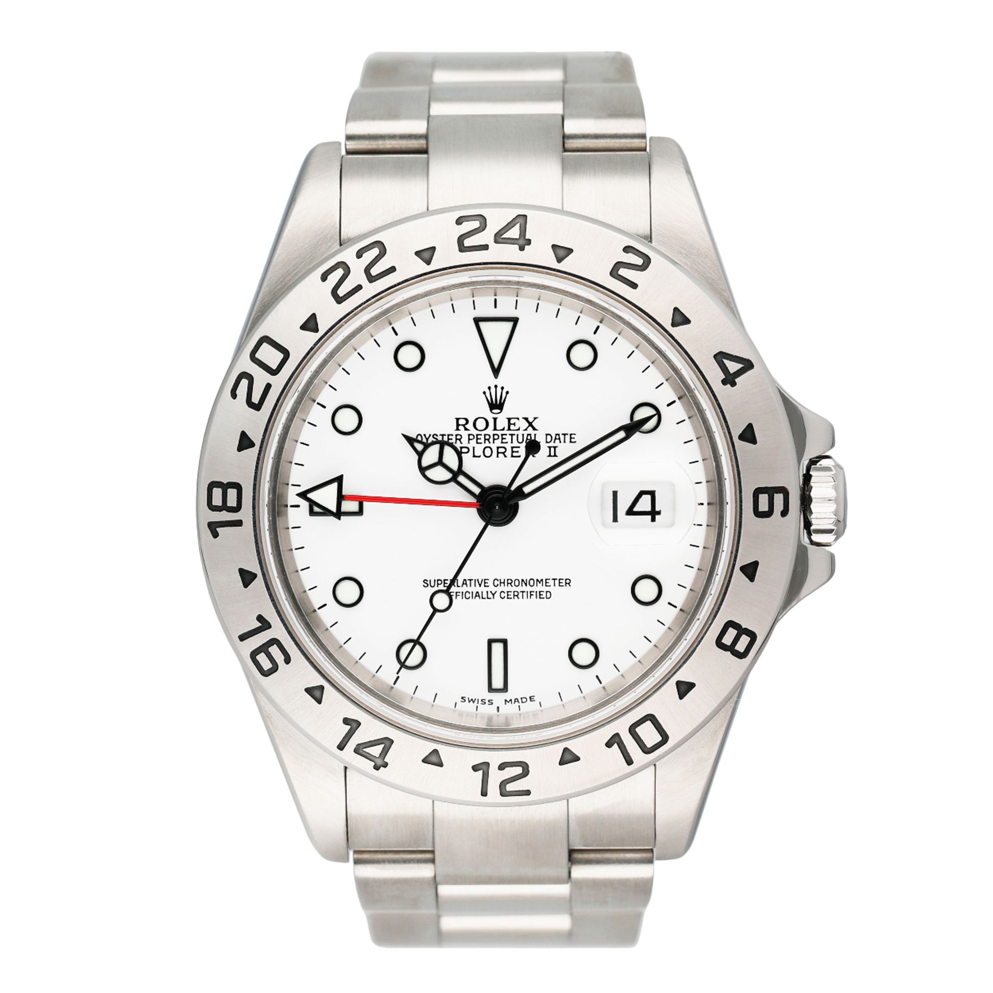 Rolex Explorer II 16570 Mens Watch. 40mm stainless steel case with stainless steel 24 Hour time display bezel. White dial with black luminous steel hands and index hour markers. Minute markers on the outer dial. Date display at the 3 o'clock position. Stainless steel oyster bracelet with fold over clasp with safety. Will fit up to a 7-inch wrist. Sapphire Crystal. Stainless steel case back. Automatic self-winding movement. This watch comes with original Box and Papers.