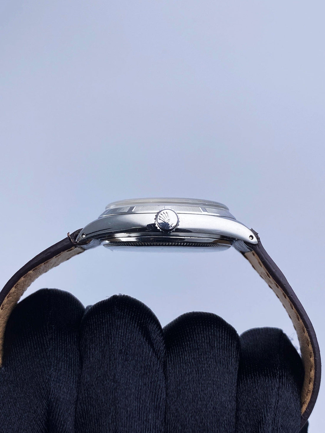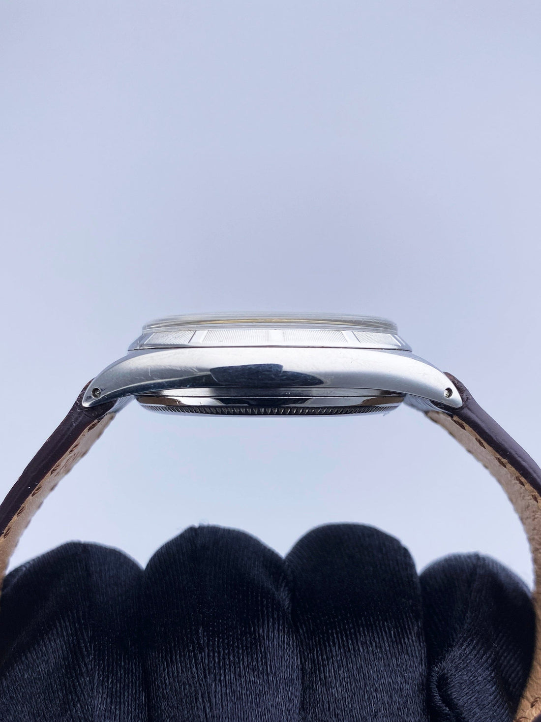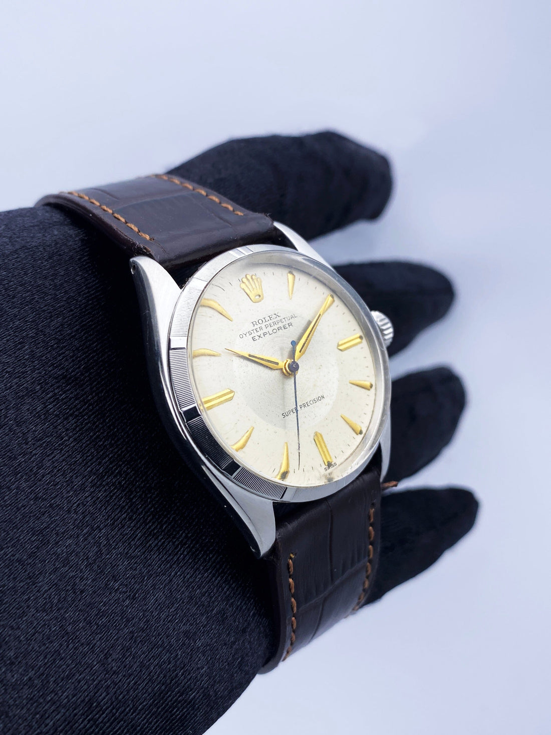 Rolex Explorer Super Precision Mens Watch. 35mm stainless steel case with stainless steel bezel. Sliver and Off-White dial with gold hands and index hour markers. Minute markers around the outer dial. Brown leather strap aftermarket with gold tone buckle. Will fit up to a 7-inch wrist. Acrylic crystal. Stainless steel case back. Automatic self-winding movement.
