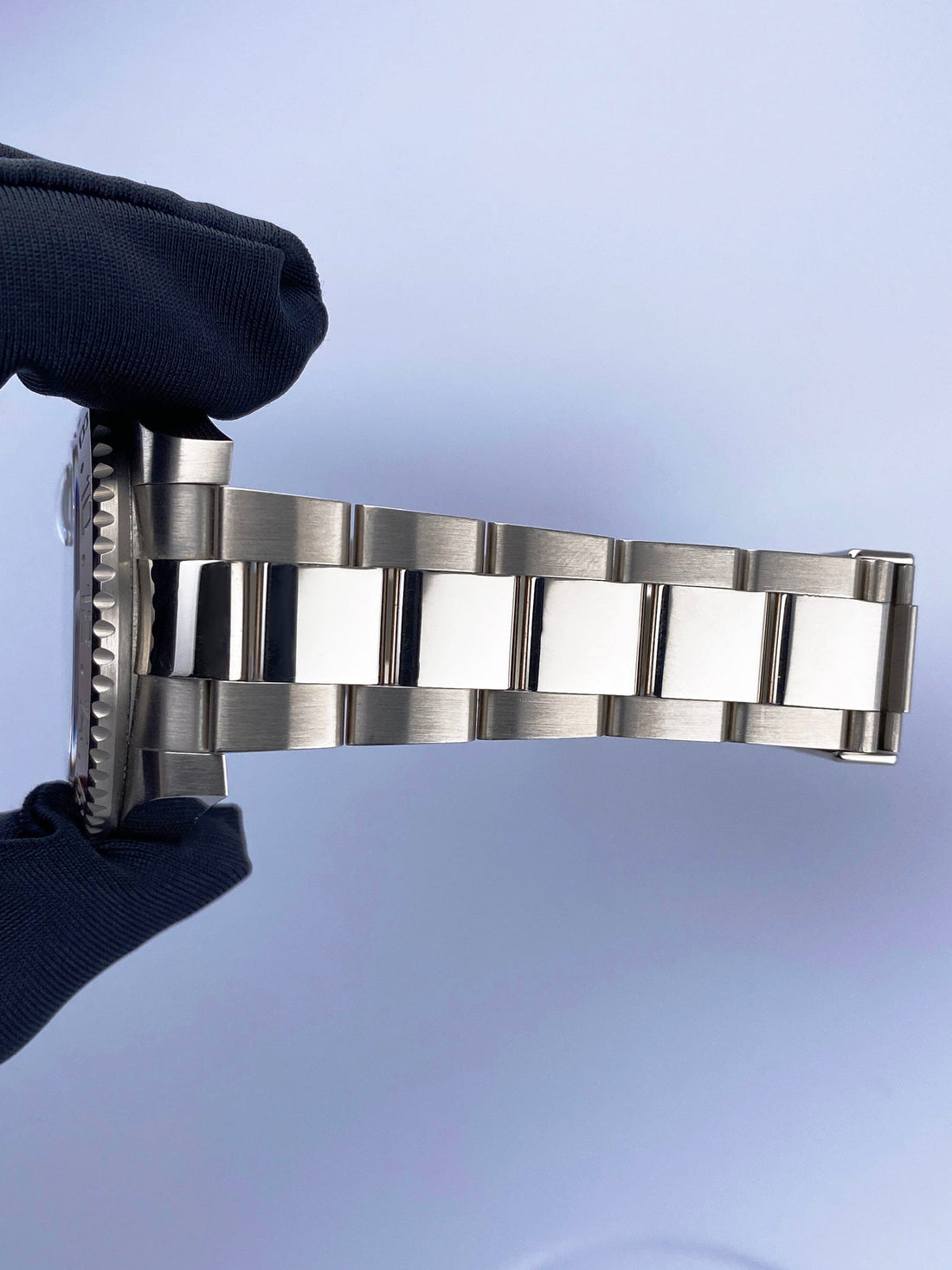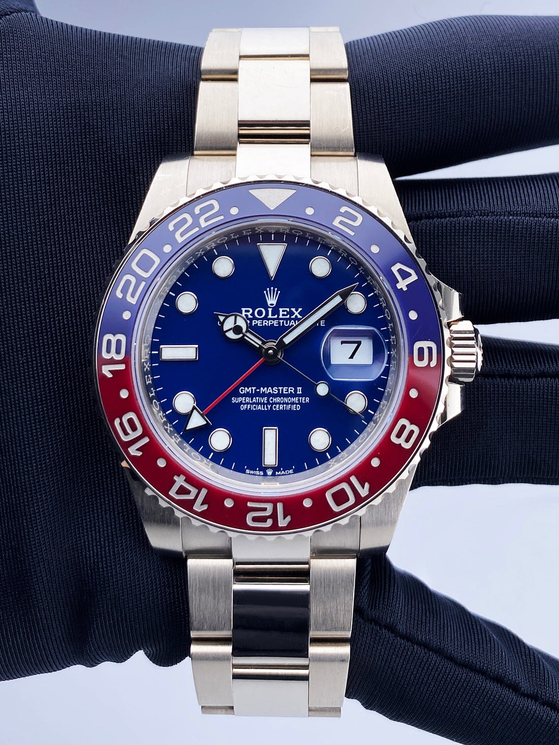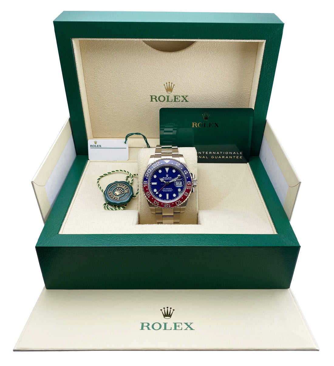 Rolex Oyster Perpetual Date GMT Master II 126719BLRO Mens Watch. 40mm 18K white gold case. Bi-directional rotatable bezel with blue & red ceramic insert. Midnight blue dial with luminous Mercedes hands and index hour markers. Minute markers on the outer dial. Date display at the 3 o'clock position. 18K white gold Oyster bracelet with fold over clasp with safety. Will fit up to 7.5-inch wrist. Sapphire crystal. 18K rose gold case back. Automatic self-winding chronometer movement. This watch comes with original Box and Papers.