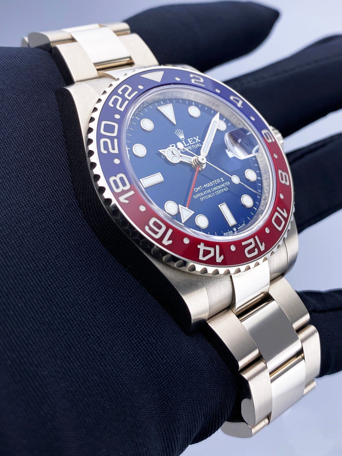 Rolex Oyster Perpetual Date GMT Master II 126719BLRO Mens Watch. 40mm 18K white gold case. Bi-directional rotatable bezel with blue & red ceramic insert. Midnight blue dial with luminous Mercedes hands and index hour markers. Minute markers on the outer dial. Date display at the 3 o'clock position. 18K white gold Oyster bracelet with fold over clasp with safety. Will fit up to 7.5-inch wrist. Sapphire crystal. 18K rose gold case back. Automatic self-winding chronometer movement. This watch comes with original Box and Papers.