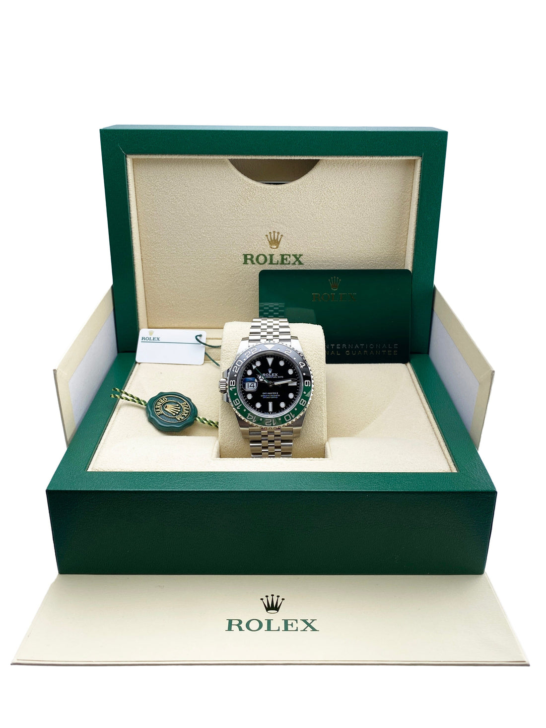 Rolex Oyster Perpetual Date GMT-Master II 126720VTNR Mens Watch. 40mm stainless steel case. Bidirectional rotating black and green ceramic bezel insert. Black dial with luminous steel hands and dot hour markers. Minute maker on the outer dial. Date display at the 3 o'clock position. Crown located on the left side. Stainless steel Jubilee bracelet with stainless steel fold over clasp with safety. Will fit up to a 7.5-inch wrist. Automatic self-winding movement. This watch comes with original Box and Papers.