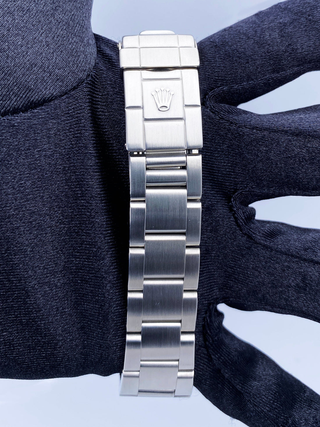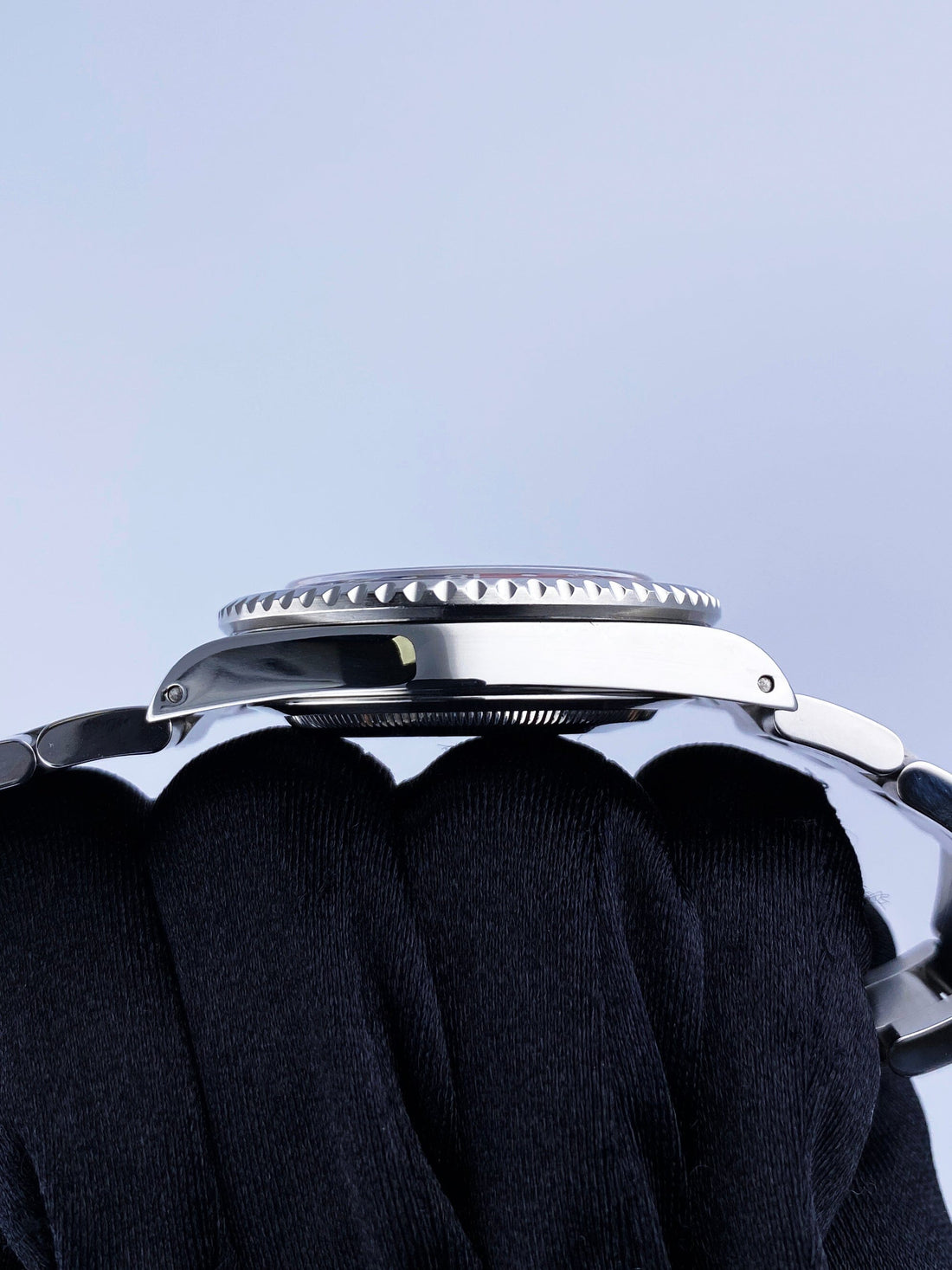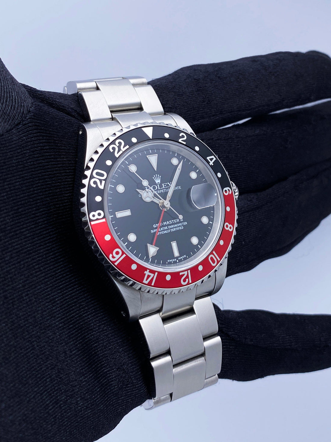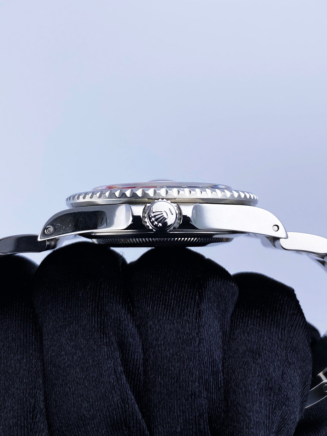 Rolex GMT Master II 16710 Mens Watch. 40mm stainless steel case. Bidirectional rotating stainless steel bezel with black and red bezel insert. Black dial with luminous steel hands and index hour markers. Minute markers on the outer dial. Date display at the 3 o'clock position. Stainless steel Oyster bracelet with fold over clasp with safety. Will fit up to a 7-inch wrist. Sapphire crystal. Stainless steel case back. Automatic self-winding movement.
