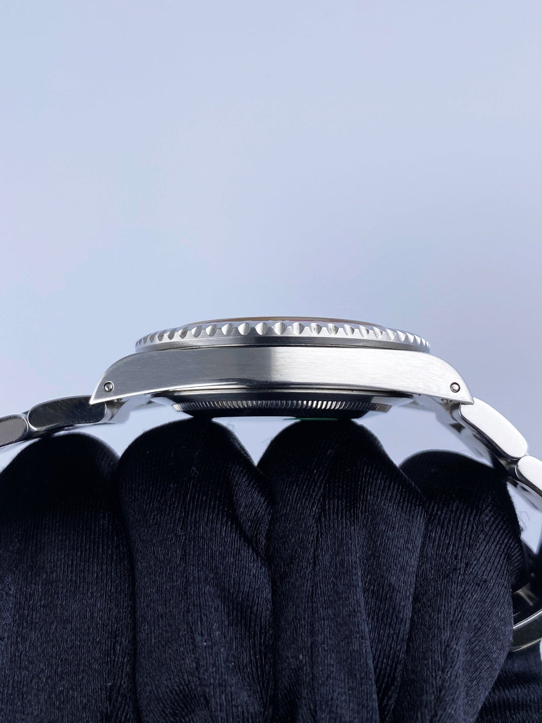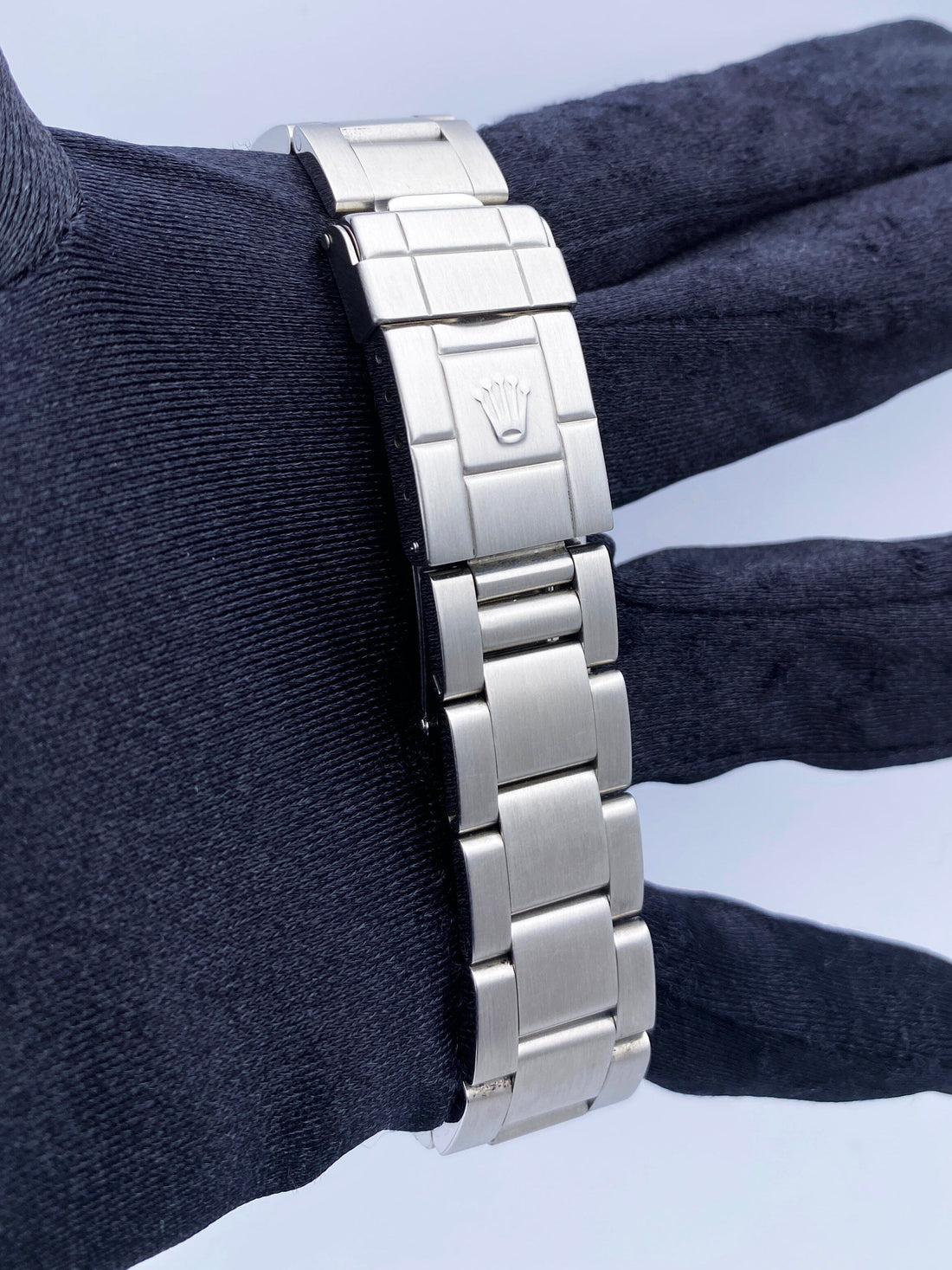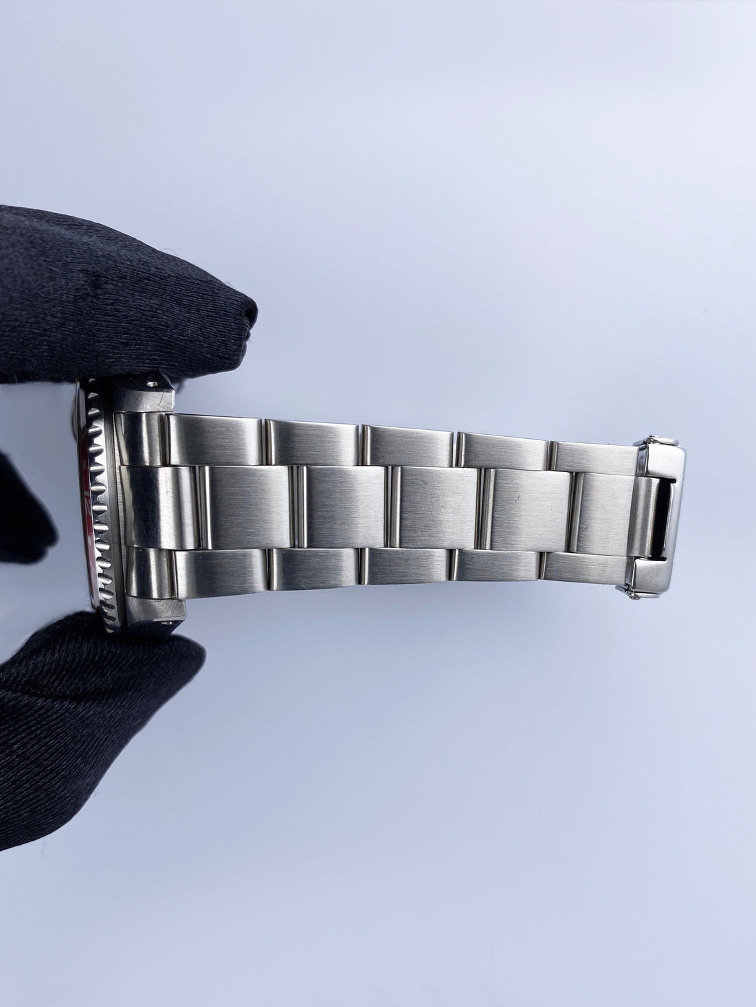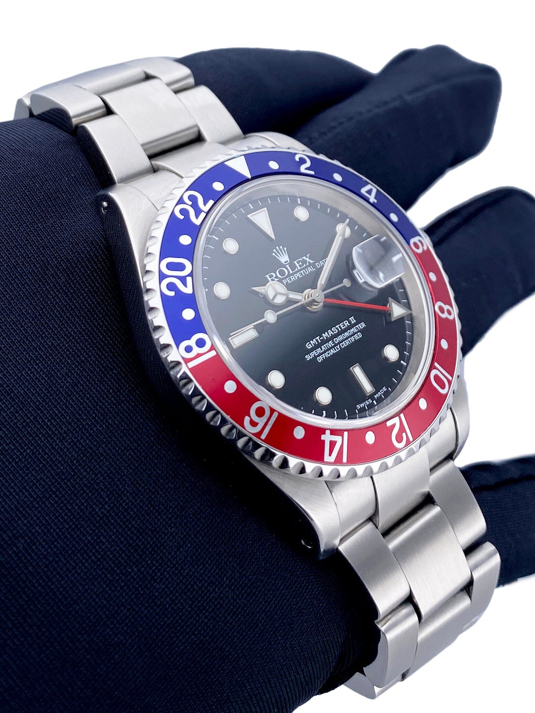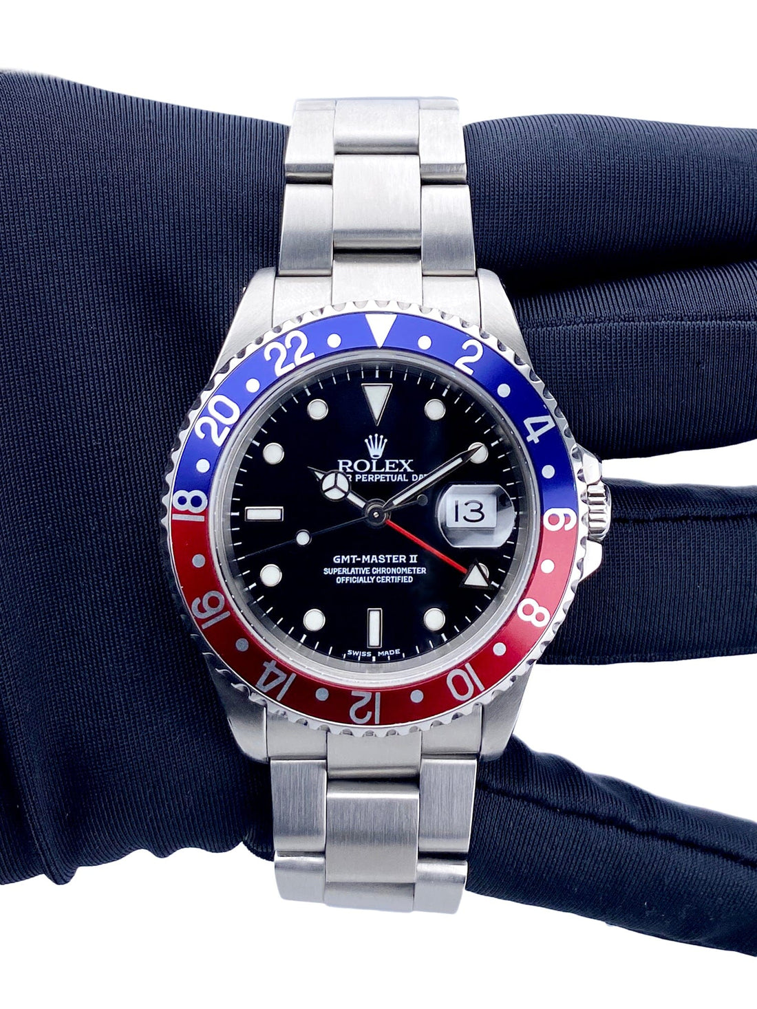 Rolex GMT Master II 16710 Mens Watch. 40mm stainless steel case. Bidirectional rotating stainless steel bezel with blue and red bezel insert. Black dial with luminous steel hands and index hour markers. Minute markers on the outer dial. Date display at the 3 o'clock position. Stainless steel Oyster bracelet with fold over clasp with safety. Will fit up to a 7-inch wrist. Sapphire crystal. Stainless steel case back. Automatic self-winding movement.