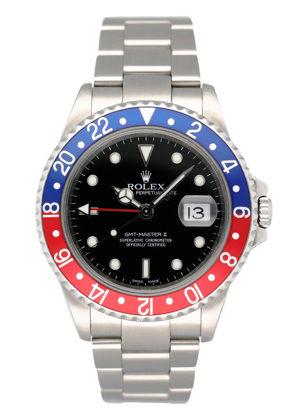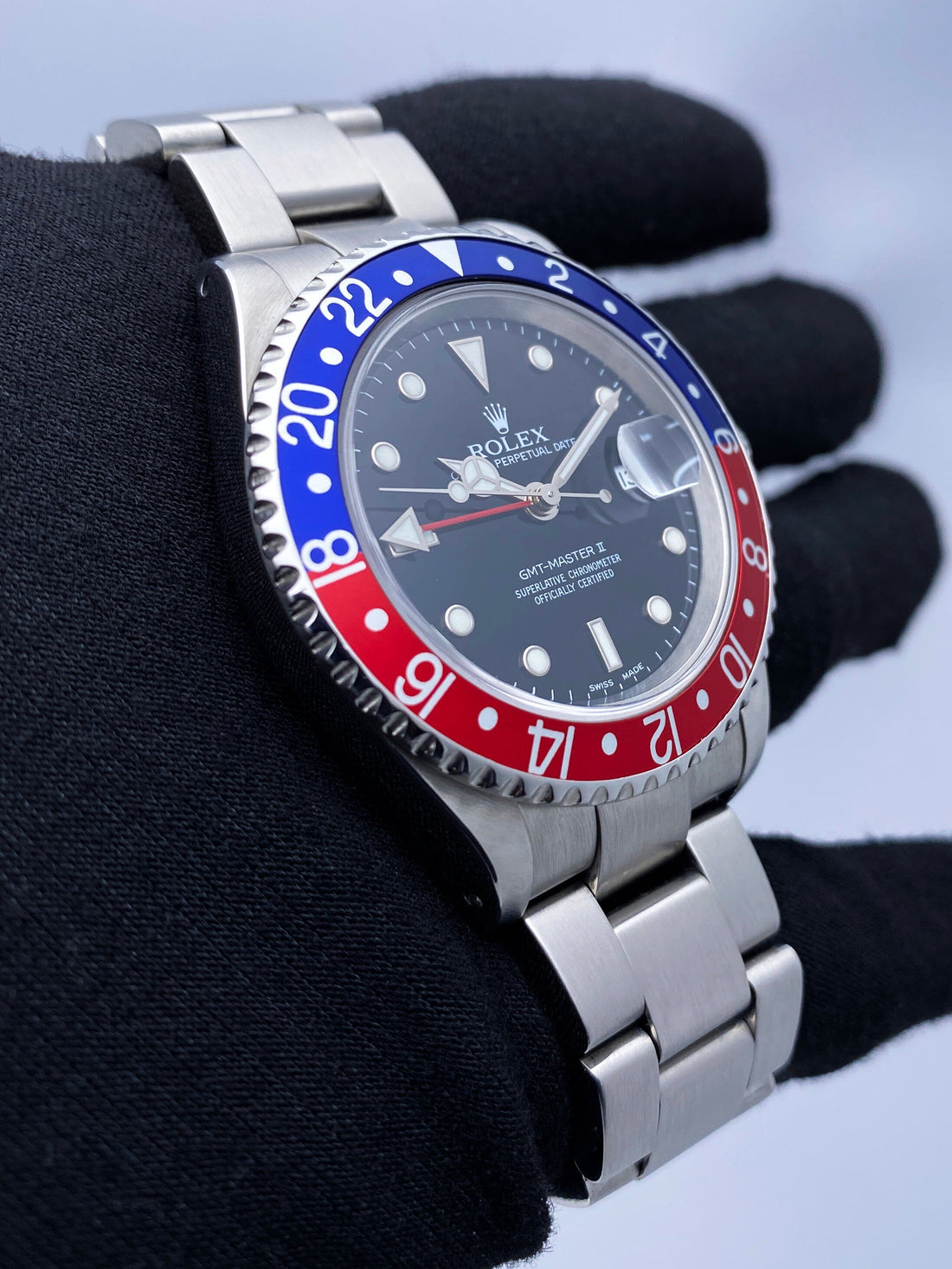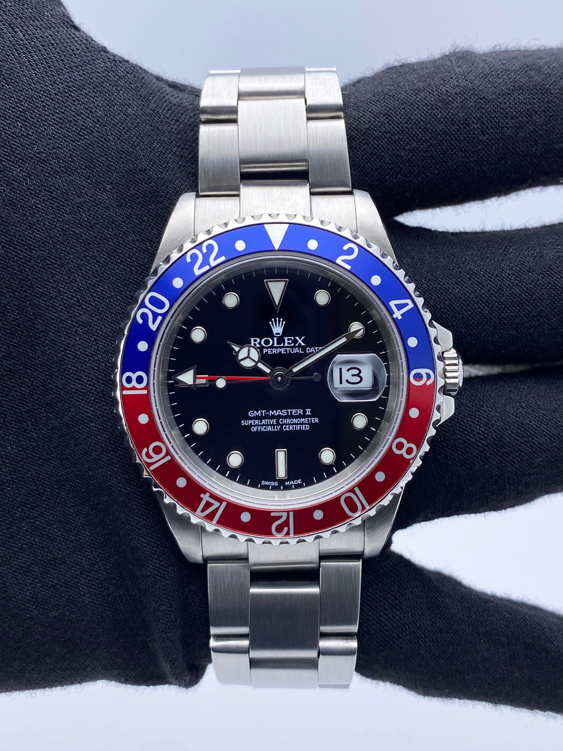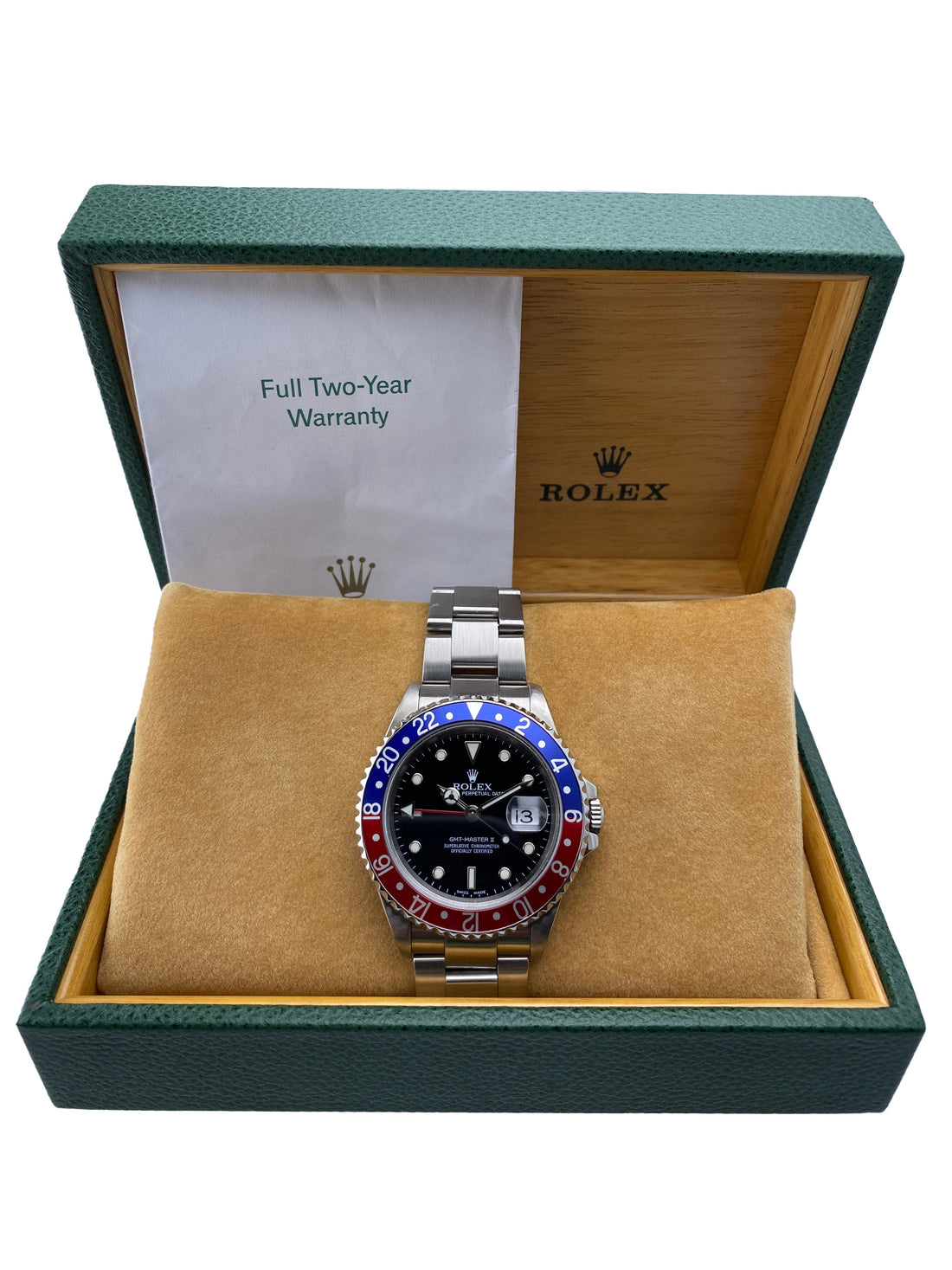 Rolex GMT Master II 16710 Mens Watch. 40mm stainless steel case. Bidirectional rotating stainless steel bezel with blue and red bezel insert. Black dial with luminous steel hands and index hour markers. Minute markers on the outer dial. Date display at the 3 o'clock position. Stainless steel Oyster bracelet with fold over clasp with safety. Will fit up to a 7.5-inch wrist. Sapphire crystal. Stainless steel case back. Automatic self-winding movement. This watch comes with original Box and Papers.