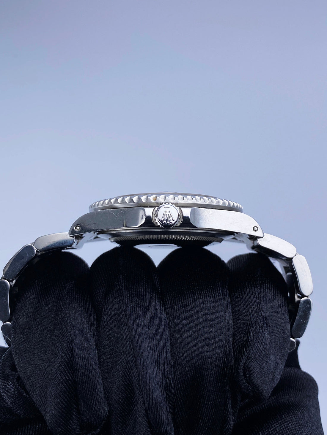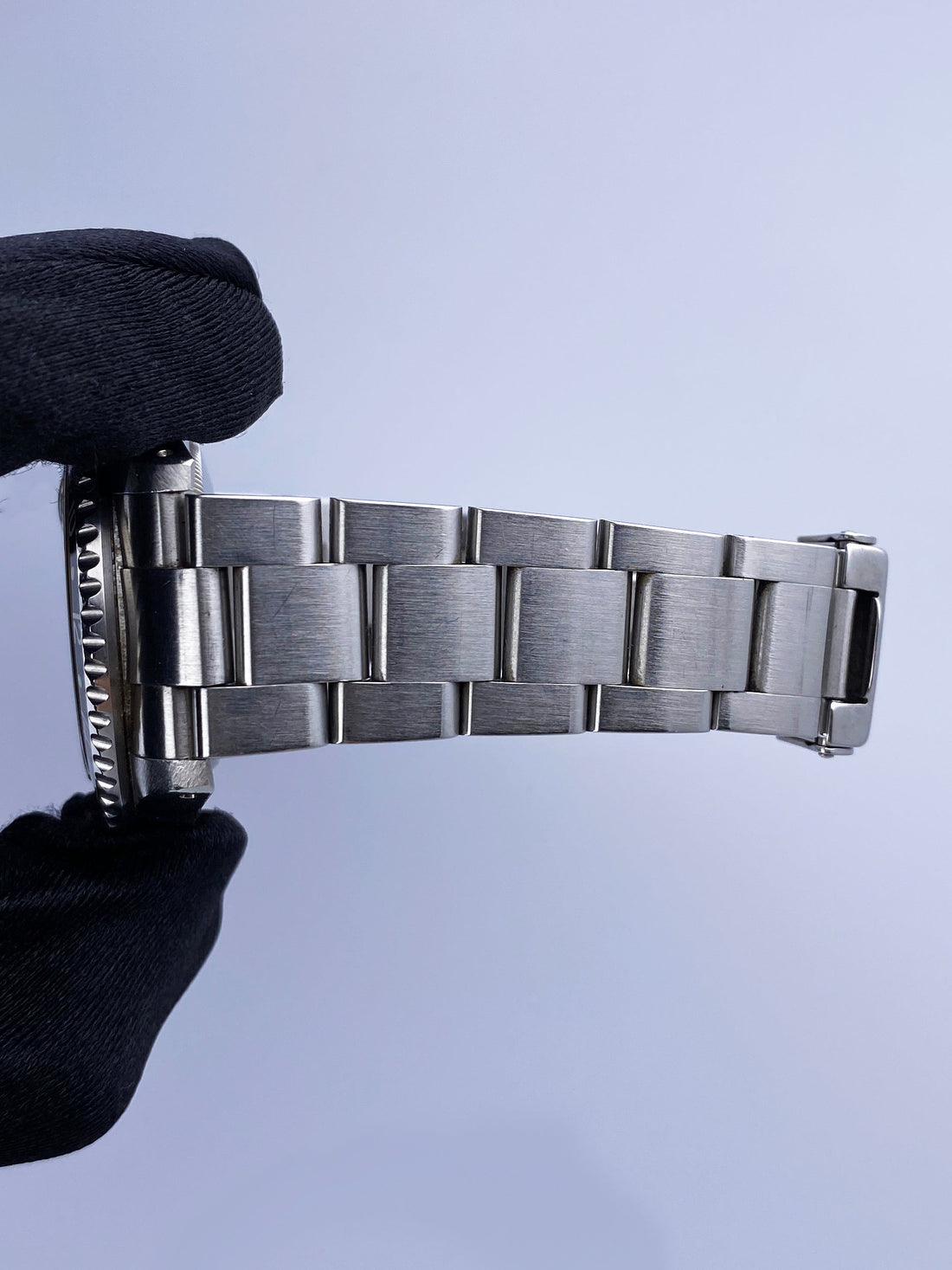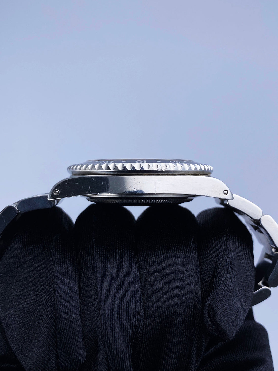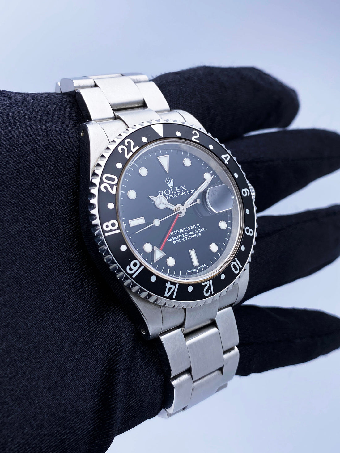 Rolex Oyster Perpetual Date GMT Master II 16710 Men Watch. 40mm stainless steel case. Stainless steel bidirectional bezel with black bezel insert. Black dial with luminous steel hands and index, dot hour markers. Minute markers on the outer dial. Date display at the 3 o'clock position. Stainless steel Oyster bracelet with fold over clasp with safety. Will fit up to 6.5-inch wrist. Sapphire Crystal. Stainless steel case back. Calibre 3185 Automatic self-winding chronometer movement with a 50-hour power reserve.