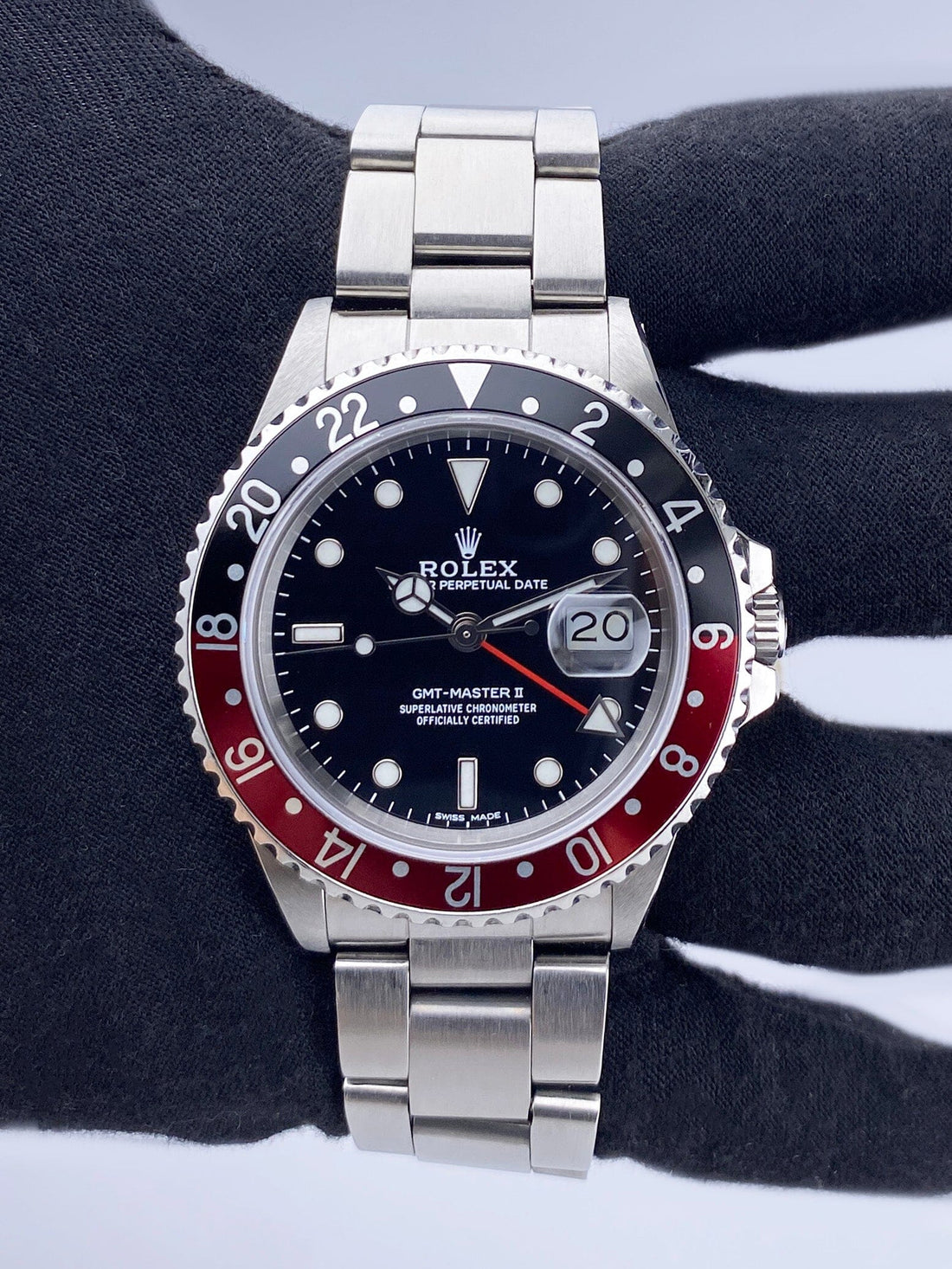 Rolex GMT Master II 16760 "Coke Fat Lady" Mens Watch. 40mm stainless steel case. Bidirectional rotating stainless steel bezel with black and red bezel insert. Black dial with luminous steel hands and index hour markers. Minute markers on the outer dial. Date display at the 3 o'clock position. Stainless steel Oyster bracelet with fold over clasp with safety. Will fit up to a 7-inch wrist. Sapphire crystal. Stainless steel case back. Automatic self-winding movement.