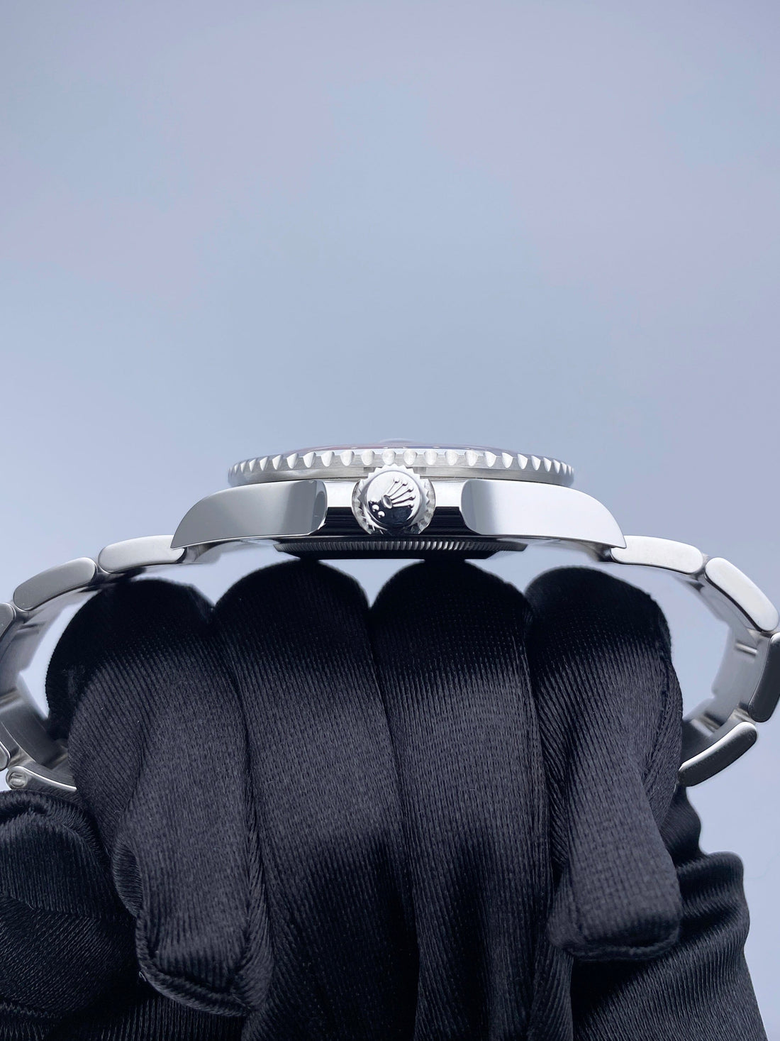 Rolex Oyster Perpetual Date GMT-Master II 126710BLRO Mens Watch. 40mm stainless steel case. Bidirectional rotating red and blue ceramic bezel insert. Black dial with luminous steel hands and dot hour markers. Minute maker on the outer dial. Date display at the 3 o'clock position. Stainless steel Jubilee bracelet with stainless steel fold over clasp with safety. Will fit up to a 7.5-inch wrist. Automatic self-winding movement.