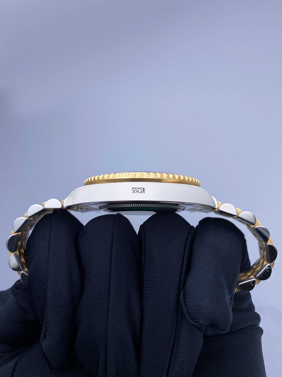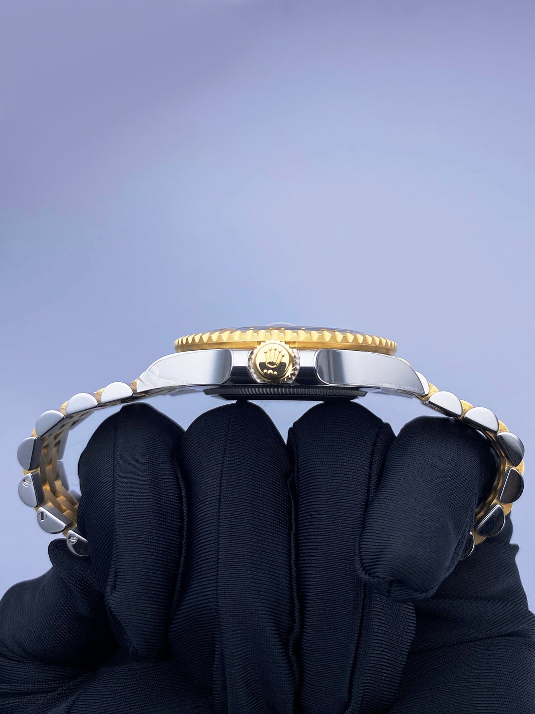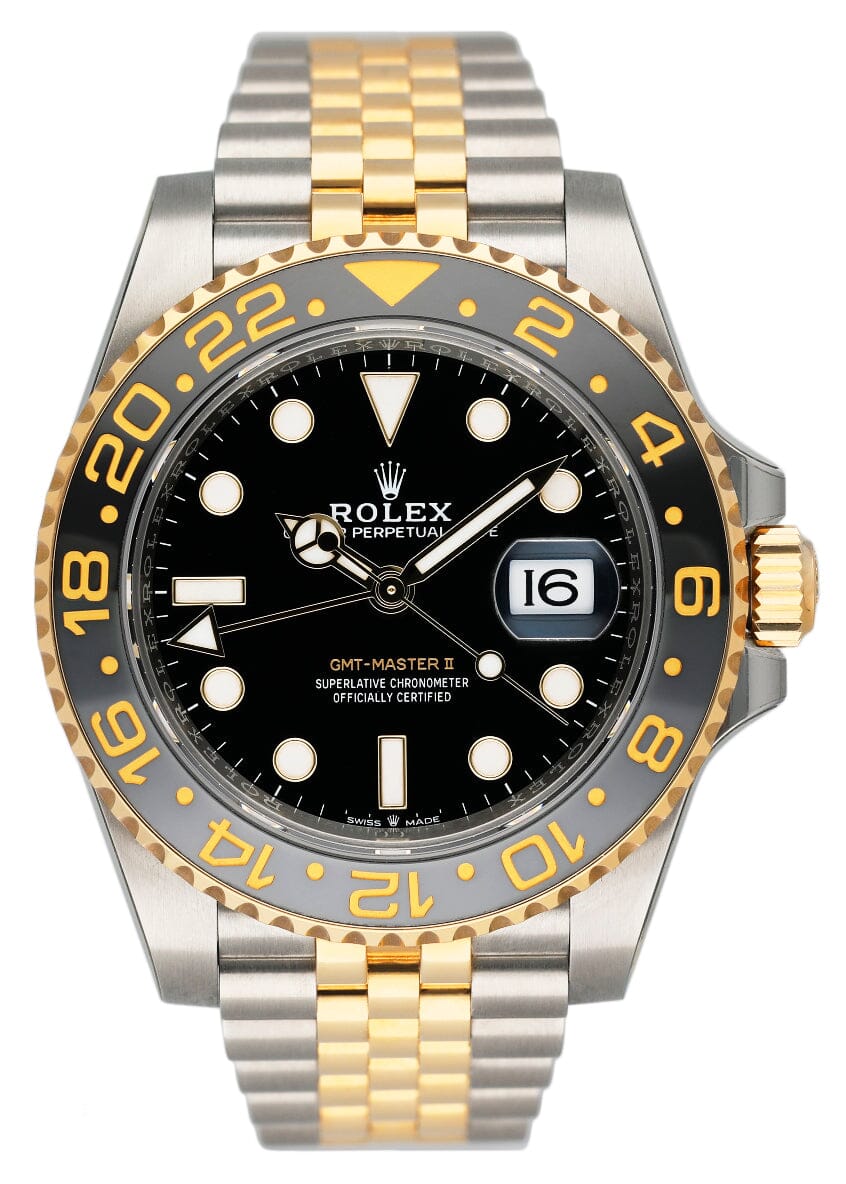 Rolex Oyster Perpetual Date GMT Master ll 126713GRNR Mens Watch. 40mm stainless steel case. Bi-directional rotating 18K yellow gold bezel with a black aluminum bezel insert. Black dial with Mercedes gold hands and dot hour markers. Minute markers around the outer dial. The date is displayed at the 3 o'clock position. Stainless steel & 18K yellow gold Jubilee bracelet with fold over clasp with safety. Will fit up to a 7.5-inch wrist. Sapphire crystal. Stainless steel case back. Automatic self-winding movement with 70-hour power reserve. This watch cover with original sticker. This watch comes with original Box and Papers.