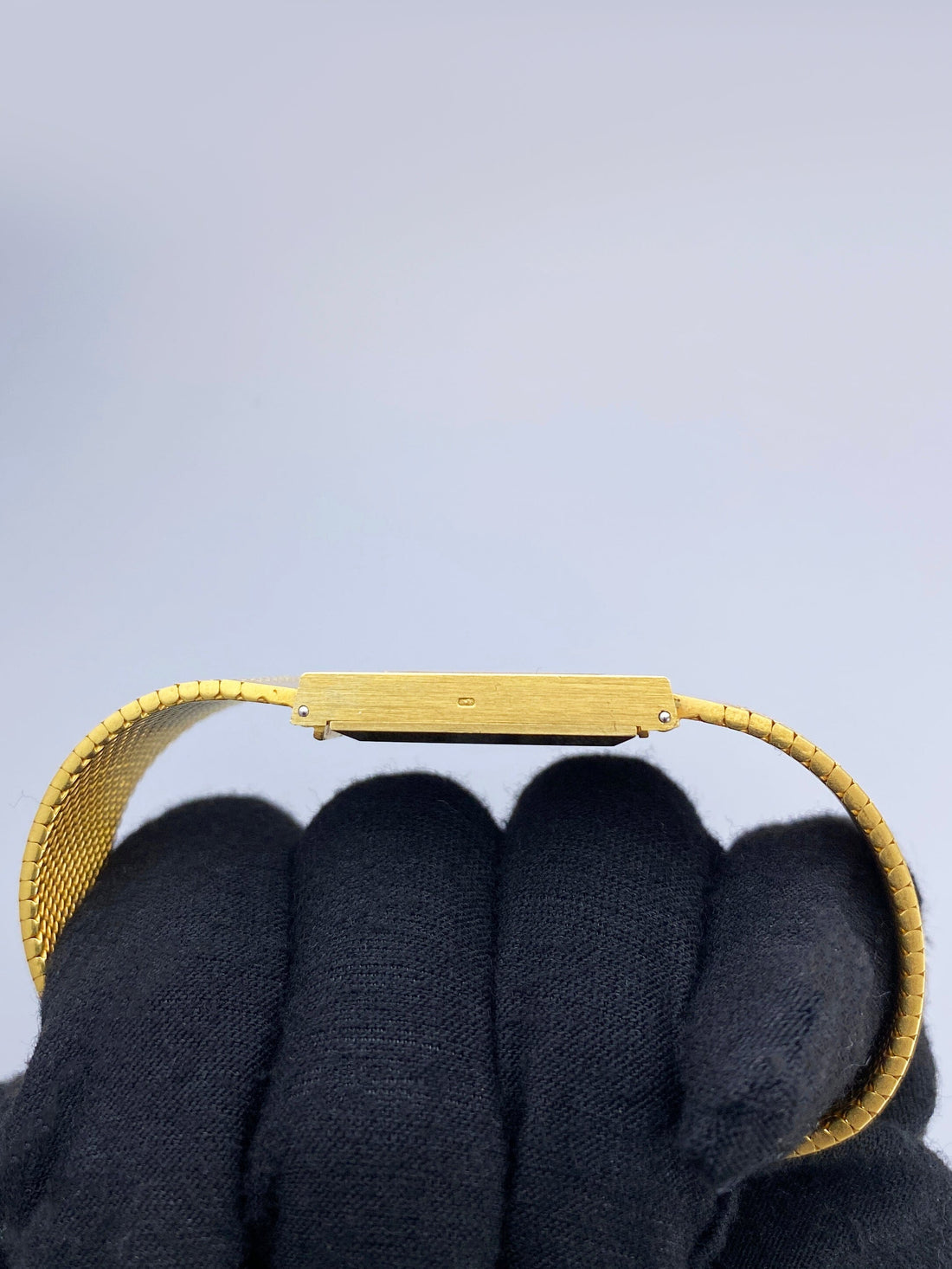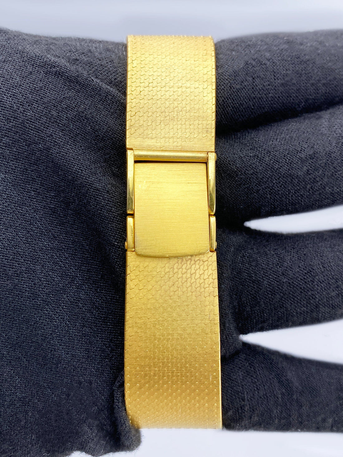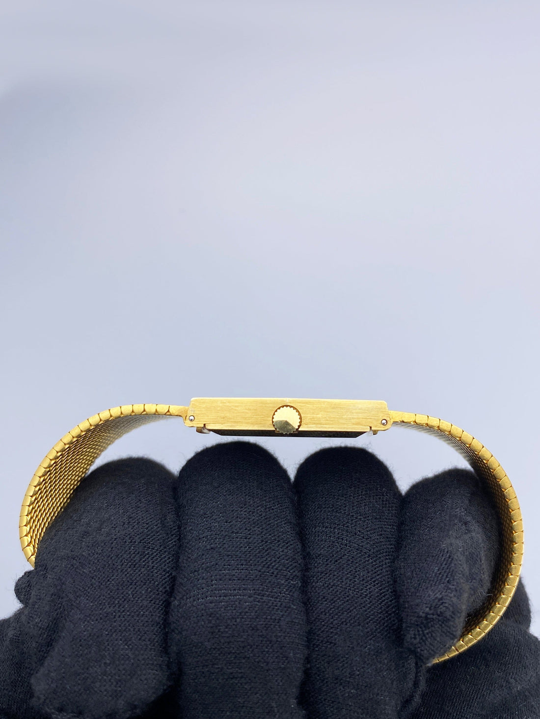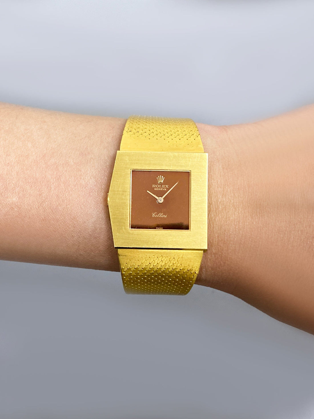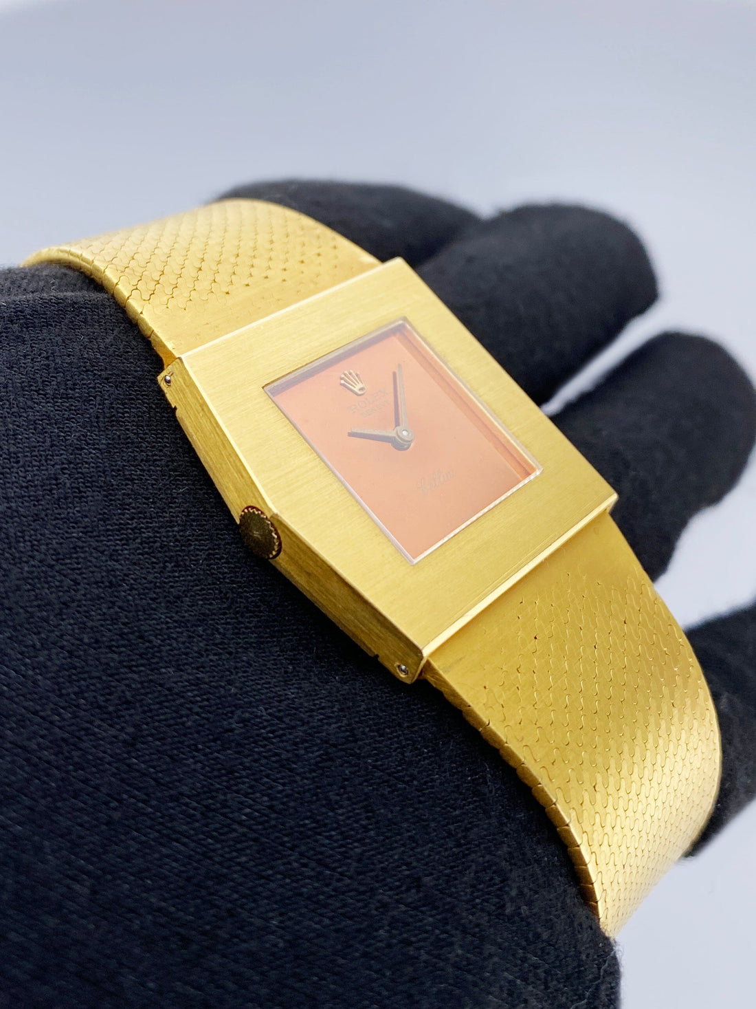 Rolex King Midas Cellini Ladies Watch. 28mm yellow gold pentagon sharp case. Red dial with gold hands. Minute markers on the inner dial. Yellow gold mesh bracelet with jewelry clasp. Will fit up to a 6.75-inch wrist. Sapphire crystal. Stainless steel case back. Mechanical hand-winding movement.