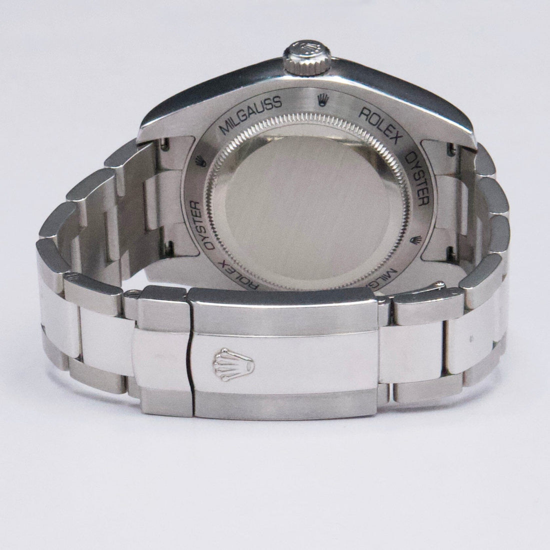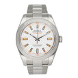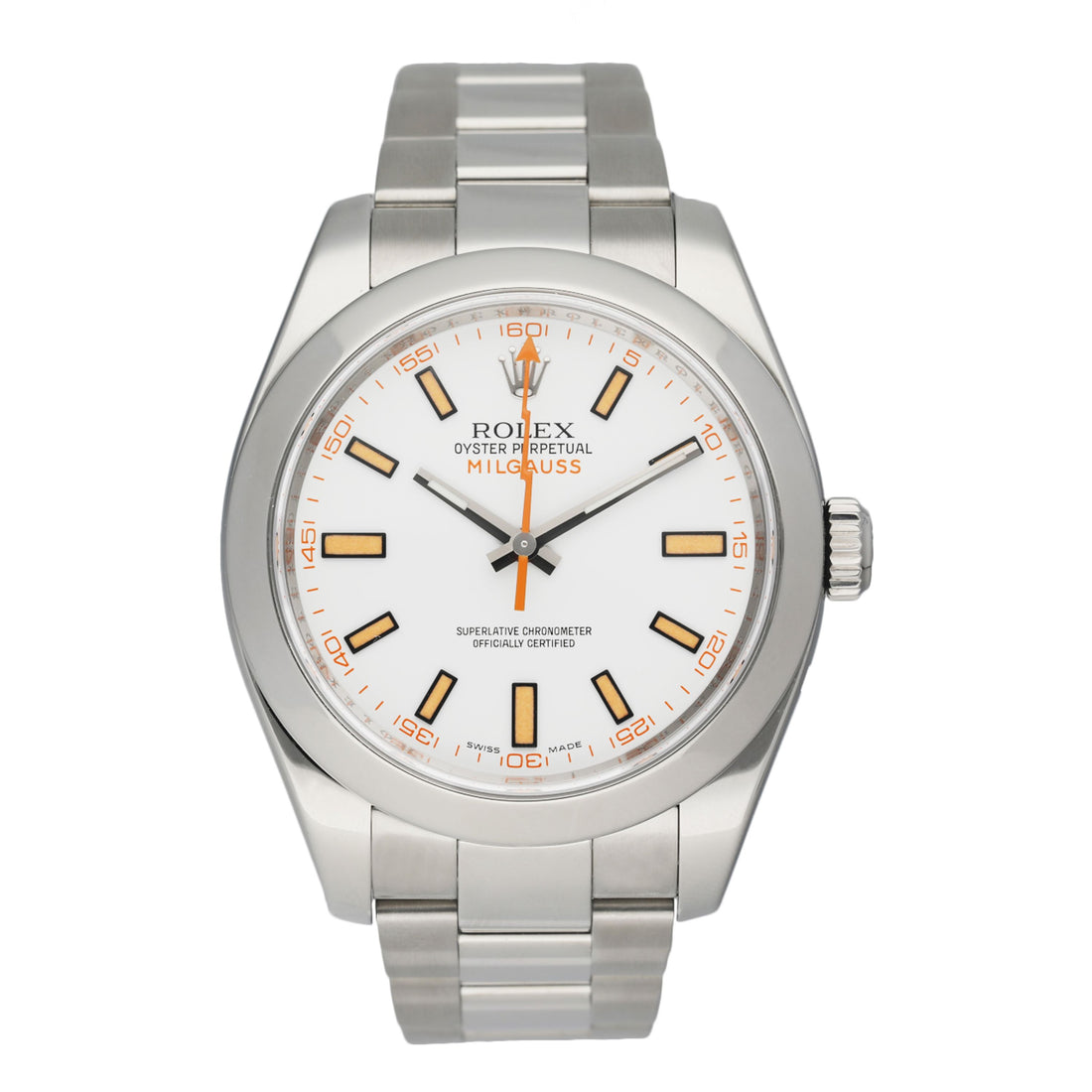 Rolex Milgauss 116400 Mens Watch. 40mm stainless steel case. Stainless steel smooth bezel. White dial with luminous silver-tone hands and index hour markers. Orange lighting shape second hand. Minute markers around the outer dial. Stainless steel Oyster bracelet with fold over clasp. Will fit up to a 7-inch wrist. Sapphire crystal. Stainless steel case back. Automatic self-winding movement. This watch comes with original Box and Papers.