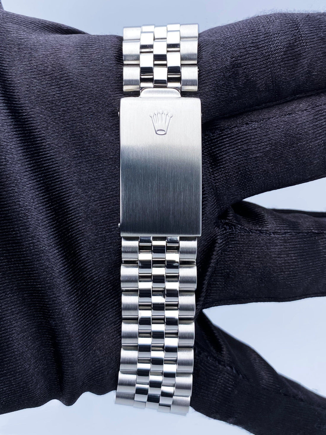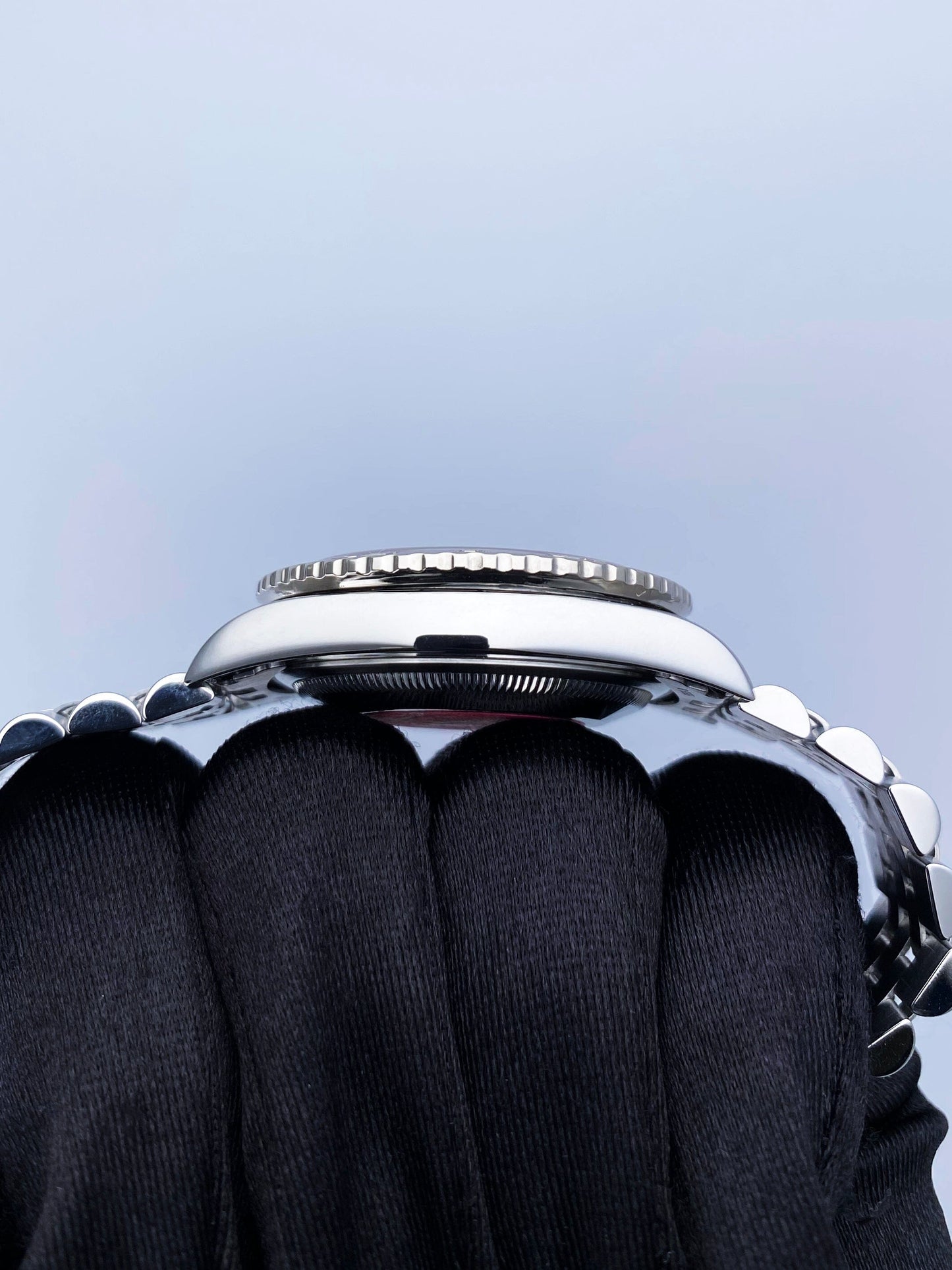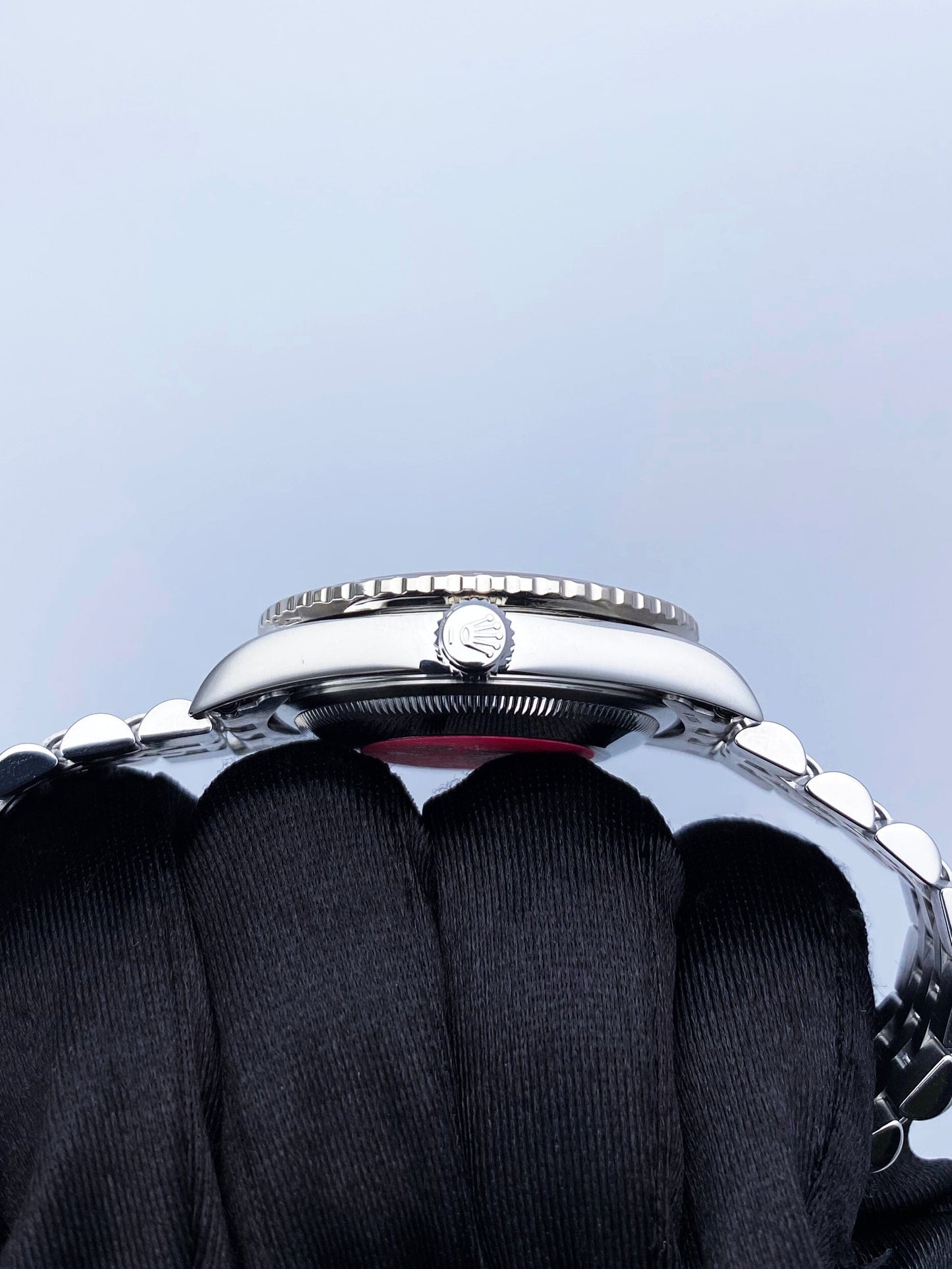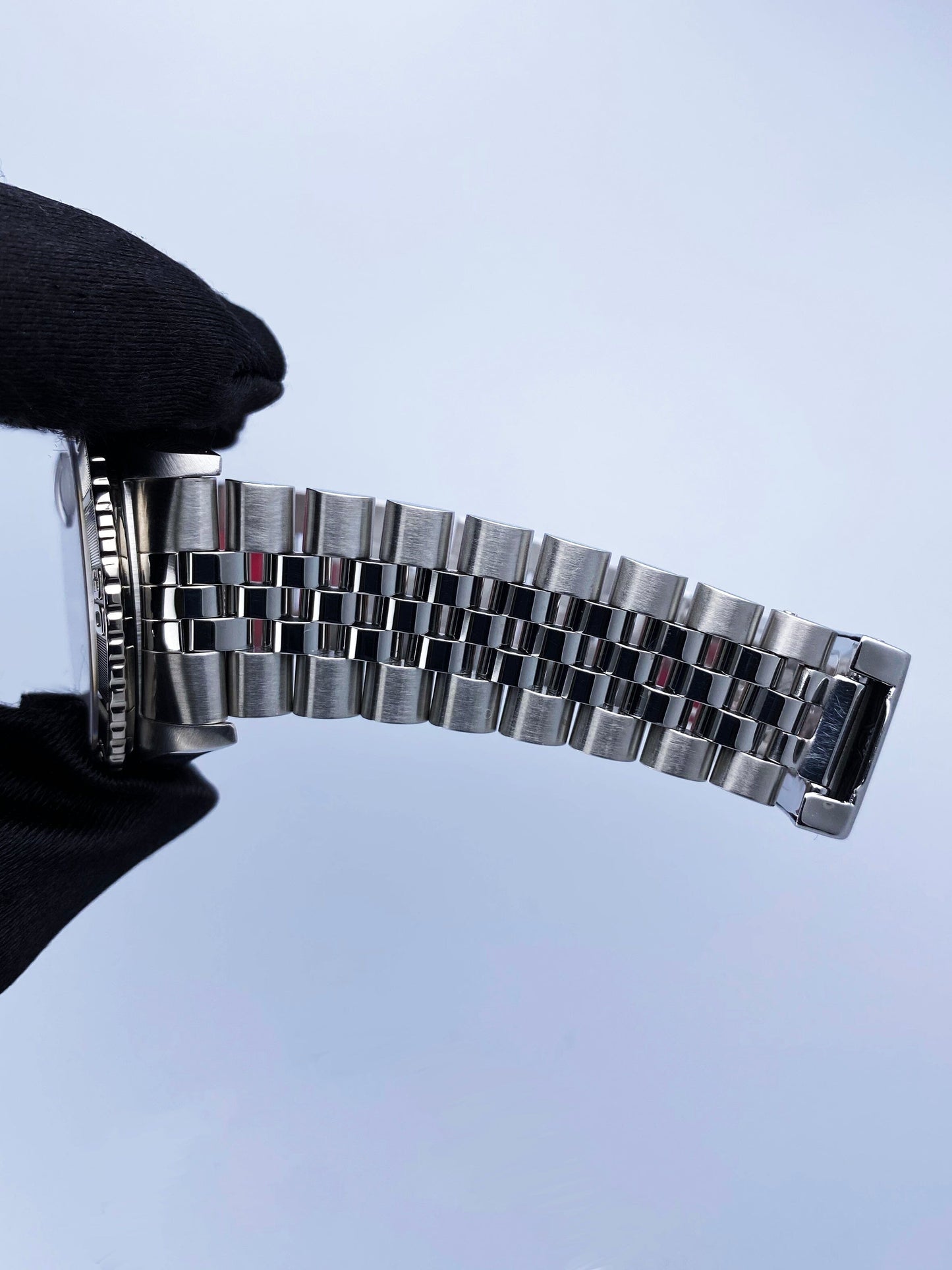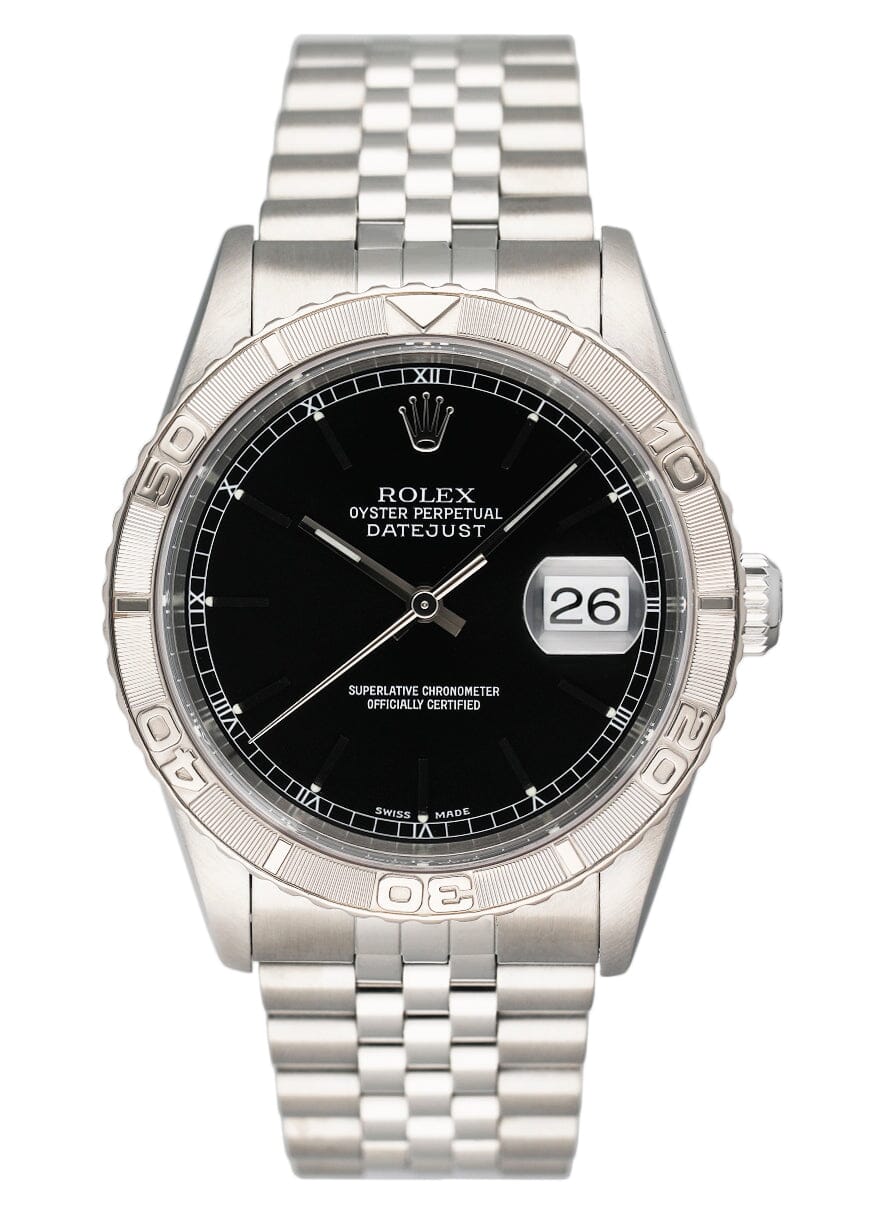 Rolex Datejust Turn-O-Graph 116264 Mens Watch. 36mm stainless steel case. Bi-direction rotate 18K white gold bezel. Black dial with luminous steel hands and index hour marker. Date display at a 3 o'clock position. Stainless steel Jubilee bracelet with fold over clasp. Will fit up to a 7-Inch wrist. Sapphire crystal. Stainless steel case back. Automatic self-winding movement.