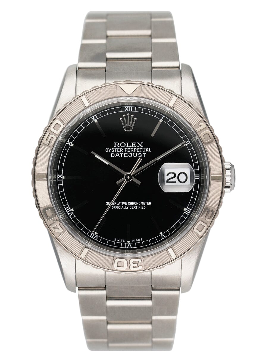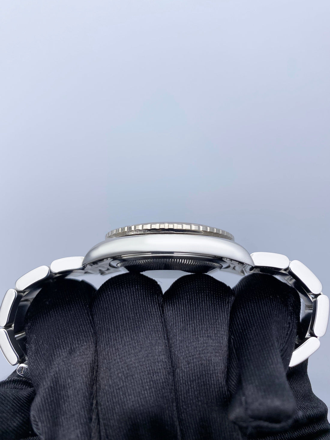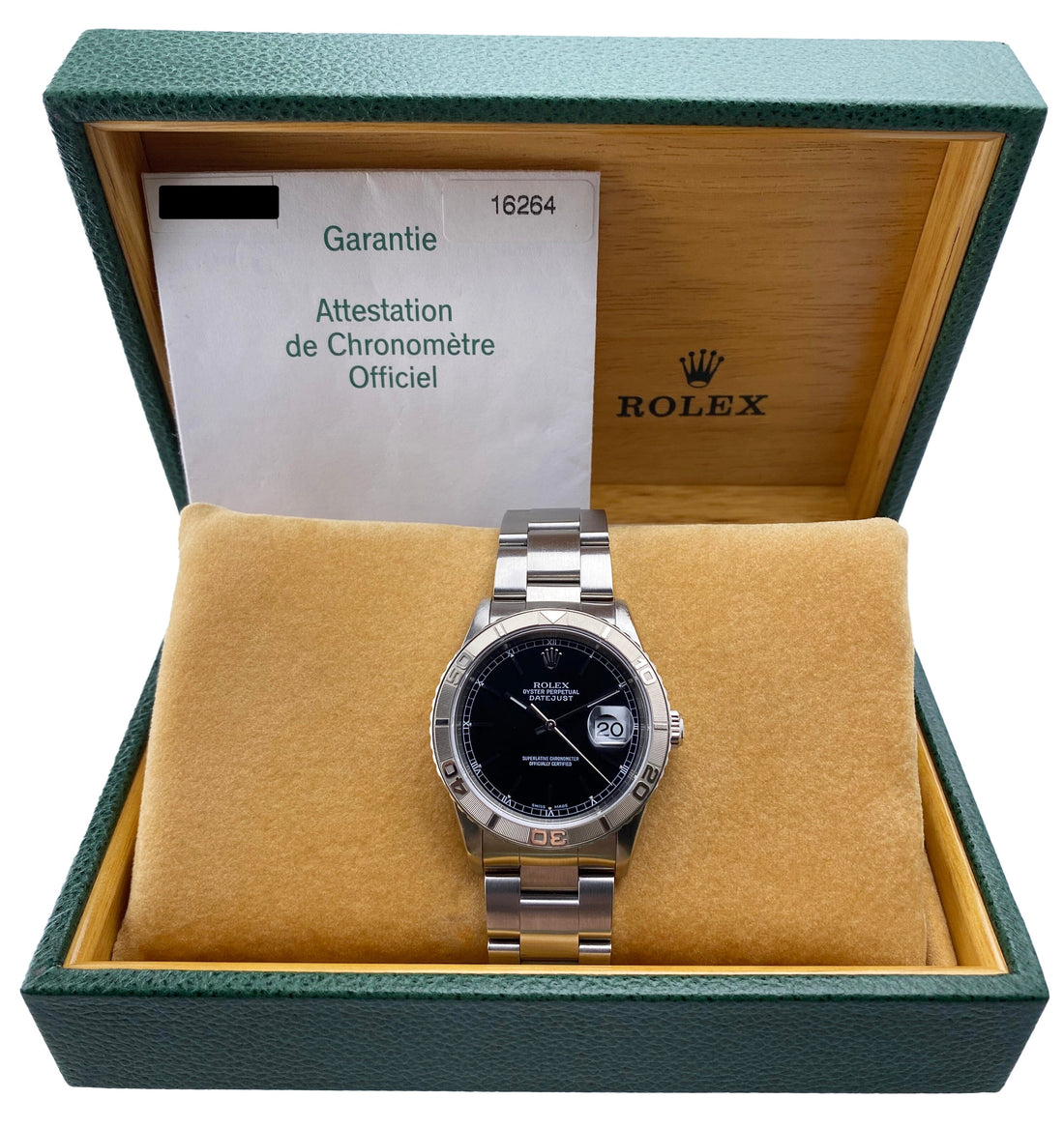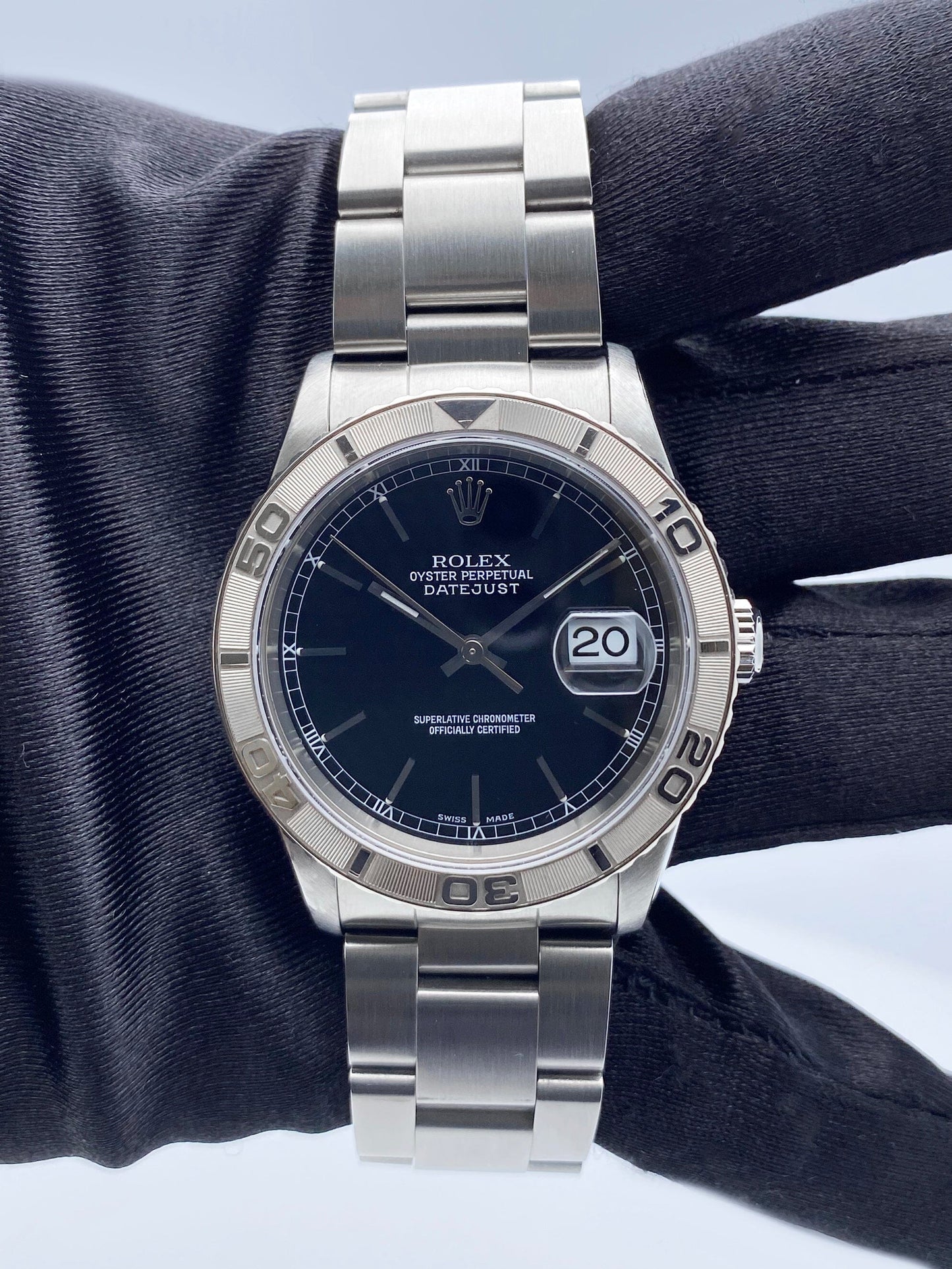 Rolex Datejust Turn-O-Graph 116264 Mens Watch. 36mm stainless steel case. Bi-direction rotate 18K white gold bezel. Black dial with luminous steel hands and index hour marker. Date display at a 3 o'clock position. Stainless steel Oyster bracelet with fold over clasp. Will fit up to a 7-Inch wrist. Sapphire crystal. Stainless steel case back. Automatic self-winding movement. This watch comes with original Box and Papers.