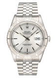 Rolex Datejust Turn-O-Graph 16264 Mens Watch. 36mm stainless steel case. Bi-direction rotate 18K white gold bezel. Silver dial with luminous steel hands and index hour marker. Date display at a 3 o'clock position. Stainless steel Jubilee bracelet with fold over clasp. Will fit up to a 7-Inch wrist. Sapphire crystal. Stainless steel case back. Automatic self-winding movement.