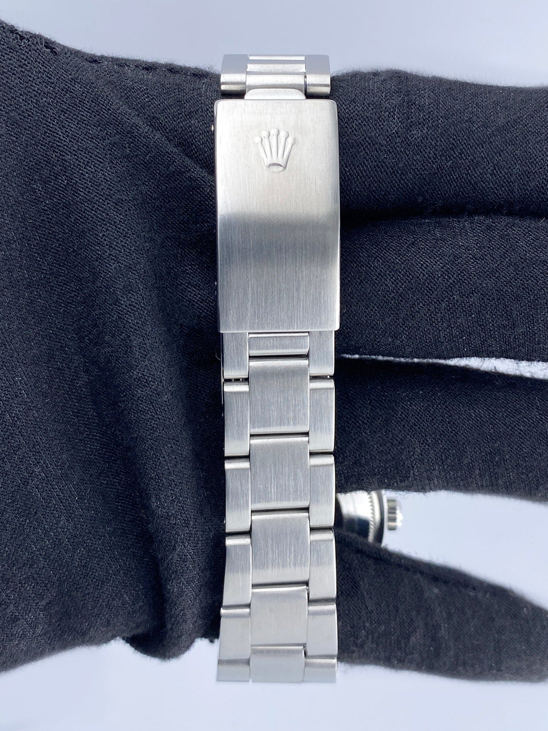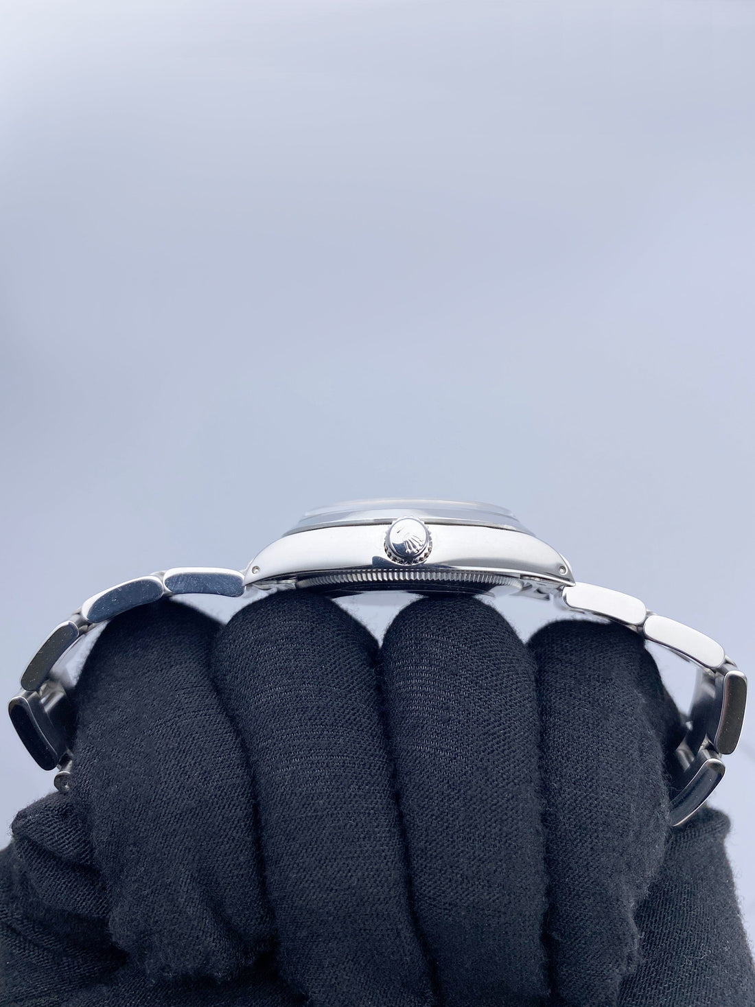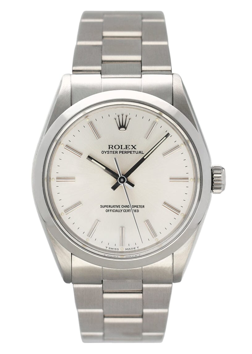 Rolex Oyster Perpetual 1002 Mens Watch. 34mm stainless steel case. Stainless steel smooth bezel. Silver dial with luminous steel hands and index hour marker. Minute marker around the outer dial. Stainless steel Oyster bracelet with stainless steel fold over clasp. Will fit up to 7.5-Inch wrist. Sapphire crystal. Stainless steel case back. Automatic self-winding movement.