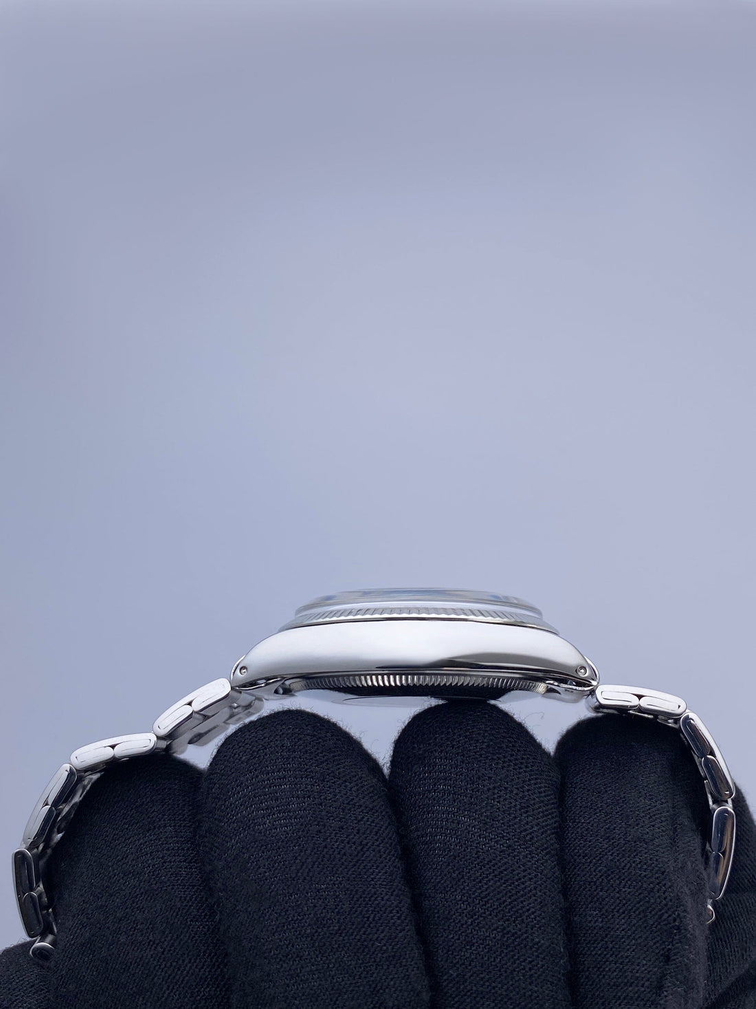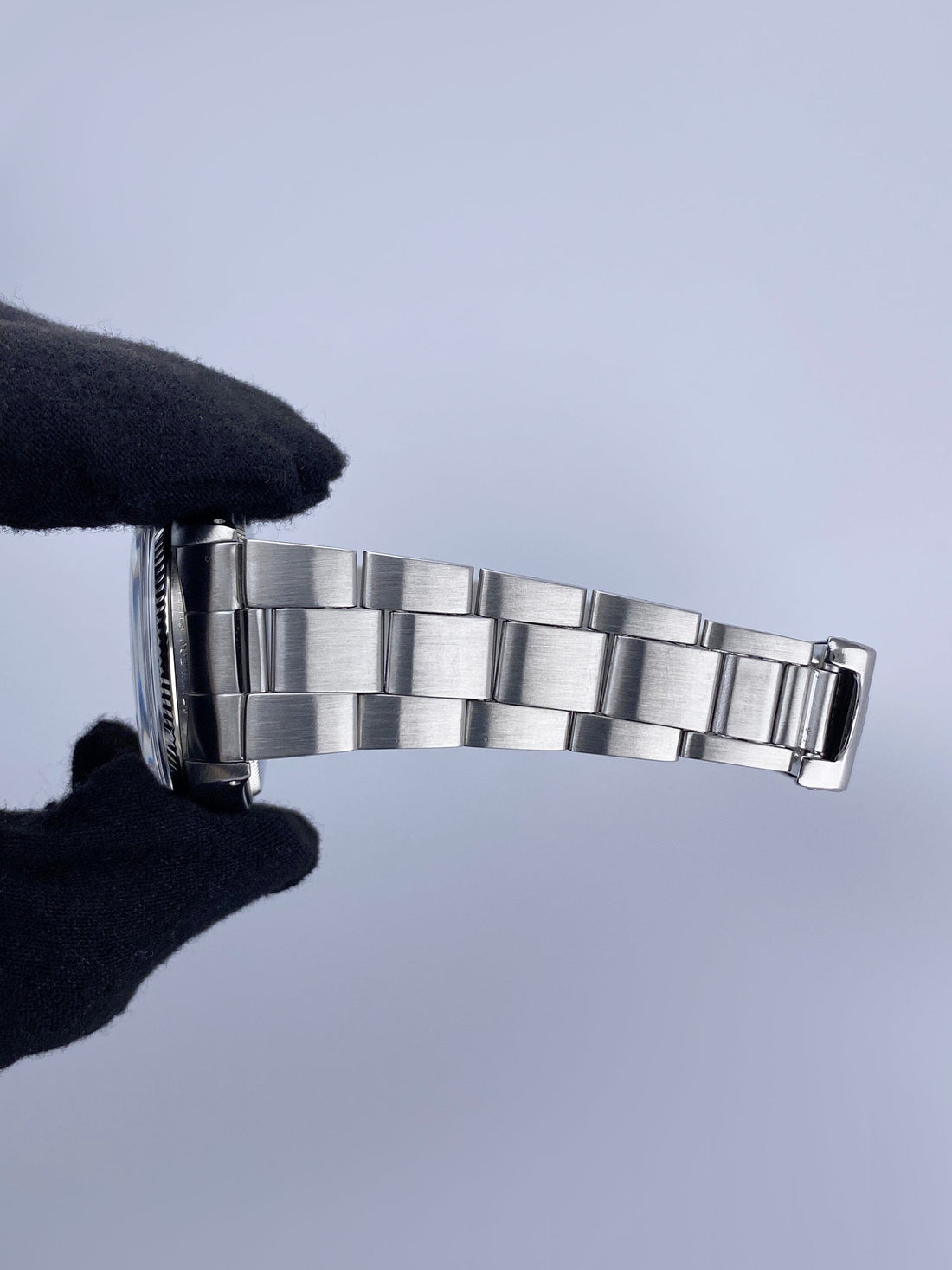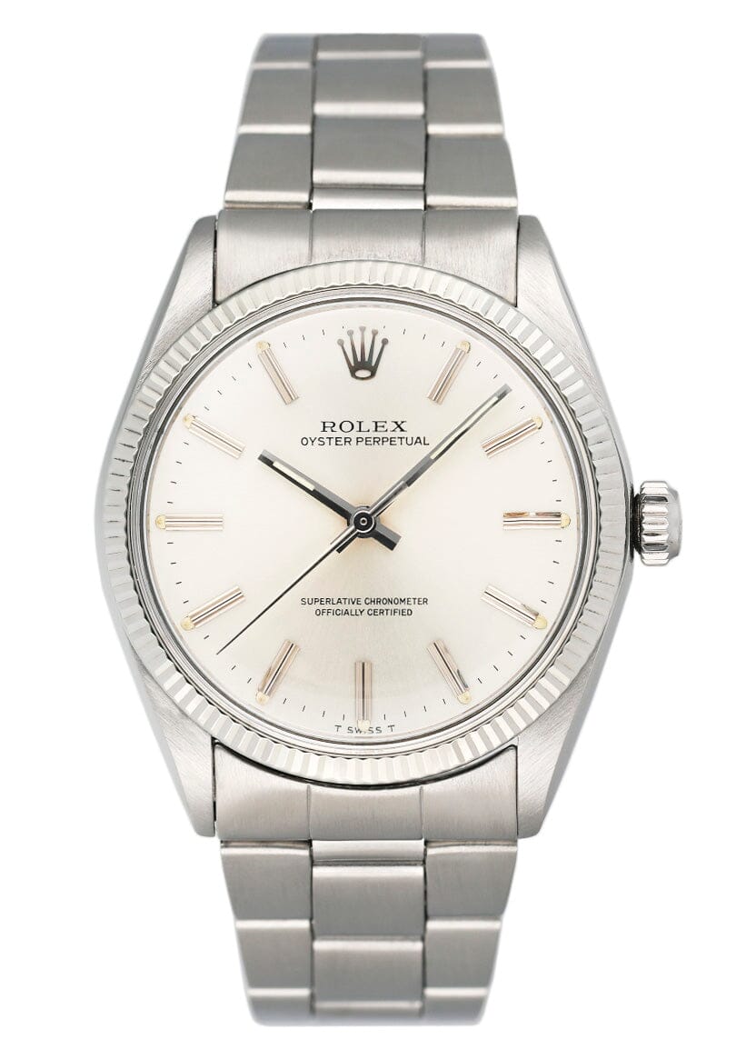 Rolex Oyster Perpetual 1005 Mens Watch. 34mm stainless steel case. Stainless steel fluted bezel. Silver dial with steel hands and index hour markers. Stainless steel Oyster bracelet with fold over clasp. Will fit up to a 6.75-inch wrist. Acrylic crystal. Stainless steel case back. Automatic self-winding movement.