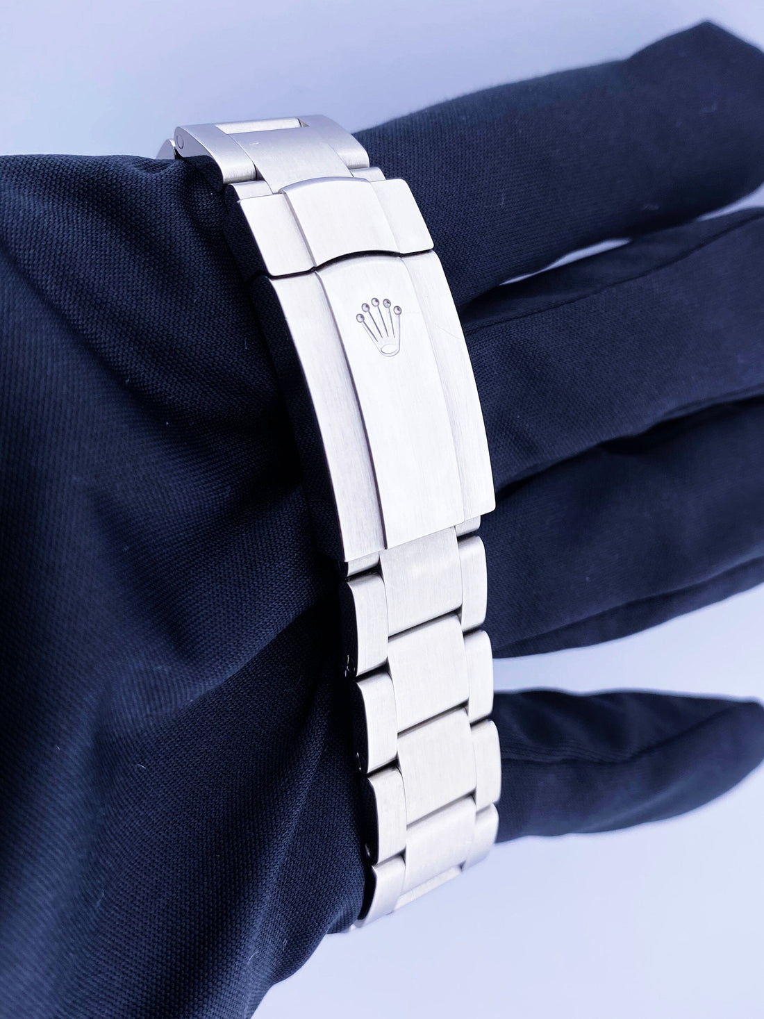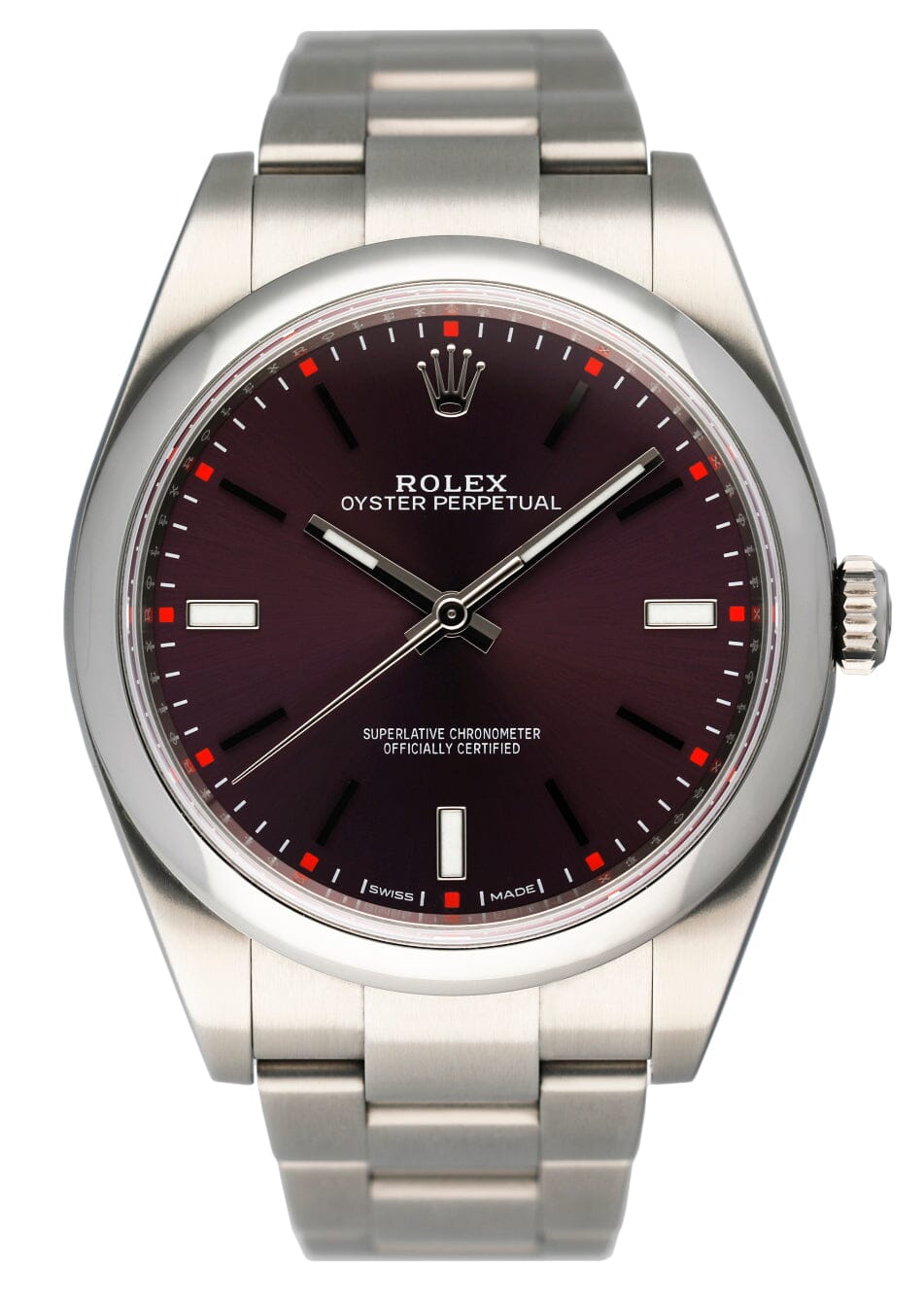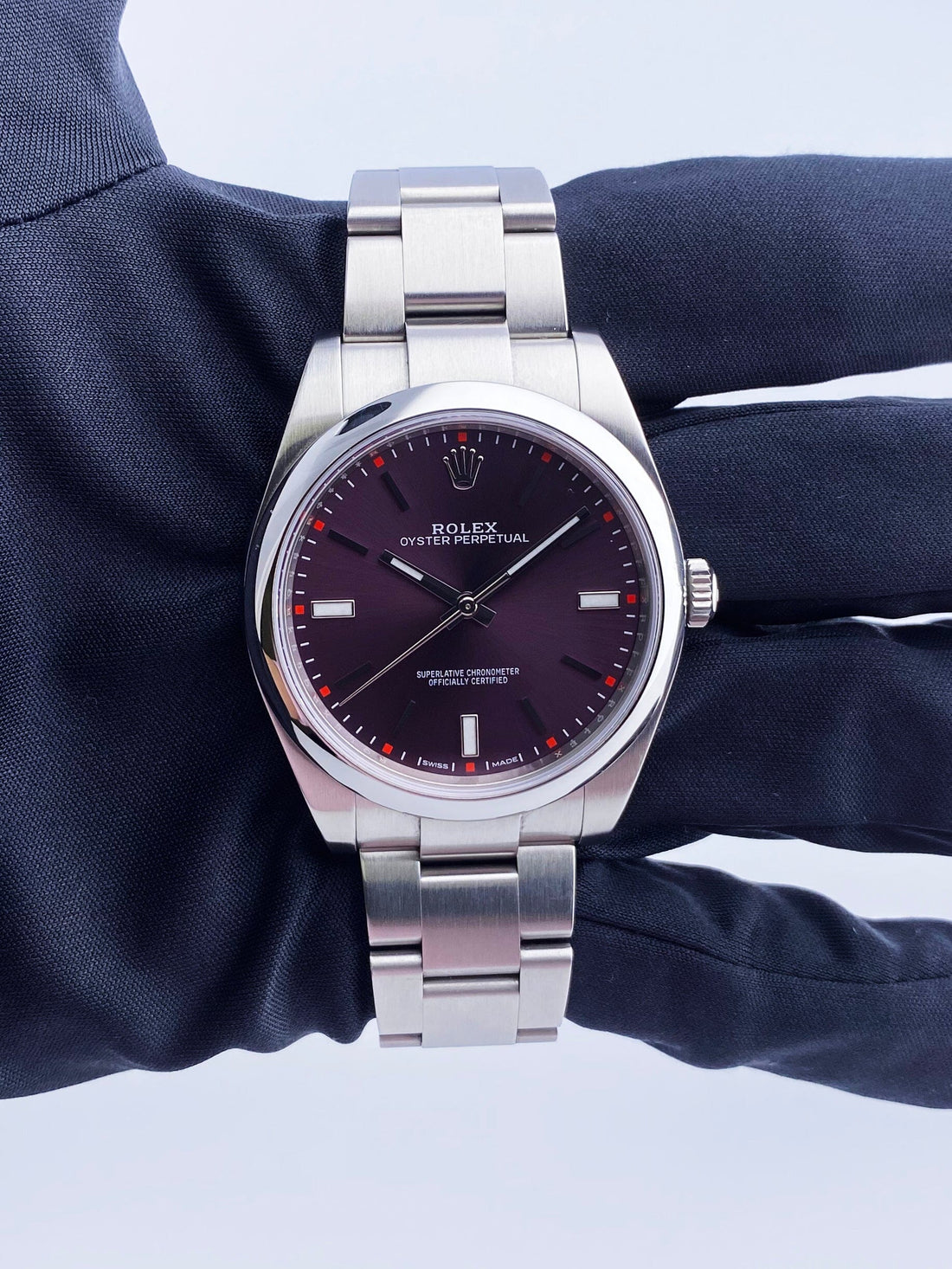 Rolex Oyster Perpetual 114300 Mens Watch. 39mm stainless steel case. Smooth stainless steel bezel. Red grape dial with steel hands and index hour markers. Stainless steel Oyster bracelet with fold over clasp. Will fit up to a 7-inch wrist. Sapphire crystal. Stainless steel case back. Caliber 3132 self-winding movement. This watch comes with original Box and Papers.