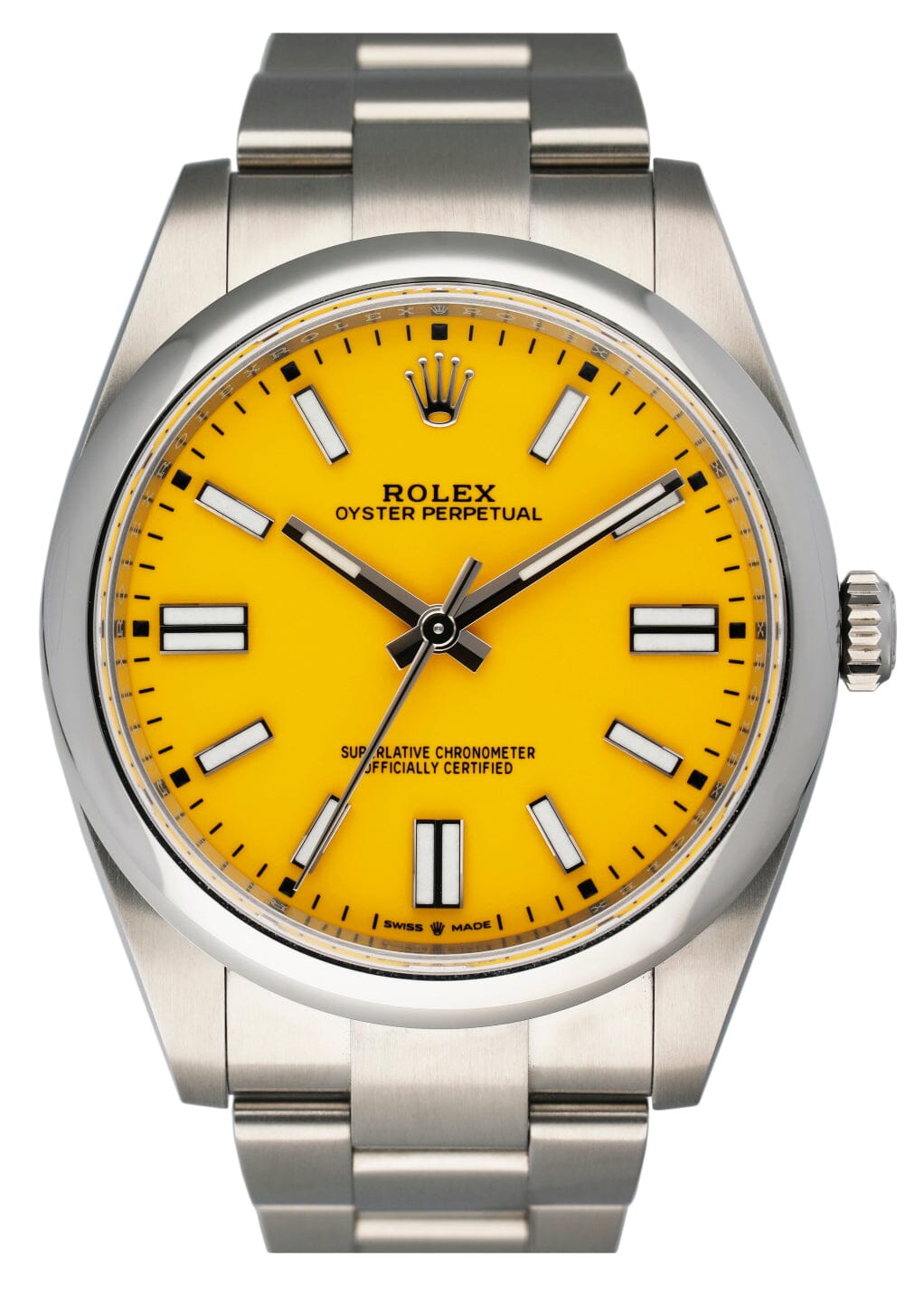 Rolex Oyster Perpetual 124300 Mens Watch. 41mm stainless steel case with smooth bezel. Yellow dial with luminous steel hands and index hour marker. Minute marker around the outer dial. Stainless steel Oyster bracelet with stainless steel fold over clasp. Will fit up to 7-Inch wrist. Sapphire crystal. Stainless steel case back. Automatic self-winding movement. This watch comes with Box and Papers.