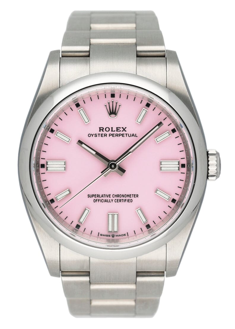 Rolex Oyster Perpetual 126000 Ladies Watch. 36mm stainless steel case with stainless steel smoothed bezel. Pink dial with steel hands and index hour markers. Minute marker around the outer dial. Stainless steel Oyster bracelet with fold over clasp. Will fit up to a 7.5-Inch wrist. Sapphire crystal. Stainless steel case back. Automatic self-winding movement. This watch comes with original Box and Papers.