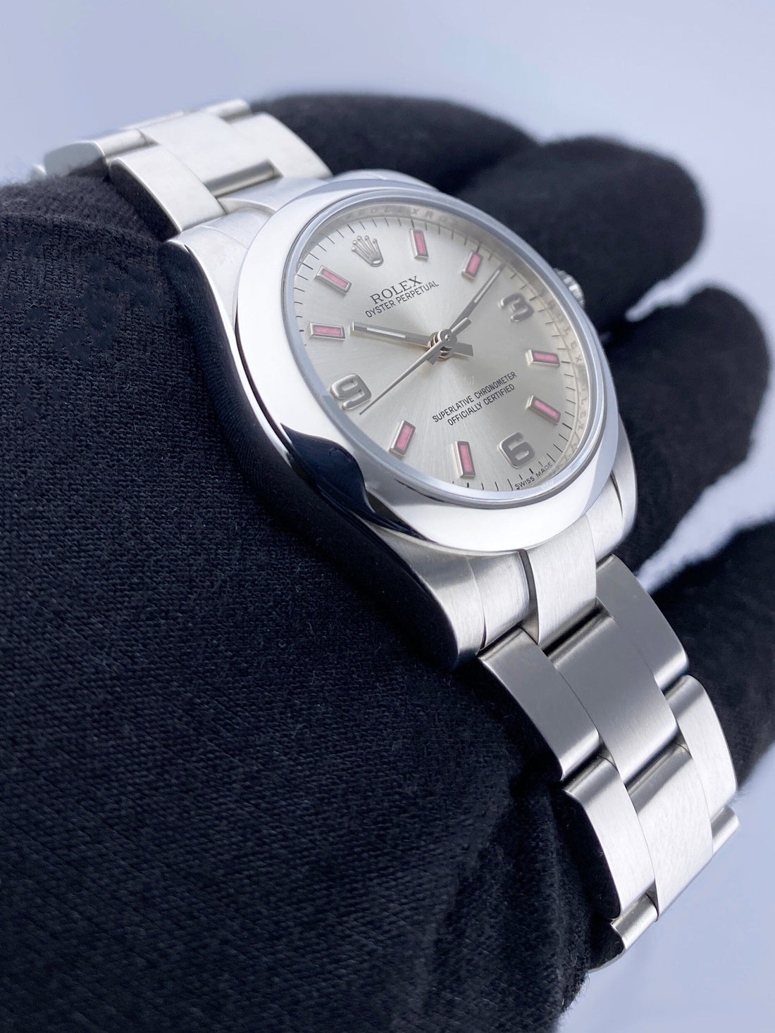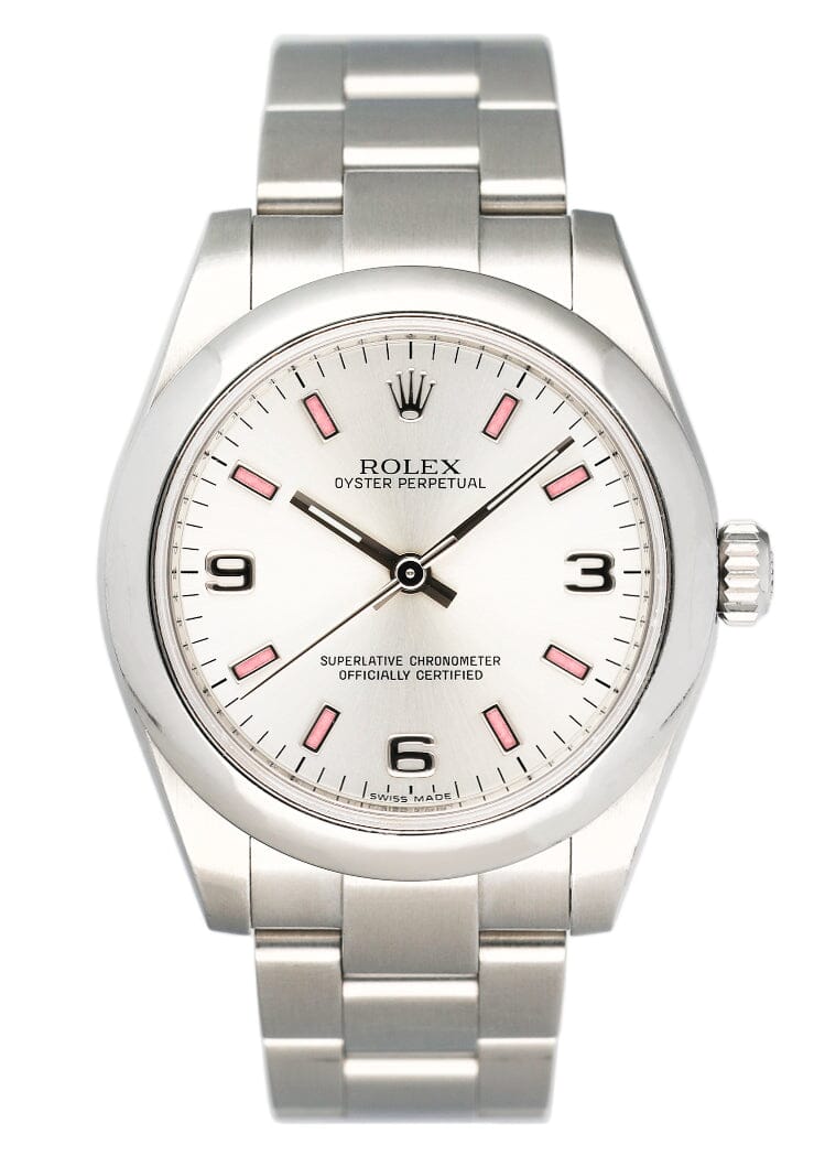 Rolex Oyster Perpetual 177200 Ladies Watch. 31mm stainless steel case. Stainless steel smooth bezel. Silver dial with luminous steel hands and Arabic numeral and pink index hour marker. Minute marker around the outer dial. Stainless steel Oyster bracelet with stainless steel fold over clasp. Will fit up to 6.5-Inch wrist. Sapphire crystal. Stainless steel case back. Automatic self-winding movement. This watch comes with original Box and Papers.