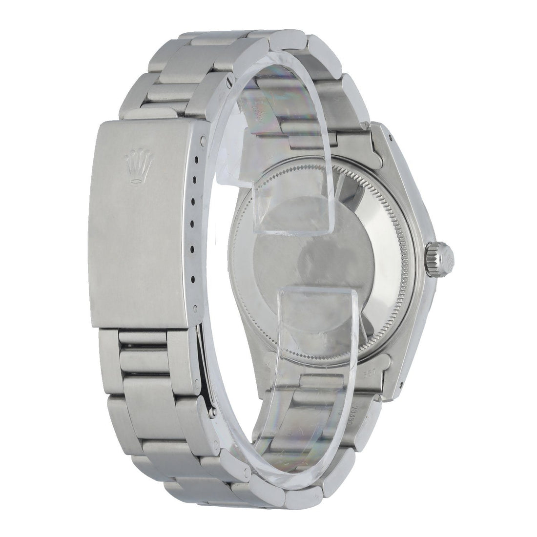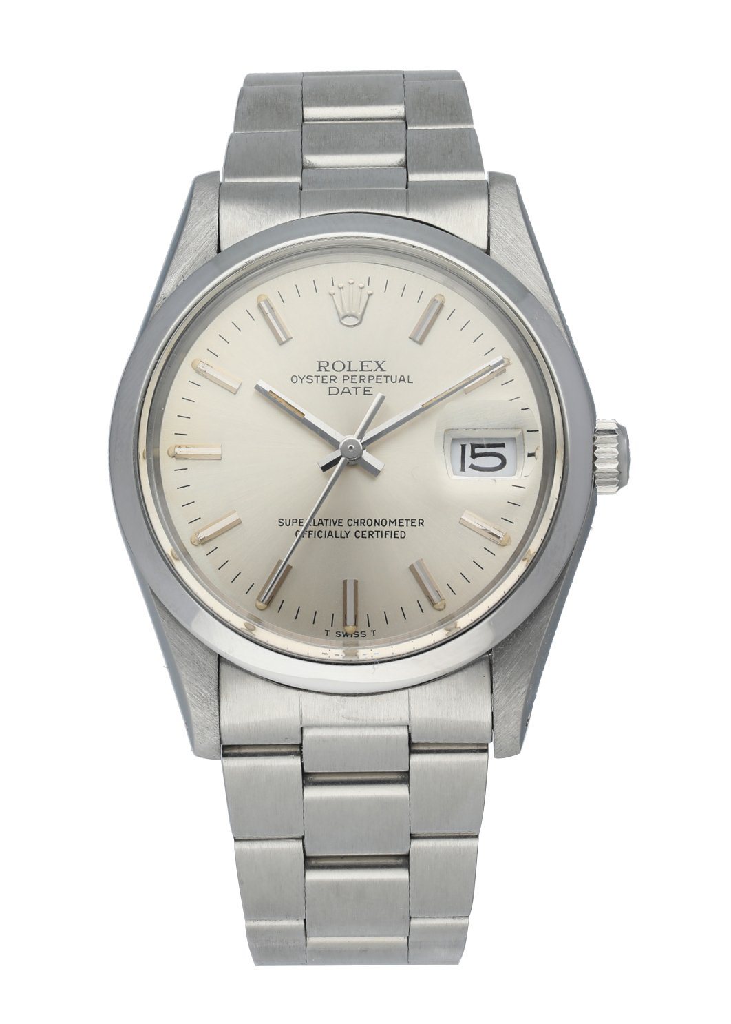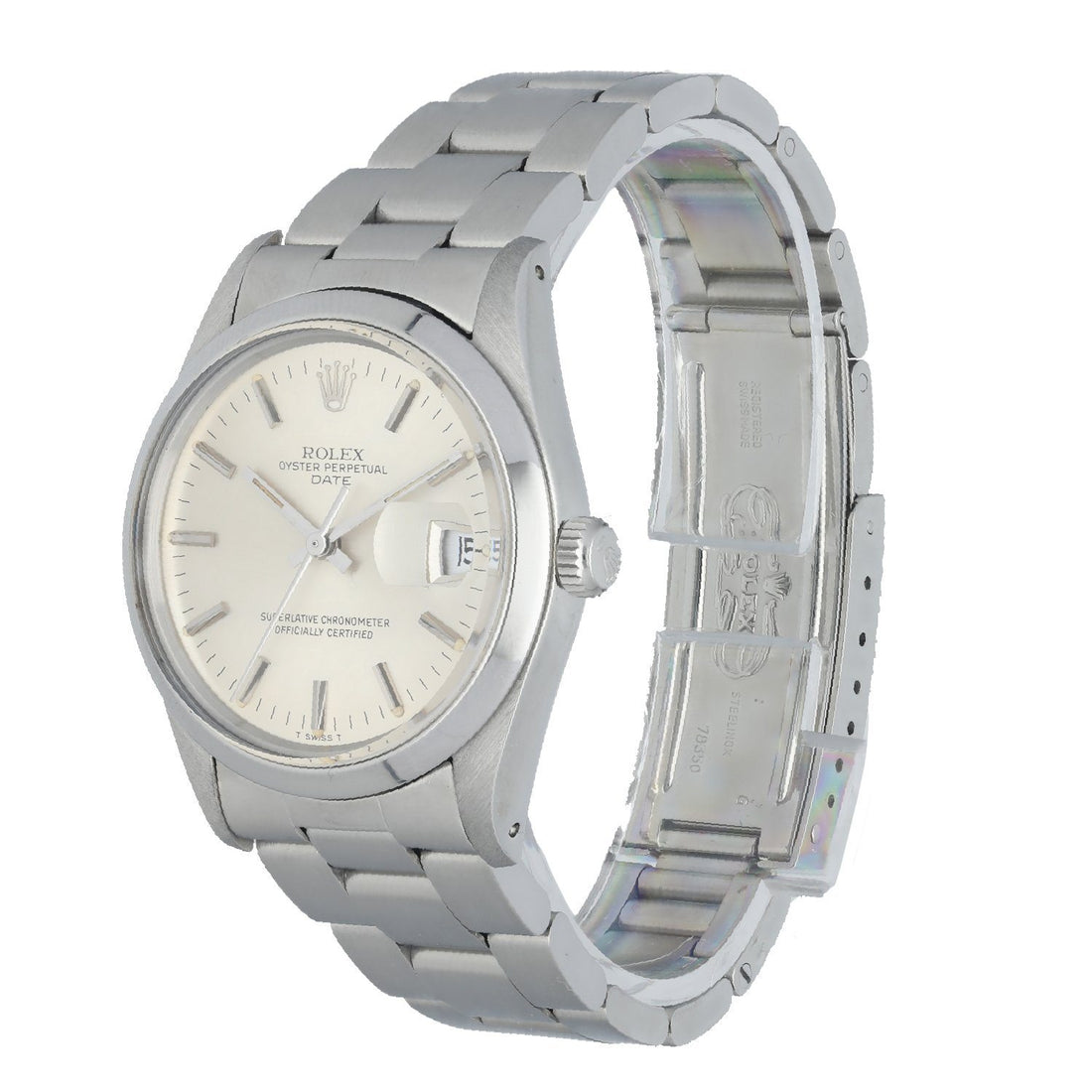 Rolex oyster perpetual Date 15000 Men's Watch. 34mm Stainless Steel case. Stainless Steel smooth bezel. Silver dial with steel hands and index hour markers. Date display at the 3 o'clock position. Stainless Steel Bracelet with Fold Over Clasp. Will fit up to a 7-inch wrist. Sapphire Crystal, Stainless steel case back. Calibre 1570 Automatic self-winding with a 48-hour power reserve.
