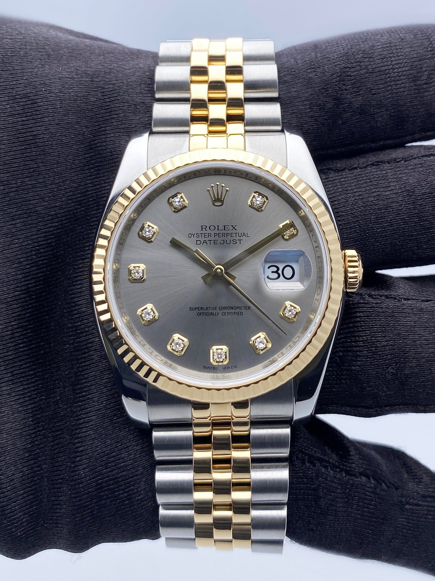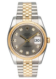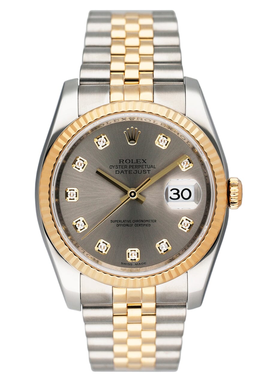 Rolex Oyster Perpetual Datejust 116233 Mens Watch. 36mm stainless steel case. 18K yellow gold fluted bezel. Champagne dial with gold hand and factory diamond markers. The date is displayed at the 3 o'clock position. 18K yellow gold and stainless steel Jubilee bracelet with hidden fold over clasp. Will fit up to a 7- Inch Wrist. Sapphire crystal. Stainless steel case back. Automatic self-winding movement.