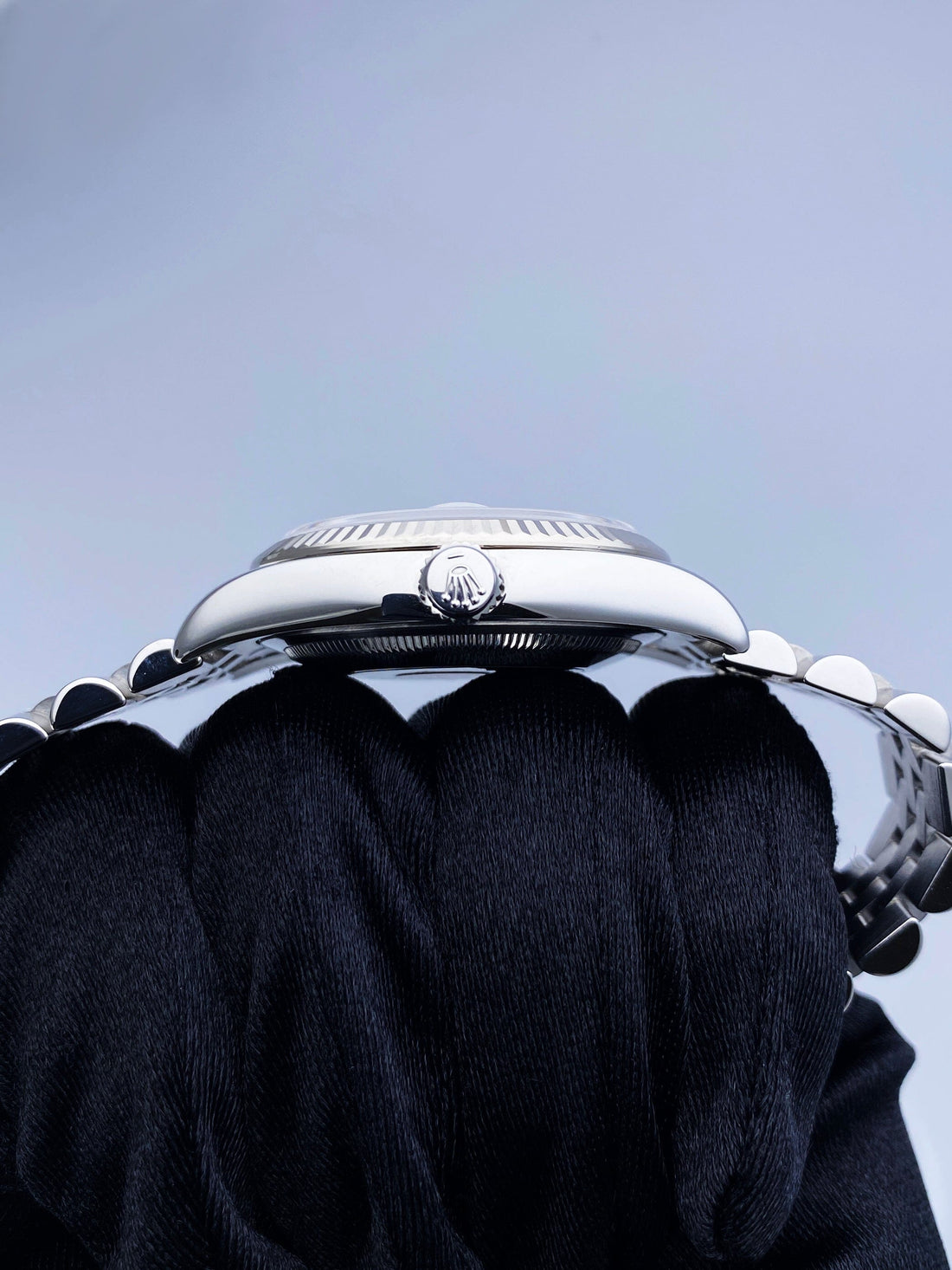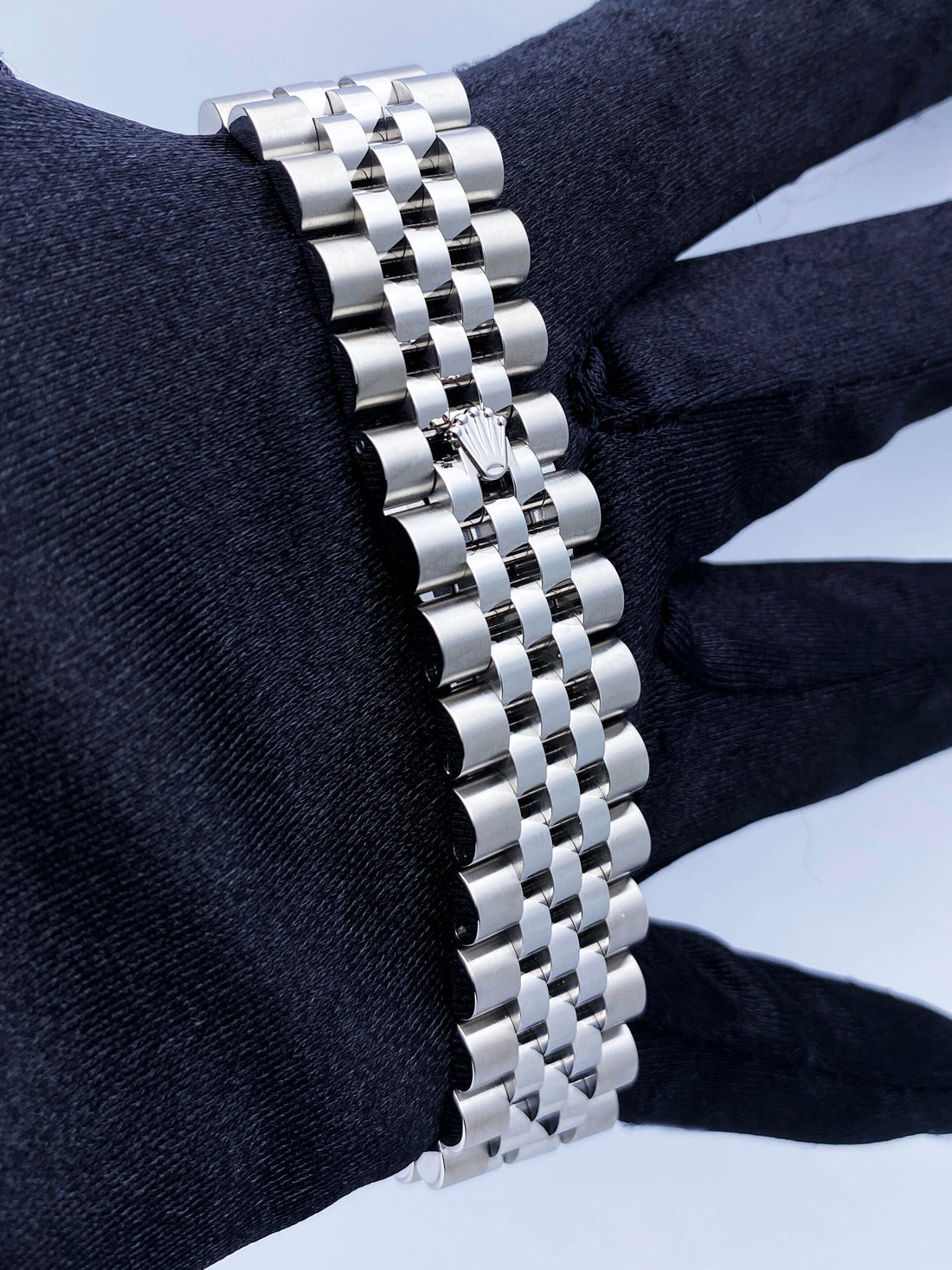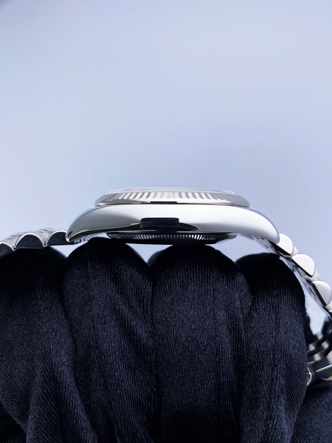 Rolex Oyster Perpetual Datejust 116234 Mens Watch. 36mm stainless steel case with 18K white gold fluted bezel. Silver dial with steel hands and index hour markers. Minute marker around the outer dial. Date display at 3 o'clock position. Stainless steel Jubilee bracelet with fold hidden fold over clasp. Will fit up to a 7-inch wrist. Sapphire crystal. Stainless steel case back. Calibre 3135 automatic self-winding movement with a 50 power reserve.