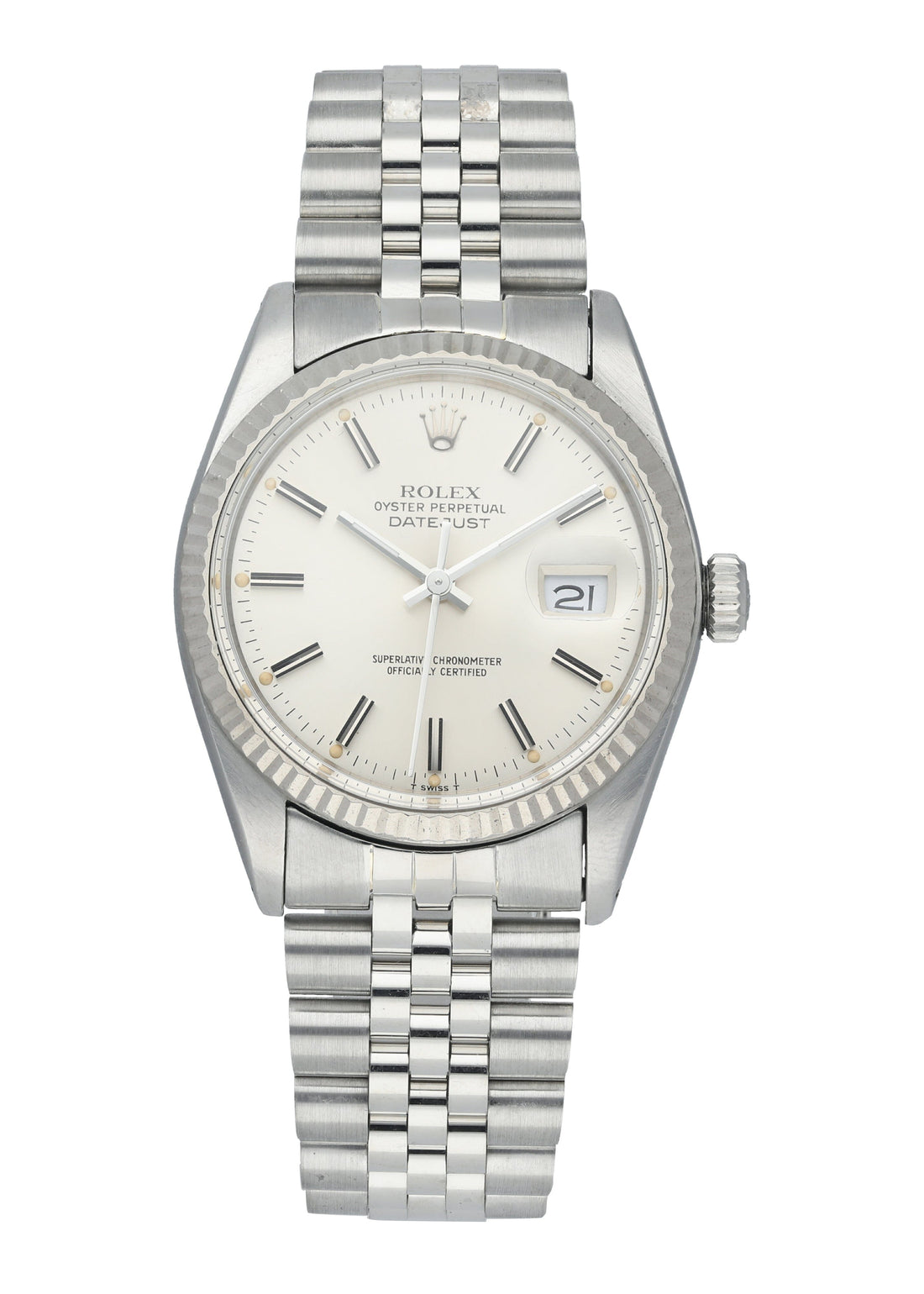 Rolex Oyster Perpetual Datejust 16014 Men's Watch. Stainless steel 36mm case with a white gold fluted bezel. Silver dial with steel hands and index hour markers. Stainless steel jubilee bracelet with a fold-over clasp. Will fit up to a 7-inch wrist. Automatic-self-wind 3035 chronometer movement with a 48-hour power reserve. Acrylic crystal glass. Circa:1979. This watch is backed by our two year warranty.