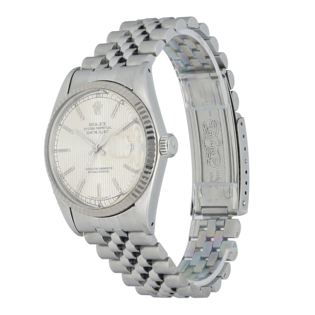 Rolex Oyster Perpetual Datejust 16014 Men's Watch 36mm Stainless Steel case. White Gold Stationary bezel. Silver dial with Luminous Steel hands and index hour markers. Minute markers on the outer dial. Date display at the 3 o'clock position. Stainless Steel Bracelet with Fold Over Clasp. Will fit up to a 7-inch wrist. Sapphire Crystal, Stainless steel case back. Calibre 3135 Automatic self-winding chronometer movement with a 48-hour power reserve.This watch is backed by our two year warranty.