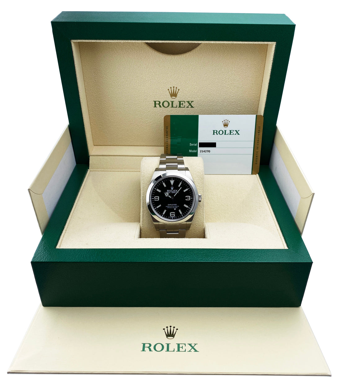 Rolex Oyster Perpetual Explorer 214270 Mens Watch. 39mm stainless steel case. Stainless steel smooth bezel. Black dial with luminous steel hands and index & Arabic numeral hour markers. Minute markers on the outer dial. Stainless steel Oyster bracelet with fold over clasp with safety. Will fit up to a 7-inch wrist. Sapphire crystal. Stainless steel case back. Automatic self-winding movement. This watch comes with original Box and Papers.