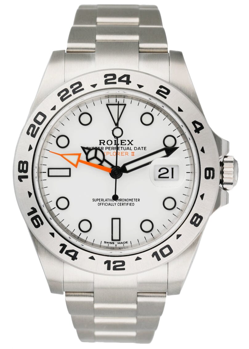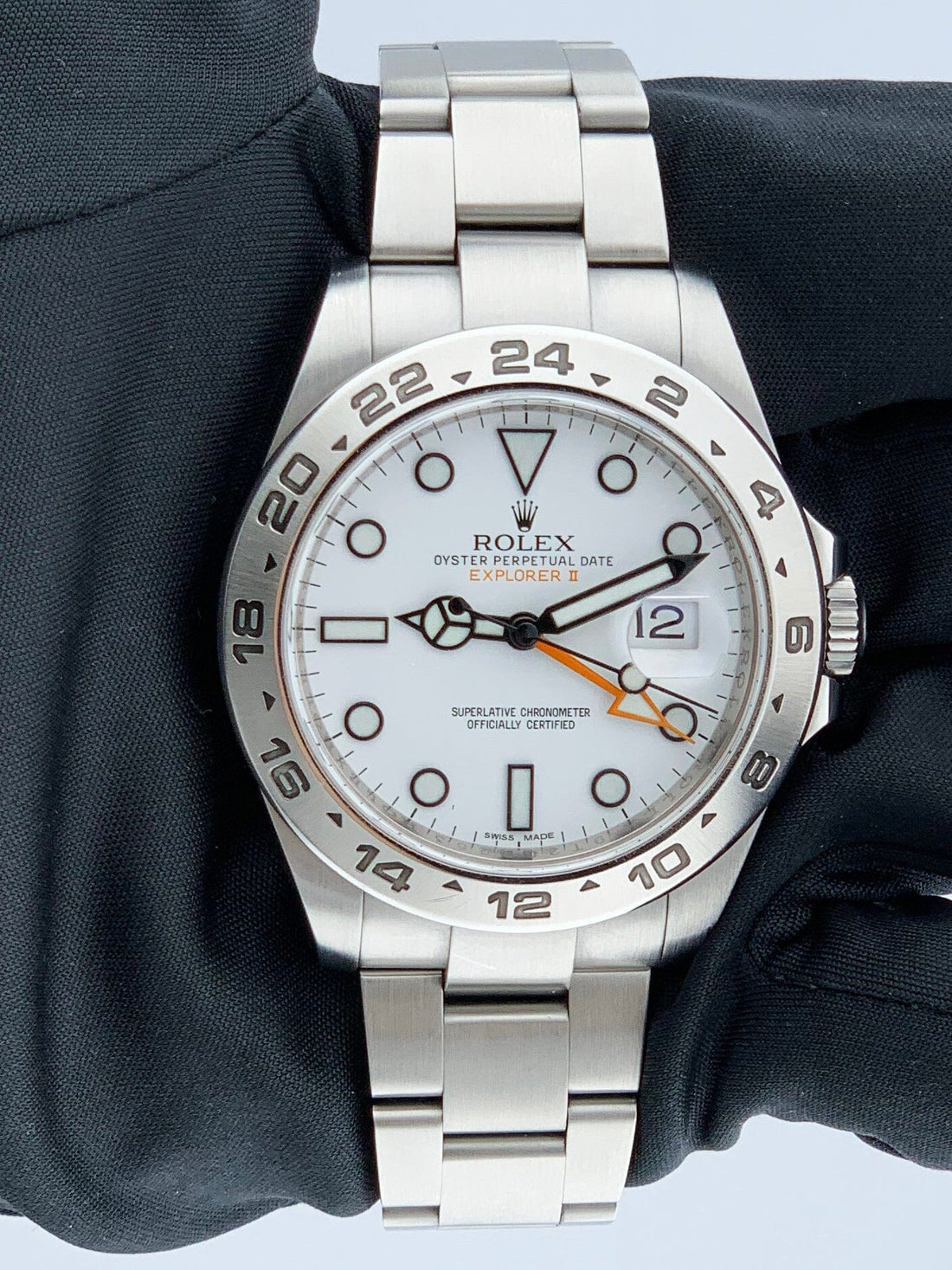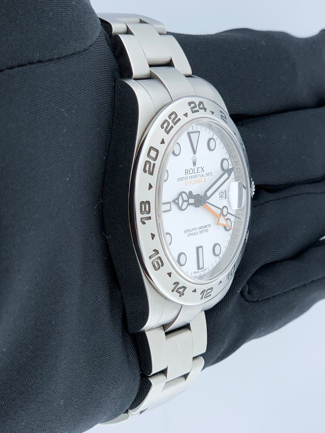 Rolex Oyster Perpetual Explorer II 216570 Mens Watch. 42mm stainless steel case. Stainless steel bezel with 24 hours black bezel insert. White dial with black steel luminous Mercedes hands and index hour markers. Magnified date display at 3 o'clock position. Stainless steel Oyster bracelet with fold over clasp with safety. Will fit up to a 7-inch wrist. Sapphire crystal. Stainless steel case back. Calibre 3187 automatic self-winding movement with a 50-hour power reserve. This watch comes with original Box and Papers.