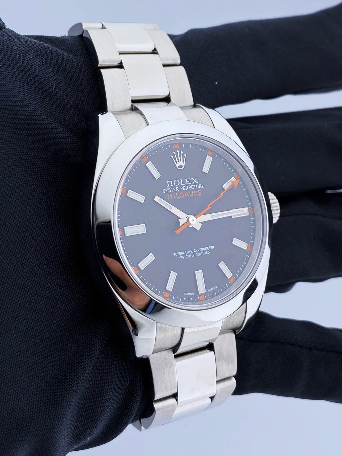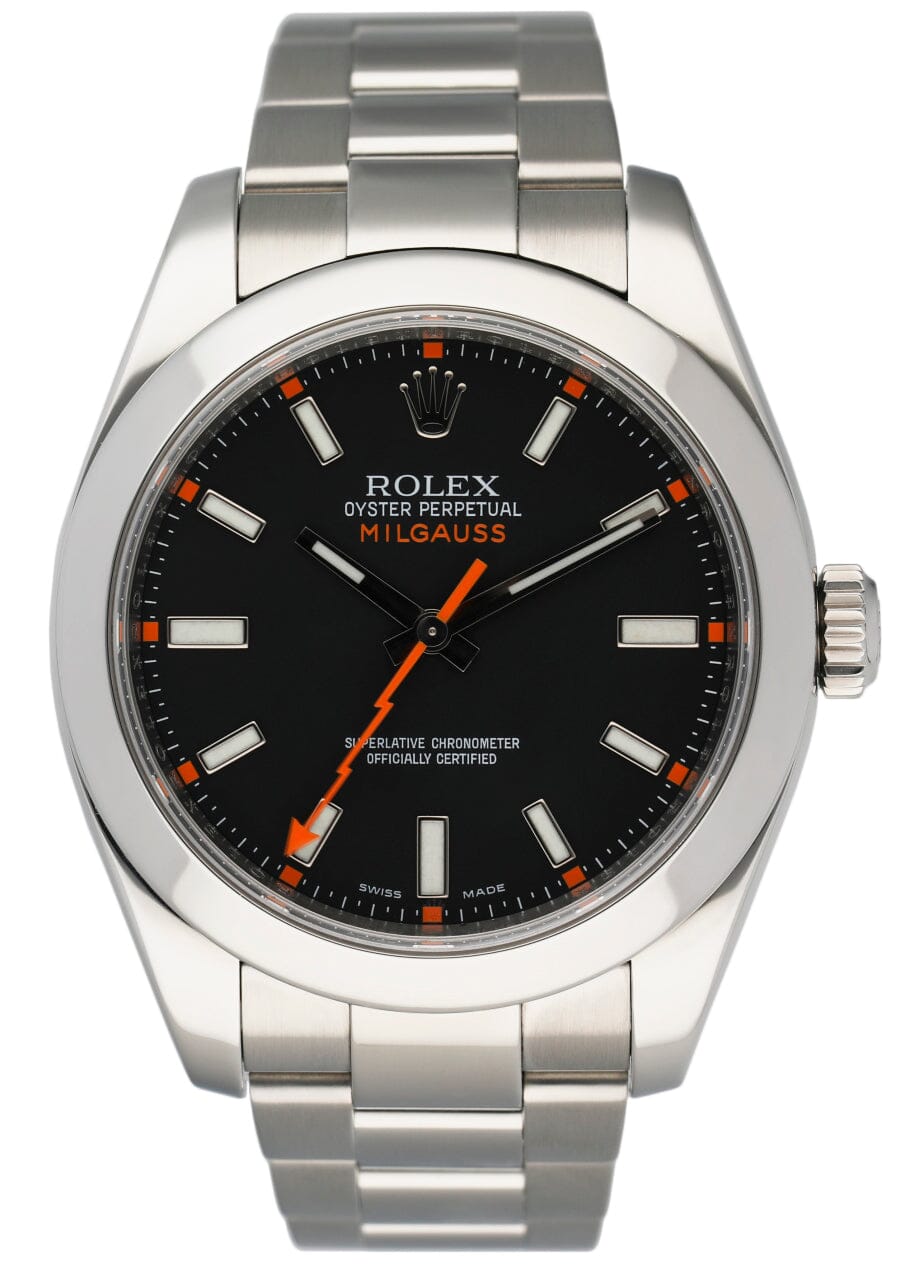 Rolex Oyster Perpetual Milgauss 116400 Mens Watch. 40mm stainless steel case and smooth bezel. Black dial with luminous silver-tone hands and index hour markers. Minute markers on the outer dial. Engraved rehaut. Stainless steel Oyster Bracelet with fold over clasp. Will fit up to a 7-inch wrist. Sapphire crystal. Automatic self-winding movement.