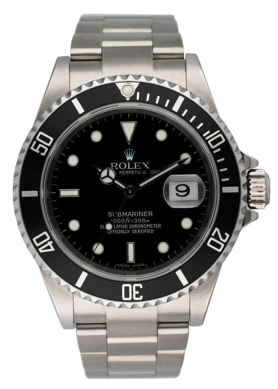 Rolex Oyster Perpetual Submariner 16610 mens watch. 40mm Stainless steel case. Unidirectional rotating stainless steel bezel with black bezel insert. Black dial with luminous hands and index hour marker. Date display by the 3 o'clock position. Stainless steel oyster bracelet with fold over clasp with safety. Will fit up to a 7-inch wrist. Sapphire crystal. Automatic self-wind movement. Circa:2006 This will come with Box and Papers.