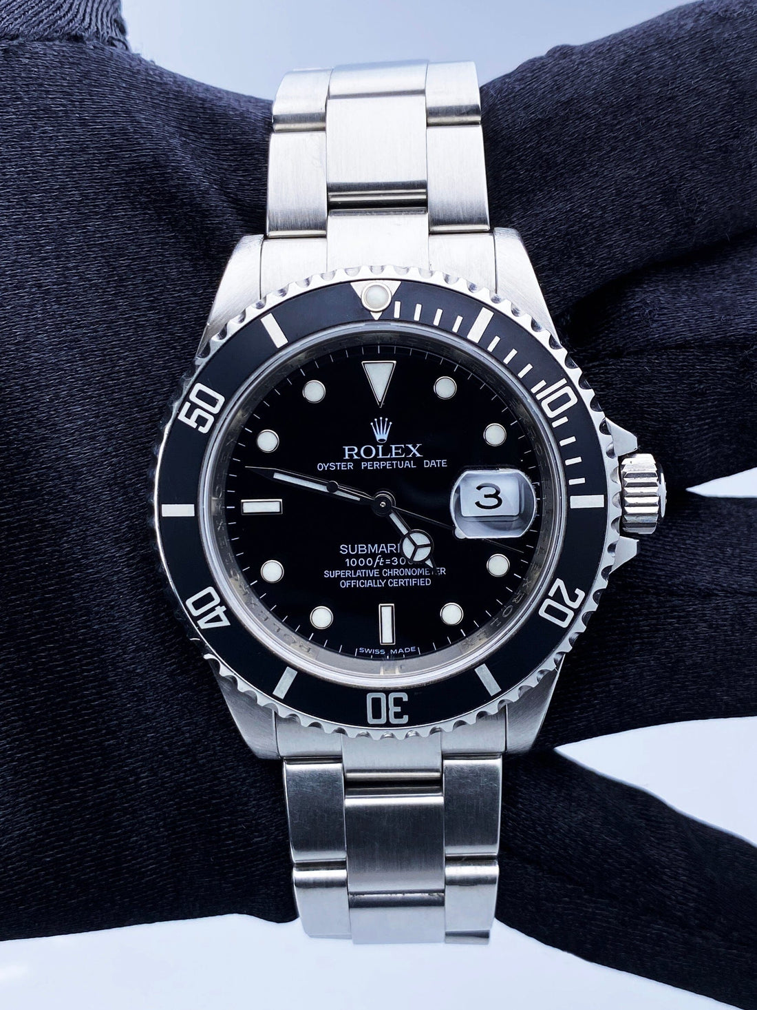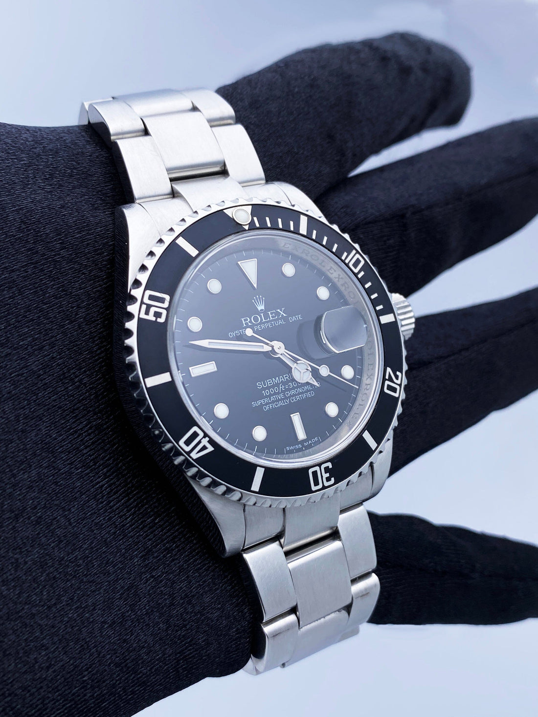 Rolex Oyster Perpetual Date Submariner 16610 Mens Watch. 40mm stainless steel case. Unidirectional rotating stainless steel bezel with black insert. Black dial with steel luminous hands and markers. Engraved rehaut. Date display at 3 o'clock position. Engraved Rehaut. Stainless steel Oyster bracelet with fold over clasp with safety. Will fit up to a 6.75-inch wrist. Sapphire crystal. Stainless steel case back. Caliber 3135 automatic self-wind movement featuring a 48-hour power reserve.