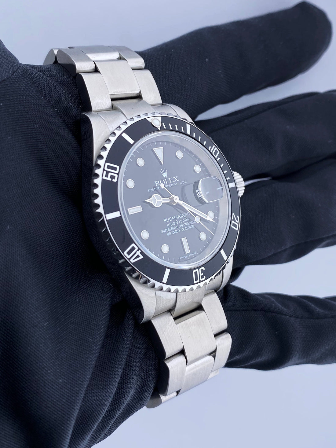 Rolex Oyster Perpetual Submariner 16610 Mens Watch. 40mm stainless steel case. Unidirectional rotating stainless steel bezel with black insert. Black dial with steel luminous hands and markers. Date aperture by the 3 o'clock position. Stainless steel bracelet with fold over clasp with safety. Will fit up to a 7-inch wrist. Calibre 3135 automatic self-wind movement featuring a 48-hour power reserve. Sapphire crystal. Water resistance 300M.