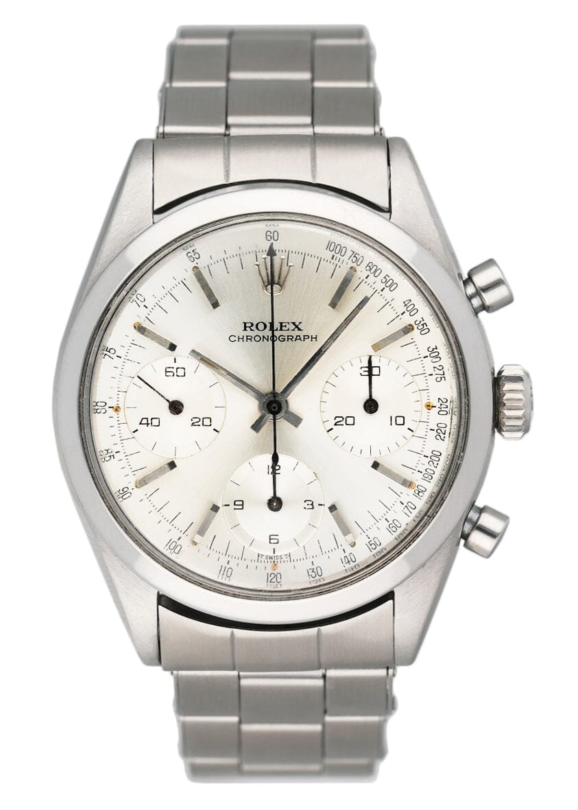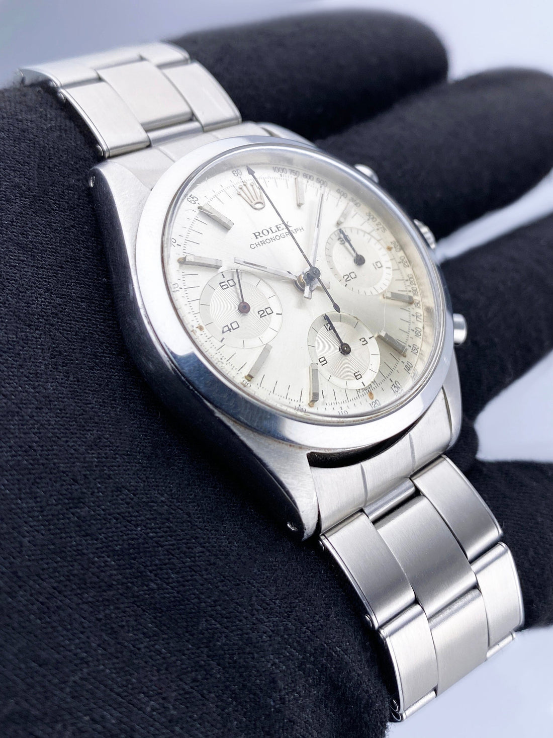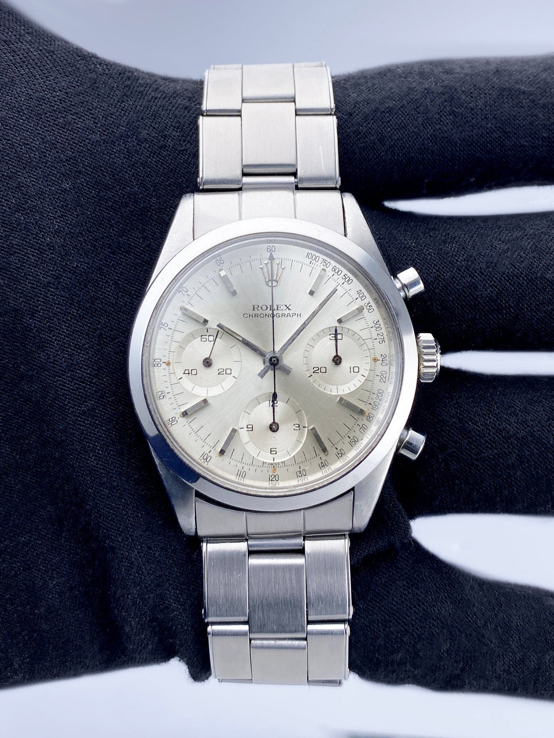 Rolex Pre Daytona 6268 Mens Watch. 37mm stainless steel case. Stainless steel smoothed bezel. Silver dial with steel hands and index hour markers. Tachymetric scale on the outer dial. Three sub-dials. Small seconds hand at 9 o'clock. 30-minute counter at 3 o'clock. 12-hour counter at 6 o'clock. Stainless steel Oyster bracelet with fold over clasp. Will fit up to a 6.75-inch wrist. Acrylic crystal. Stainless steel case back. Automatic self-winding movement.