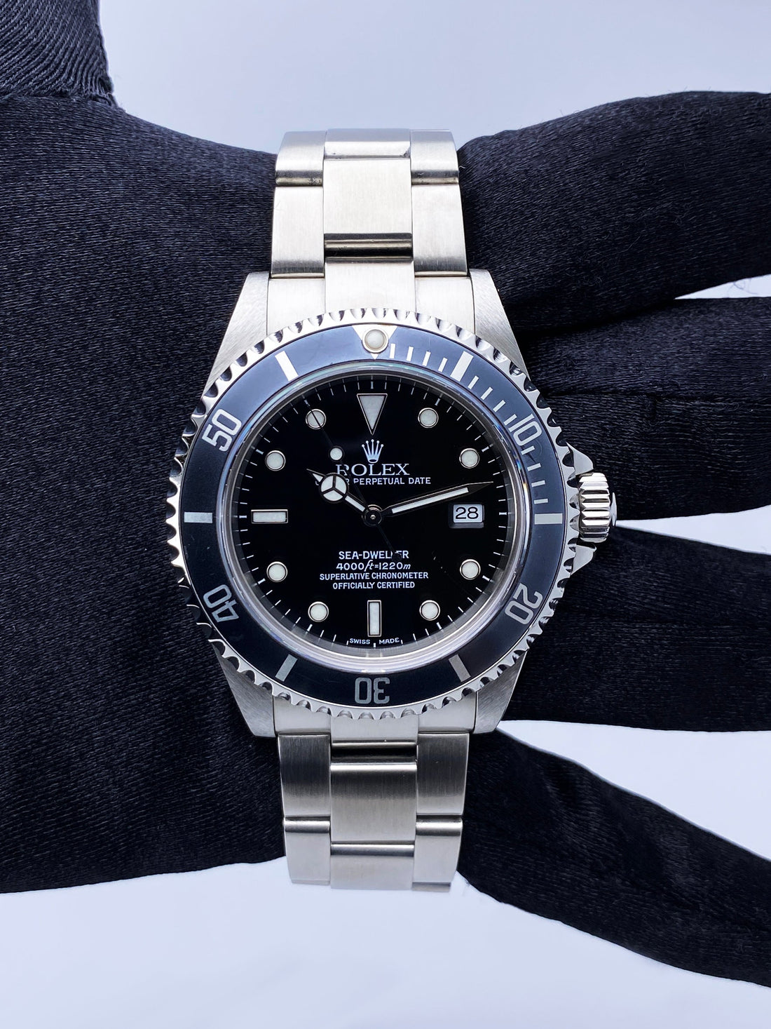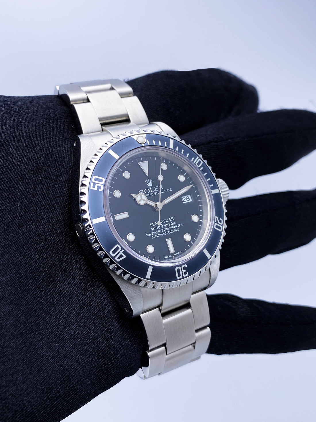 Rolex Oyster Perpetual Date Sea-Dweller 16600 Mens Watch. 40mm stainless steel case. Unidirectional rotating stainless steel bezel with blue insert. Black dial with luminous Mercedes steel hands and index hour marker. Date display by the 3 o'clock position. Stainless steel Oyster bracelet with fold over clasp with safety. Will fit up to a 7-inch wrist. Sapphire crystal. Stainless steel case back. Automatic self-winding movement. Circa:2002.